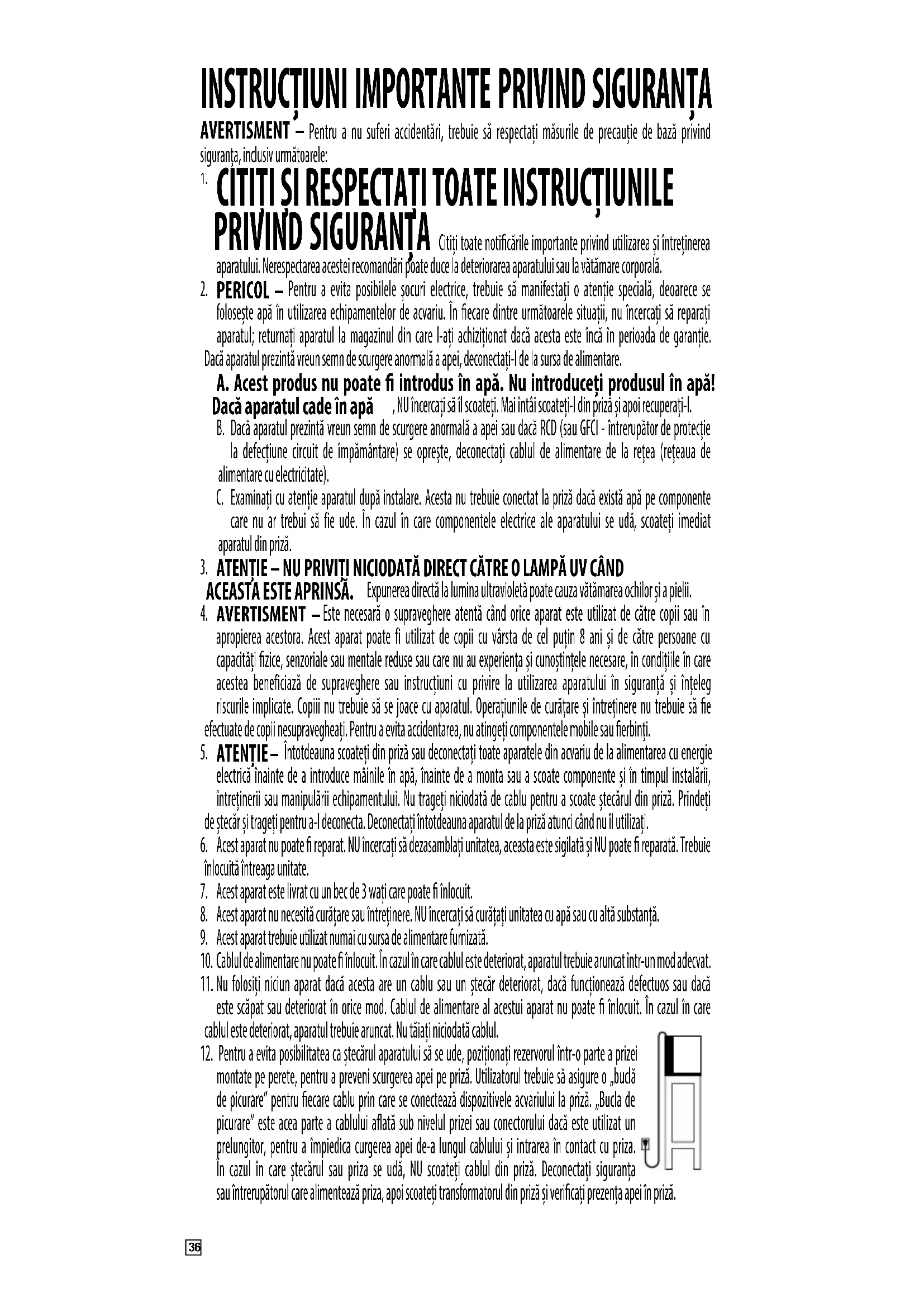 - Pentru a evita posibilitatea ca stecarul aparatului sa se ude, poziotionati rezervorul intr-o parte a prizei montate pe perete, pentru a preveni scurgerea apei pe priza. Utilizatorul trebuie sa asigure o bula de picurare" pentru ficare cablu prin care se conecteza dispositivele acvariului la priza. Bucla de picurare" este acea parte a cablului aflata sub nivelul prizei tau conectorului dacă este/utilizat un prelimgitor, pentru a impiedica curgeea apei de-a lungul cablului si intrarea in contact cu priza. In cazul in care stecarul Sau priza se udă, NU scoatei cablul din priza. Deconnectati siguranta sau intrerupatorul care alimenteaza priza, apoi scoatei transformatorul din priza si verificatj prezenta ape