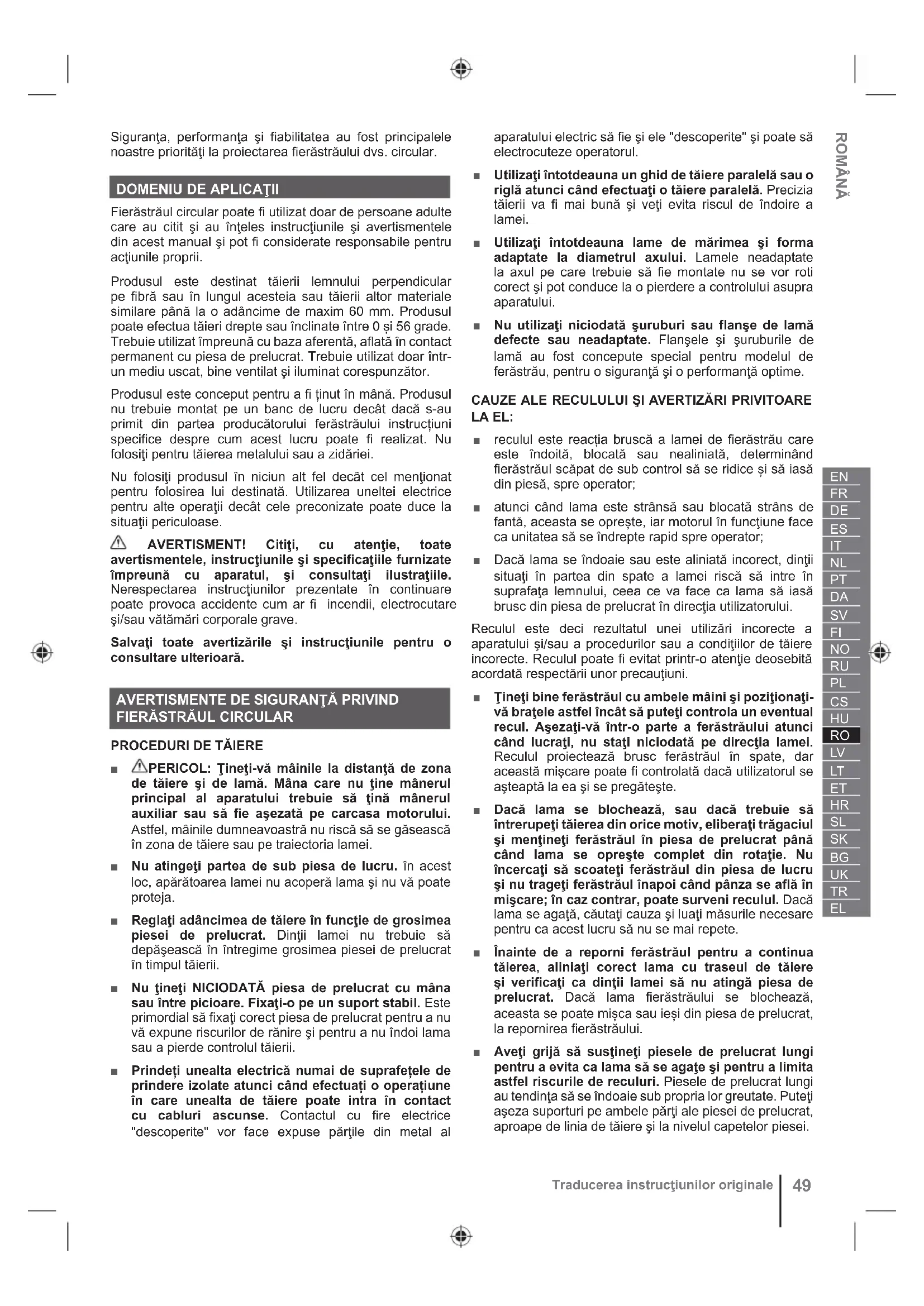 ■ PERICOL: Ţineţi-vă mâinile la distanţă de zona de tăiere şi de lamă. Mâna care nu ţine mânerul principal al aparatului trebuie să ţină mânerul auxiliar sau să fie aşezată pe carcasa motorului. Astfel, mâinile dumneavoastră nu riscă să se găsească în zona de tăiere sau pe traiectoria lamei. ■ Nu atingeţi partea de sub piesa de lucru. în acest loc, apărătoarea lamei nu acoperă lama şi nu vă poate proteja. ■ Reglaţi adâncimea de tăiere în funcţie de grosimea piesei de prelucrat. Dinţii lamei nu trebuie să depăşească în întregime grosimea piesei de prelucrat în timpul tăierii. ■ Nu ţineţi NICIODATĂ piesa de prelucrat cu mâna sau între picioare. Fixaţi-o pe un suport stabil. Este primordial să fixaţi corect piesa de prelucrat pentru a nu vă expune riscurilor de rănire şi pentru a nu îndoi lama sau a pierde controlul tăierii. ■ Prindeți unealta electrică numai de suprafețele de prindere izolate atunci când efectuați o operațiune în care unealta de tăiere poate intra în contact cu cabluri ascunse. Contactul cu fire electrice "descoperite" vor face expuse părţile din metal al aparatului electric să fie şi ele "descoperite" şi poate să electrocuteze operatorul. ■ Utilizaţi întotdeauna un ghid de tăiere paralelă sau o riglă atunci când efectuaţi o tăiere paralelă. Precizia tăierii va fi mai bună şi veţi evita riscul de îndoire a lamei. ■ Utilizaţi întotdeauna lame de mărimea şi forma adaptate la diametrul axului. Lamele neadaptate la axul pe care trebuie să fie montate nu se vor roti corect şi pot conduce la o pierdere a controlului asupra aparatului. ■ Nu utilizaţi niciodată şuruburi sau flanşe de lamă defecte sau neadaptate. Flanşele şi şuruburile de lamă au fost concepute special pentru modelul de ferăstrău, pentru o siguranţă şi o performanţă optime. CAUZE ALE RECULULUI ŞI AVERTIZĂRI PRIVITOARE LA EL: ■ reculul este reacția bruscă a lamei de fierăstrău care este îndoită, blocată sau nealiniată, determinând fierăstrăul scăpat de sub control să se ridice și să iasă din piesă, spre operator; ■ atunci când lama este strânsă sau blocată strâns de fantă, aceasta se oprește, iar motorul în funcţiune face ca unitatea să se îndrepte rapid spre operator; ■ Dacă lama se îndoaie sau este aliniată incorect, dinţii situaţi în partea din spate a lamei riscă să intre în suprafaţa lemnului, ceea ce va face ca lama să iasă brusc din piesa de prelucrat în direcţia utilizatorului. Reculul este deci rezultatul unei utilizări incorecte a aparatului şi/sau a procedurilor sau a condiţiilor de tăiere incorecte. Reculul poate fi evitat printr-o atenţie deosebită acordată respectării unor precauţiuni. ■ Ţineţi bine ferăstrăul cu ambele mâini şi poziţionaţi- vă braţele astfel încât să puteţi controla un eventual recul. Aşezaţi-vă într-o parte a ferăstrăului atunci când lucraţi, nu staţi niciodată pe direcţia lamei. Reculul proiectează brusc ferăstrăul în spate, dar această mişcare poate fi controlată dacă utilizatorul se aşteaptă la ea şi se pregăteşte. ■ Dacă lama se blochează, sau dacă trebuie să întrerupeţi tăierea din orice motiv, eliberaţi trăgaciul şi menţineţi ferăstrăul în piesa de prelucrat până când lama se opreşte complet din rotaţie. Nu încercaţi să scoateţi ferăstrăul din piesa de lucru şi nu trageţi ferăstrăul înapoi când pânza se află în mişcare; în caz contrar, poate surveni reculul. Dacă lama se agaţă, căutaţi cauza şi luaţi măsurile necesare pentru ca acest lucru să nu se mai repete. ■ Înainte de a reporni ferăstrăul pentru a continua tăierea, aliniaţi corect lama cu traseul de tăiere şi verificaţi ca dinţii lamei să nu atingă piesa de prelucrat. Dacă lama fierăstrăului se blochează, aceasta se poate mișca sau ieși din piesa de prelucrat, la repornirea fierăstrăului. ■ Aveţi grijă să susţineţi piesele de prelucrat lungi pentru a evita ca lama să se agaţe şi pentru a limita astfel riscurile de reculuri. Piesele de prelucrat lungi au tendinţa să se îndoaie sub propria lor greutate. Puteţi aşeza suporturi pe ambele părţi ale piesei de prelucrat, aproape de linia de tăiere şi la nivelul capetelor piesei. ROMÂNĂ