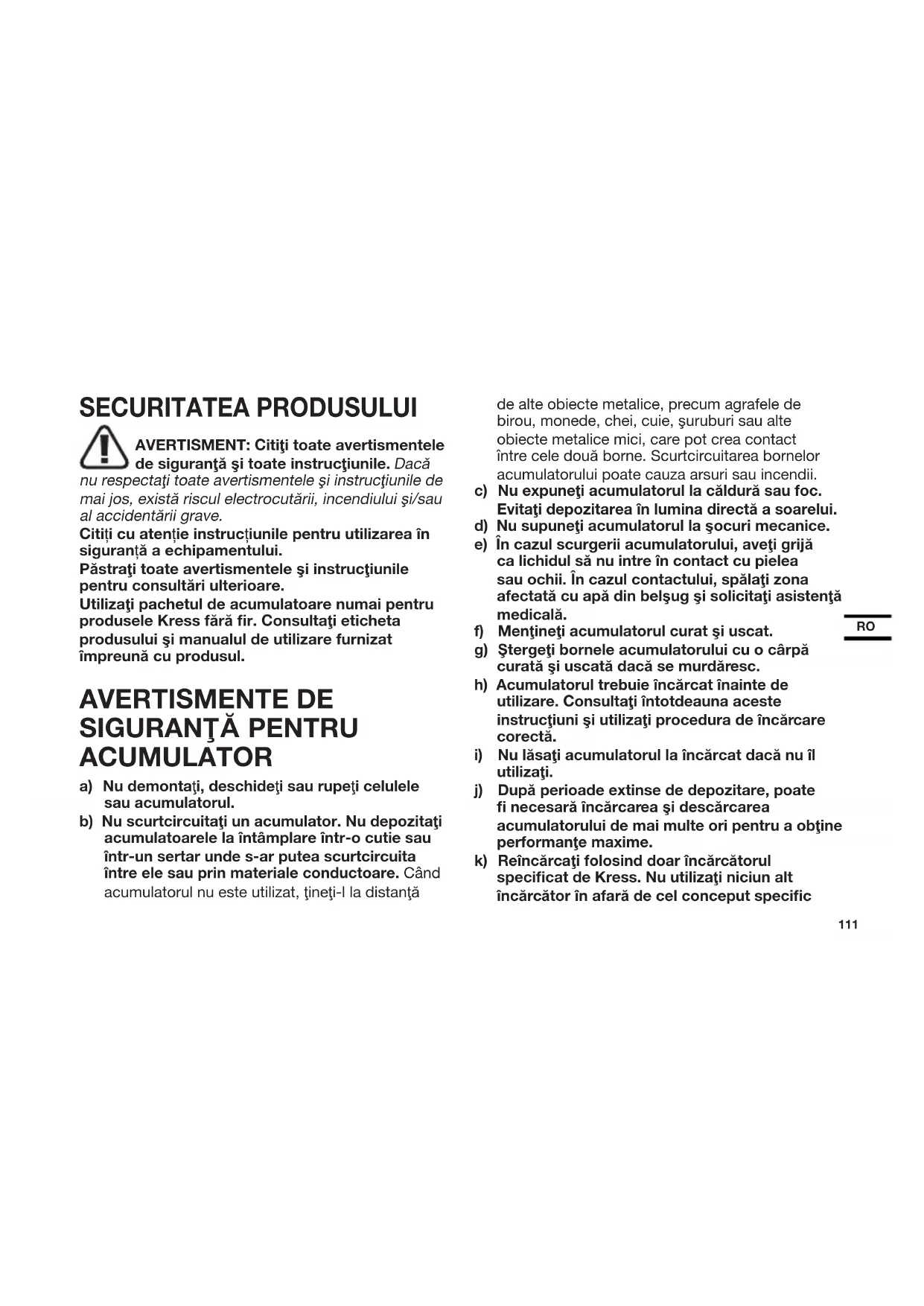 SECURITATEA PRODUSULUI AVERTISMENT: Citiţi toate avertismentele de siguranţă şi toate instrucţiunile. Dacă nu respectaţi toate avertismentele şi instrucţiunile de mai jos, există riscul electrocutării, incendiului şi/sau al accidentării grave. Citiți cu atenție instrucțiunile pentru utilizarea în siguranță a echipamentului. Păstraţi toate avertismentele şi instrucţiunile pentru consultări ulterioare. Utilizaţi pachetul de acumulatoare numai pentru produsele Kress fără fir. Consultaţi eticheta produsului şi manualul de utilizare furnizat împreună cu produsul. AVERTISMENTE DE SIGURANŢĂ PENTRU ACUMULATOR a) Nu demontaţi, deschideţi sau rupeţi celulele sau acumulatorul. b) Nu scurtcircuitaţi un acumulator. Nu depozitaţi acumulatoarele la întâmplare într-o cutie sau într-un sertar unde s-ar putea scurtcircuita între ele sau prin materiale conductoare. Când acumulatorul nu este utilizat, ţineţi-l la distanţă de alte obiecte metalice, precum agrafele de birou, monede, chei, cuie, şuruburi sau alte obiecte metalice mici, care pot crea contact între cele două borne. Scurtcircuitarea bornelor acumulatorului poate cauza arsuri sau incendii. c) Nu expuneţi acumulatorul la căldură sau foc. Evitaţi depozitarea în lumina directă a soarelui. d) Nu supuneţi acumulatorul la şocuri mecanice. e) În cazul scurgerii acumulatorului, aveţi grijă ca lichidul să nu intre în contact cu pielea sau ochii. În cazul contactului, spălaţi zona afectată cu apă din belşug şi solicitaţi asistenţă medicală. f) Menţineţi acumulatorul curat şi uscat. g) Ştergeţi bornele acumulatorului cu o cârpă curată şi uscată dacă se murdăresc. h) Acumulatorul trebuie încărcat înainte de utilizare. Consultaţi întotdeauna aceste instrucţiuni şi utilizaţi procedura de încărcare corectă.