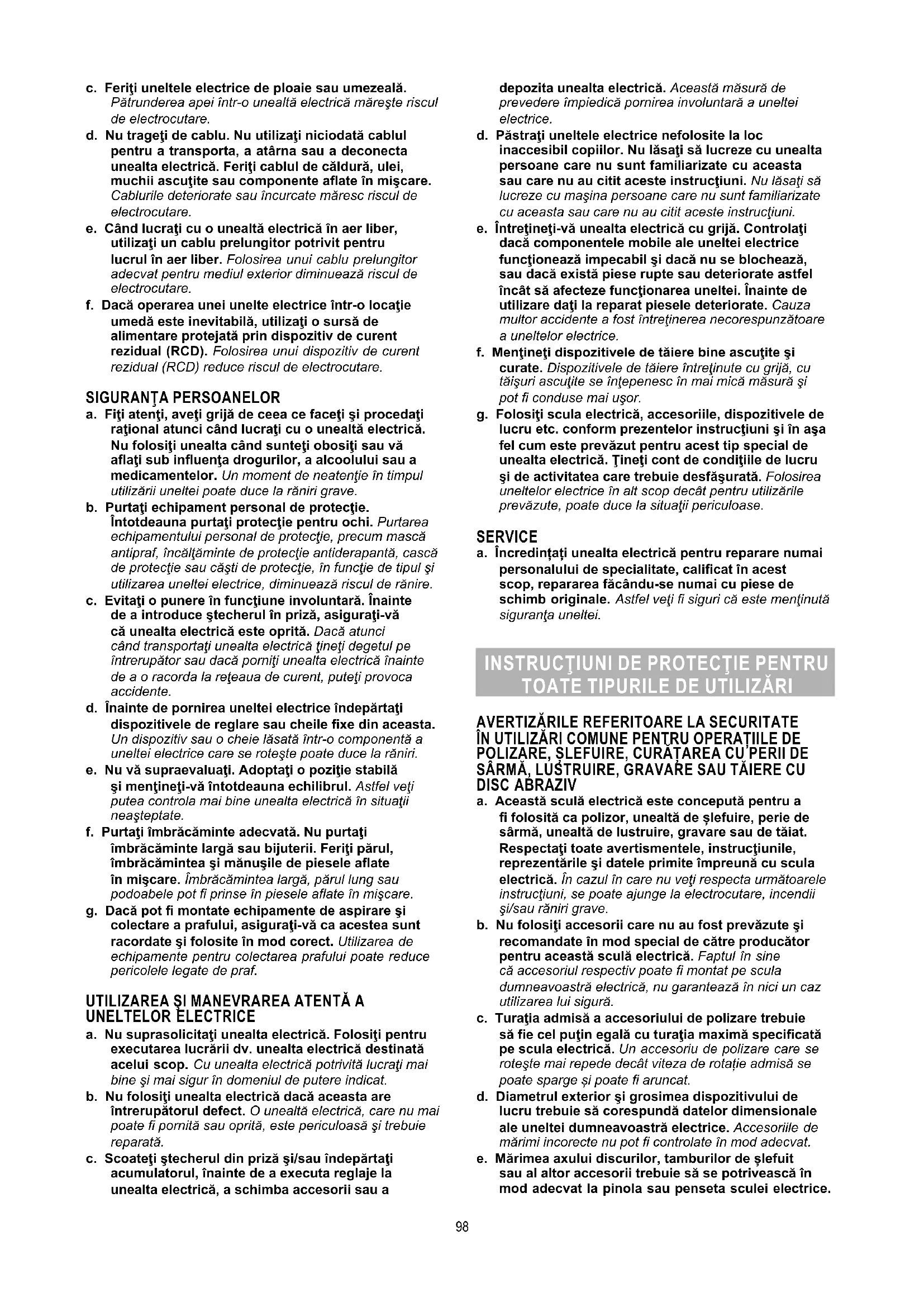 ATENŢIE CITIŢI TOATE INSTRUCŢIUNILE DE SIGURANŢĂ ŞI DE UTILIZARE Nerespectarea acestor instrucţiuni poate duce la electrocutare, incendiu şi/sau accidente grave. Păstraţi instrucţiunile pentru referinţe ulterioare. Termenul „unealtă electrică” din aceste instrucţiuni se referă la unealta electrică alimentată de la reţea (prin cablu de alimentare) sau la acumulatorii (fără cablu) de care dispuneţi.