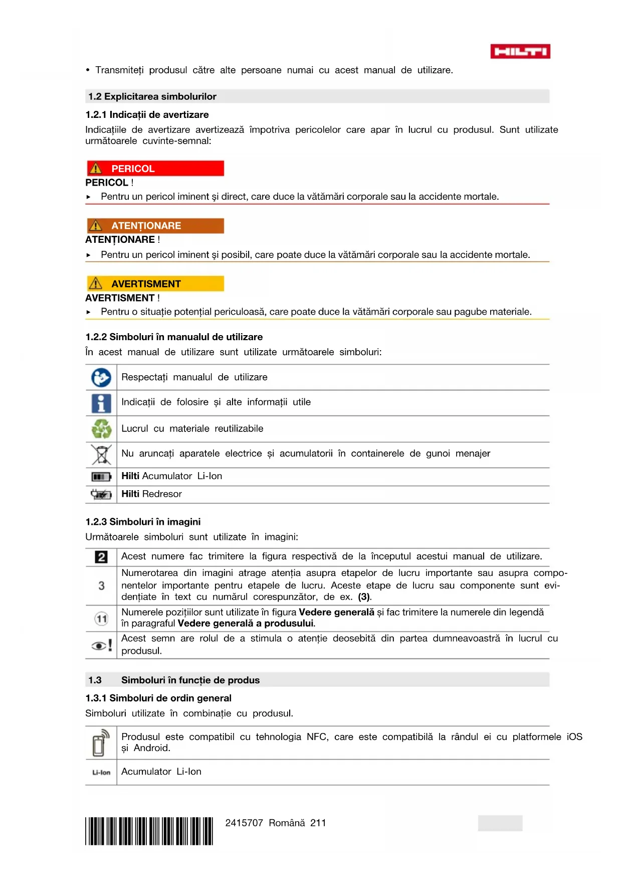 - Manualul de utilizare anexat corespunde stadiului tehnologic actual la momentul tipăririi. Găsiți întotdeauna cea mai recentă versiune online pe pagina de produs Hilti. În acest scop, urmați linkul sau codul QR din acest manual de utilizare, marcat cu simbolul .*2415707* 2415707 Română 211