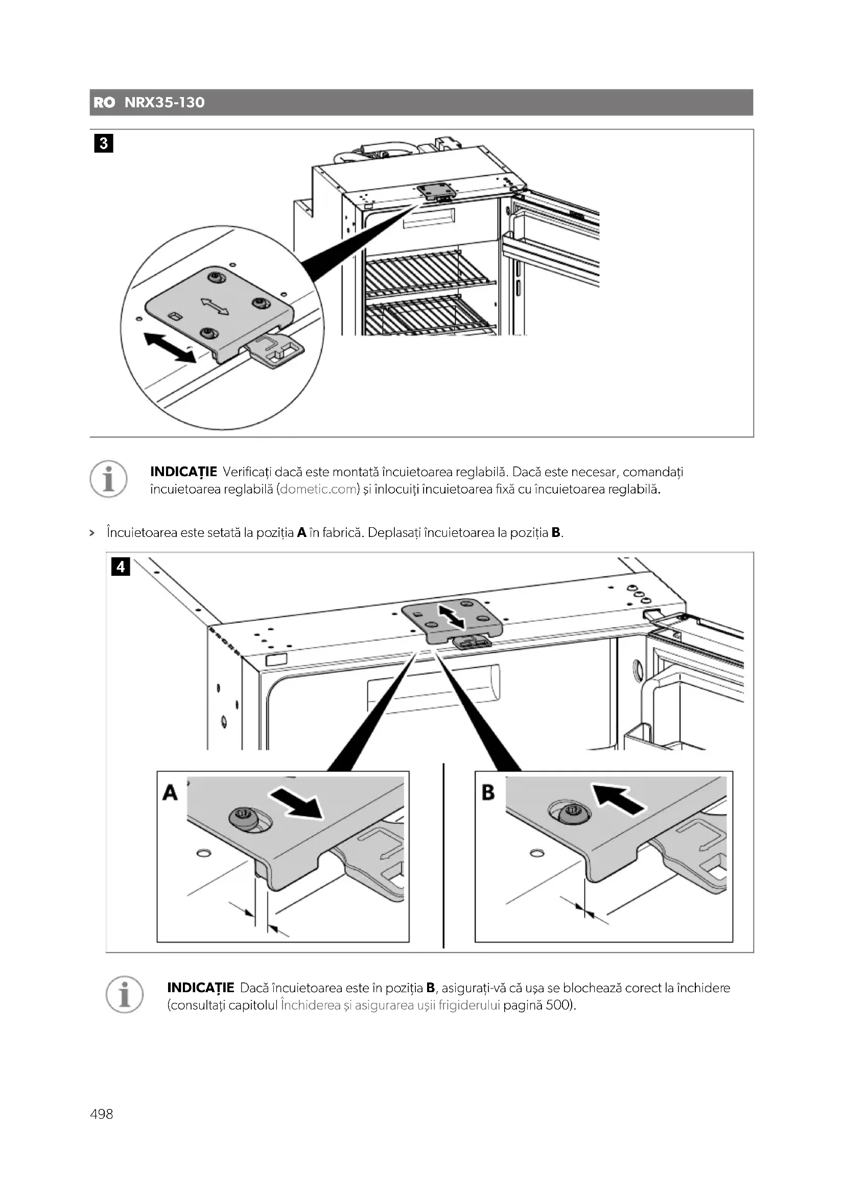 INDICAŢIE Dacă încuietoarea este în poziţia B, asiguraţi-vă că uşa se blochează corect la închidere (consultaţi capitolul Închiderea şi asigurarea uşii frigiderului pagină500).