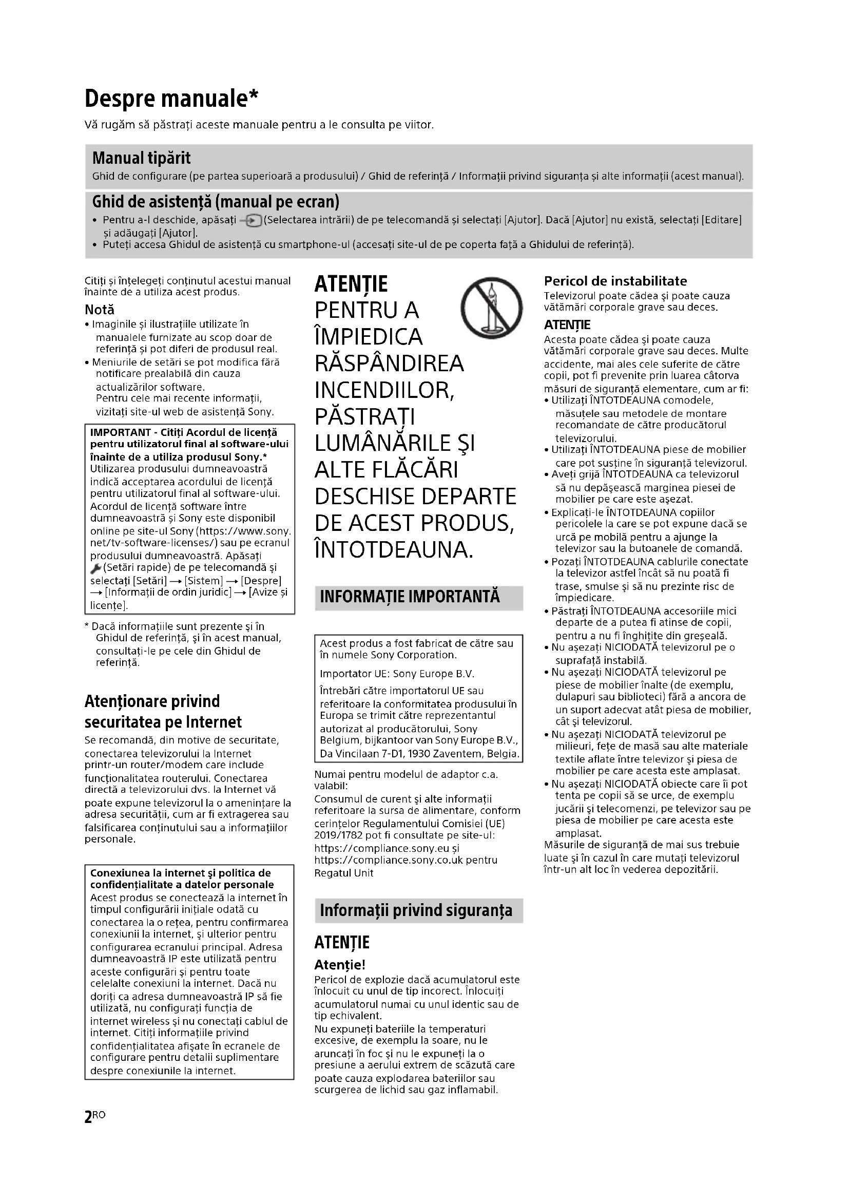 DESCHISE DEPARTE DE ACEST PRODUS, ÎNTOTDEAUNA. Numai pentru modelul de adaptor c.a. valabil:Consumul de curent şi alte informaţii referitoare la sursa de alimentare, conform cerinţelor Regulamentului Comisiei (UE) 2019/1782 pot fi consultate pe site-ul:https://compliance.sony.eu șihttps://compliance.sony.co.uk pentru Regatul Unit ATENŢIE Atenţie! Pericol de explozie dacă acumulatorul este înlocuit cu unul de tip incorect. Înlocuiți acumulatorul numai cu unul identic sau de tip echivalent.Nu expuneţi bateriile la temperaturi excesive, de exemplu la soare, nu le aruncaţi în foc şi nu le expuneţi la o presiune a aerului extrem de scăzută care poate cauza explodarea bateriilor sau scurgerea de lichid sau gaz inflamabil. Pericol de instabilitate Televizorul poate cădea şi poate cauza vătămări corporale grave sau deces. ATENŢIE Acesta poate cădea şi poate cauza vătămări corporale grave sau deces. Multe accidente, mai ales cele suferite de către copii, pot fi prevenite prin luarea câtorva măsuri de siguranţă elementare, cum ar fi:• Utilizaţi ÎNTOTDEAUNA comodele, măsuţele sau metodele de montare recomandate de către producătorul televizorului.• Utilizaţi ÎNTOTDEAUNA piese de mobilier care pot susţine în siguranţă televizorul.• Aveţi grijă ÎNTOTDEAUNA ca televizorul să nu depăşească marginea piesei de mobilier pe care este aşezat.• Explicaţi-le ÎNTOTDEAUNA copiilor pericolele la care se pot expune dacă se urcă pe mobilă pentru a ajunge la televizor sau la butoanele de comandă.• Pozaţi ÎNTOTDEAUNA cablurile conectate la televizor astfel încât să nu poată fi trase, smulse şi să nu prezinte risc de împiedicare.• Păstrați ÎNTOTDEAUNA accesoriile mici departe de a putea fi atinse de copii, pentru a nu fi înghițite din greșeală.• Nu aşezaţi NICIODATĂ televizorul pe o suprafaţă instabilă.• Nu aşezaţi NICIODATĂ televizorul pe piese de mobilier înalte (de exemplu, dulapuri sau biblioteci) fără a ancora de un suport adecvat atât piesa de mobilier, cât şi televizorul.• Nu aşezaţi NICIODATĂ televizorul pe milieuri, feţe de masă sau alte materiale textile aflate între televizor şi piesa de mobilier pe care acesta este amplasat.• Nu aşezaţi NICIODATĂ obiecte care îi pot tenta pe copii să se urce, de exemplu jucării şi telecomenzi, pe televizor sau pe piesa de mobilier pe care acesta este amplasat.Măsurile de siguranţă de mai sus trebuie luate şi în cazul în care mutaţi televizorul într-un alt loc în vederea depozitării. Despre manuale* Vă rugăm să păstraţi aceste manuale pentru a le consulta pe viitor. Manual tipărit Ghid de configurare (pe partea superioară a produsului) / Ghid de referință / Informații privind siguranța și alte informații (acest manual). Ghid de asistenţă (manual pe ecran)