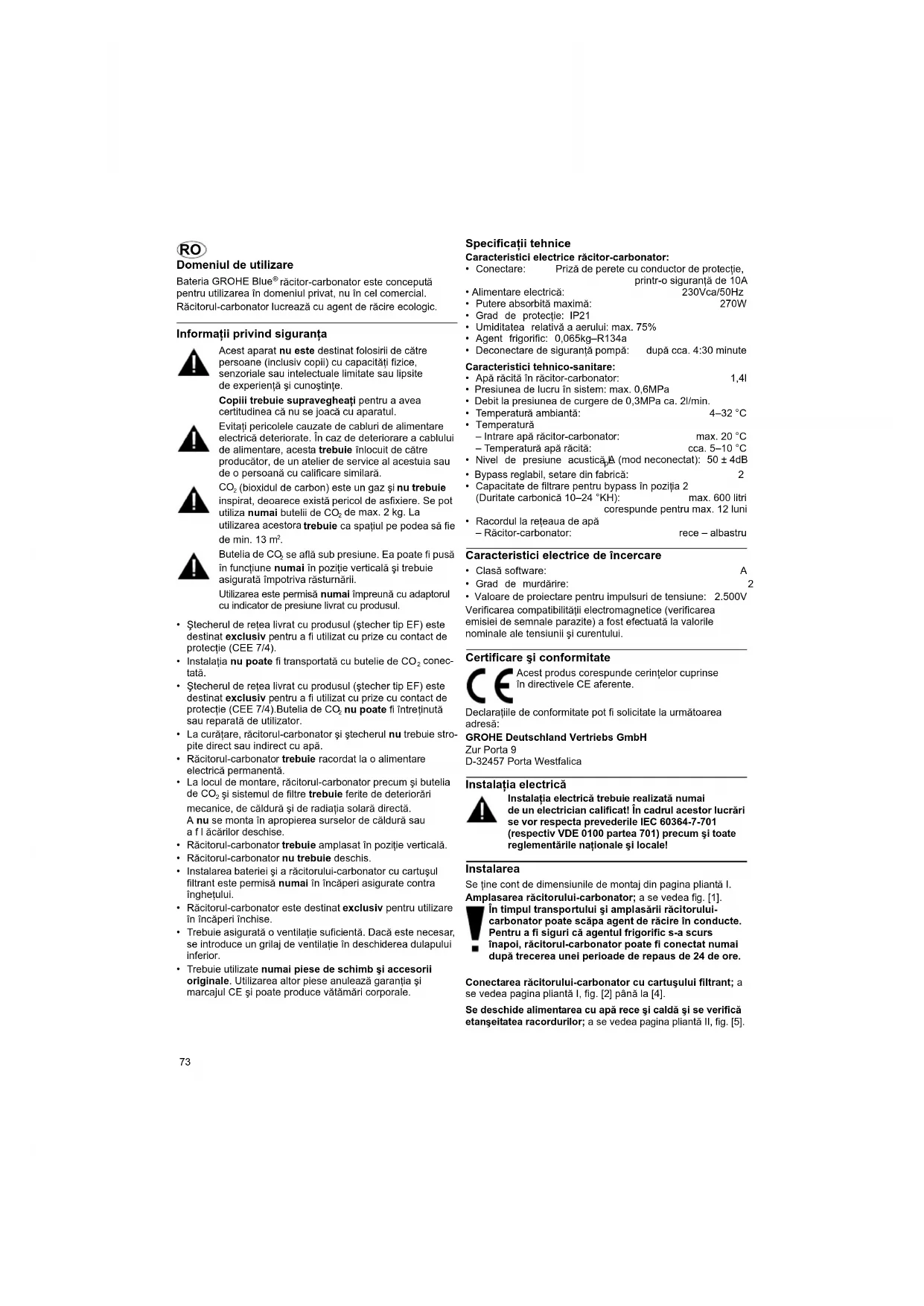 - Valoare de proiectare pentru impulsuri de tensiune: 2.500V Verificarea compatibilităţii electromagnetice (verificarea emisiei de semnale parazite) a fost efectuată la valorile nominale ale tensiunii şi curentului. Certificare şi conformitate Declaraţiile de conformitate pot fi solicitate la următoarea adresă: GROHE Deutschland Vertriebs GmbH Zur Porta 9 D-32457 Porta Westfalica Instalaţia electrică Instalaţia electrică trebuie realizată numai de un electrician calificat! În cadrul acestor lucrări se vor respecta prevederile IEC 60364-7-701 (respectiv VDE 0100 partea 701) precum şi toate reglementările naţionale şi locale! Instalarea Se ţine cont de dimensiunile de montaj din pagina pliantă I. Amplasarea răcitorului-carbonator; a se vedea fig. [1]. În timpul transportului şi amplasării răcitorului- carbonator poate scăpa agent de răcire în conducte. Pentru a fi siguri că agentul frigorific s-a scurs înapoi, răcitorul-carbonator poate fi conectat numai după trecerea unei perioade de repaus de 24 de ore. Conectarea răcitorului-carbonator cu cartuşului filtrant; a se vedea pagina pliantă I, fig. [2] până la [4]. Se deschide alimentarea cu apă rece şi caldă şi se verifică etanşeitatea racordurilor; a se vedea pagina pliantă II, fig. [5]. Acest produs corespunde cerinţelor cuprinse în directivele CE aferente.74 Se realizează conexiunea între baterie şi răcitorul- carbonator; a se vedea fig. [6]. Realizarea alimentării electrice cu ajutorul ştecherului de reţea; a se vedea fig. [7]. Indicatorul de pe afişaj se aprinde şi capacitatea reziduală a filtrului este afişată în procente. Se conectează butelia de CO
