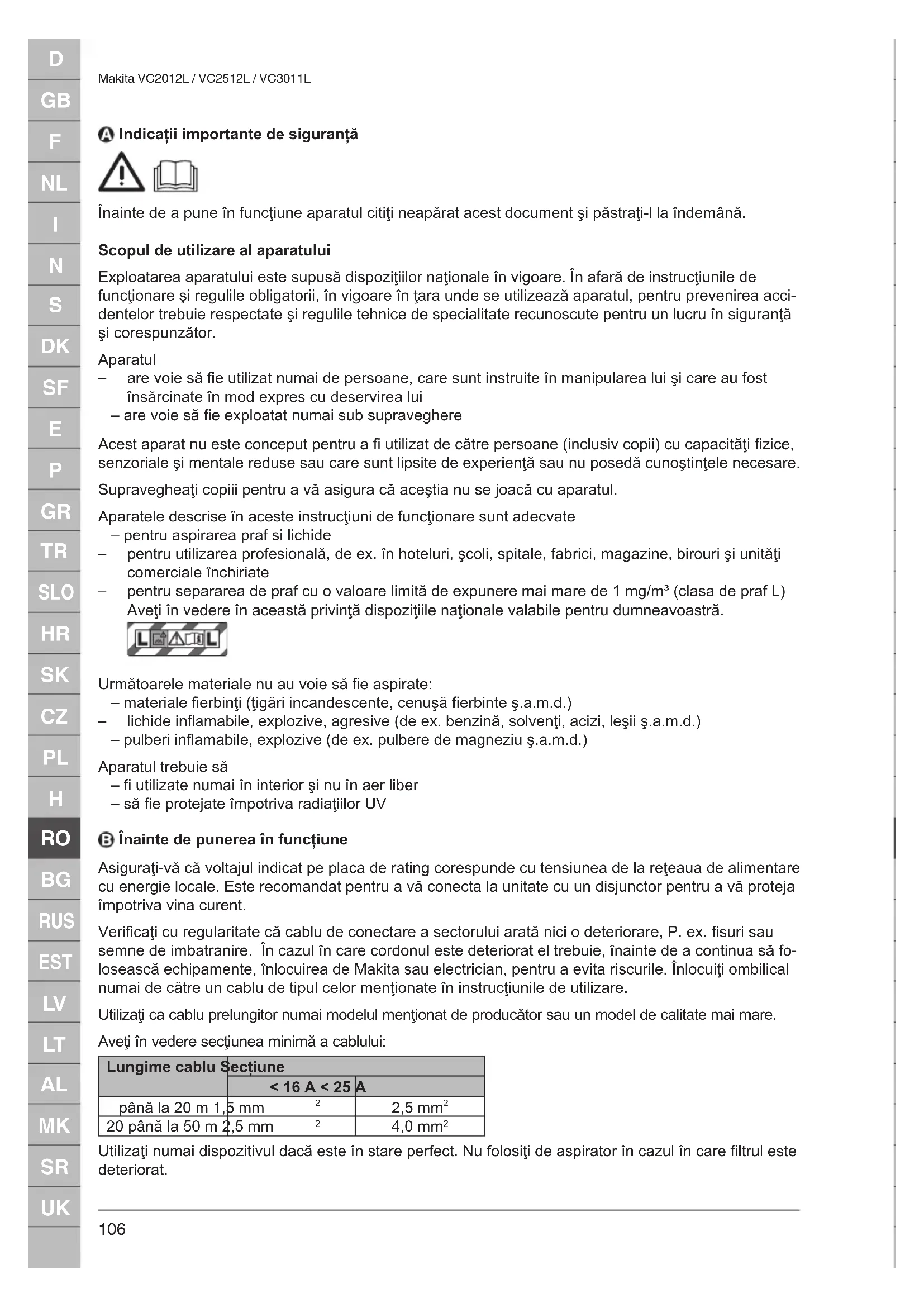 Makita VC2012L / VC2512L / VC3011L Indicaţii importante de siguranţă Înainte de a pune în funcţiune aparatul citiţi neapărat acest document şi păstraţi-l la îndemână. Scopul de utilizare al aparatului Exploatarea aparatului este supusă dispoziţiilor naţionale în vigoare. În afară de instrucţiunile de funcţionare şi regulile obligatorii, în vigoare în ţara unde se utilizează aparatul, pentru prevenirea acci- dentelor trebuie respectate şi regulile tehnice de specialitate recunoscute pentru un lucru în siguranţă şi corespunzător. Aparatul – are voie să e utilizat numai de persoane, care sunt instruite în manipularea lui şi care au fost însărcinate în mod expres cu deservirea lui – are voie să e exploatat numai sub supraveghere Acest aparat nu este conceput pentru a utilizat de către persoane (inclusiv copii) cu capacităţi zice, senzoriale şi mentale reduse sau care sunt lipsite de experienţă sau nu posedă cunoştinţele necesare. Supravegheaţi copiii pentru a vă asigura că aceştia nu se joacă cu aparatul. Aparatele descrise în aceste instrucţiuni de funcţionare sunt adecvate – pentru aspirarea praf si lichide – pentru utilizarea profesională, de ex. în hoteluri, şcoli, spitale, fabrici, magazine, birouri şi unităţi comerciale închiriate – pentru separarea de praf cu o valoare limită de expunere mai mare de 1 mg/m³ (clasa de praf L) Aveţi în vedere în această privinţă dispoziţiile naţionale valabile pentru dumneavoastră. Următoarele materiale nu au voie să e aspirate: – materiale erbinţi (ţigări incandescente, cenuşă erbinte ş.a.m.d.) – lichide inamabile, explozive, agresive (de ex. benzină, solvenţi, acizi, leşii ş.a.m.d.) – pulberi inamabile, explozive (de ex. pulbere de magneziu ş.a.m.d.) Aparatul trebuie să – utilizate numai în interior şi nu în aer liber – să e protejate împotriva radiaţiilor UV Înainte de punerea în funcţiune Asiguraţi-vă că voltajul indicat pe placa de rating corespunde cu tensiunea de la reţeaua de alimentare cu energie locale. Este recomandat pentru a vă conecta la unitate cu un disjunctor pentru a vă proteja împotriva vina curent. Vericaţi cu regularitate că cablu de conectare a sectorului arată nici o deteriorare, P. ex. suri sau semne de imbatranire. În cazul în care cordonul este deteriorat el trebuie, înainte de a continua să fo- losească echipamente, înlocuirea de Makita sau electrician, pentru a evita riscurile. Înlocuiţi ombilical numai de către un cablu de tipul celor menţionate în instrucţiunile de utilizare. Utilizaţi ca cablu prelungitor numai modelul menţionat de producător sau un model de calitate mai mare. Aveţi în vedere secţiunea minimă a cablului: Lungime cablu Secţiune < 16 A < 25 A până la 20 m 1,5 mm