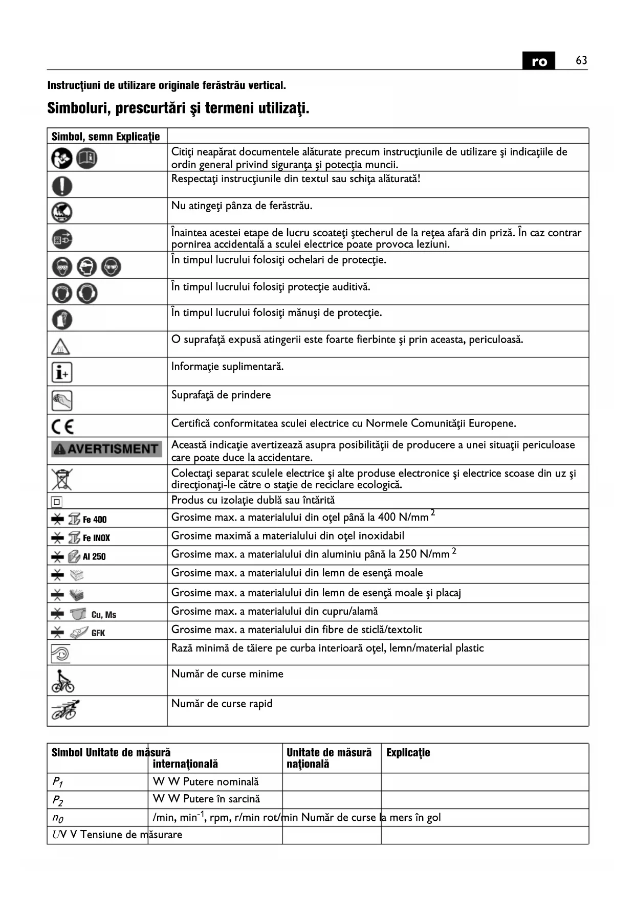 Păstrați in vederea unei UTILIZARI viitoare totae instruţiunileși indicatorile privind sigurantași protectia muncii.