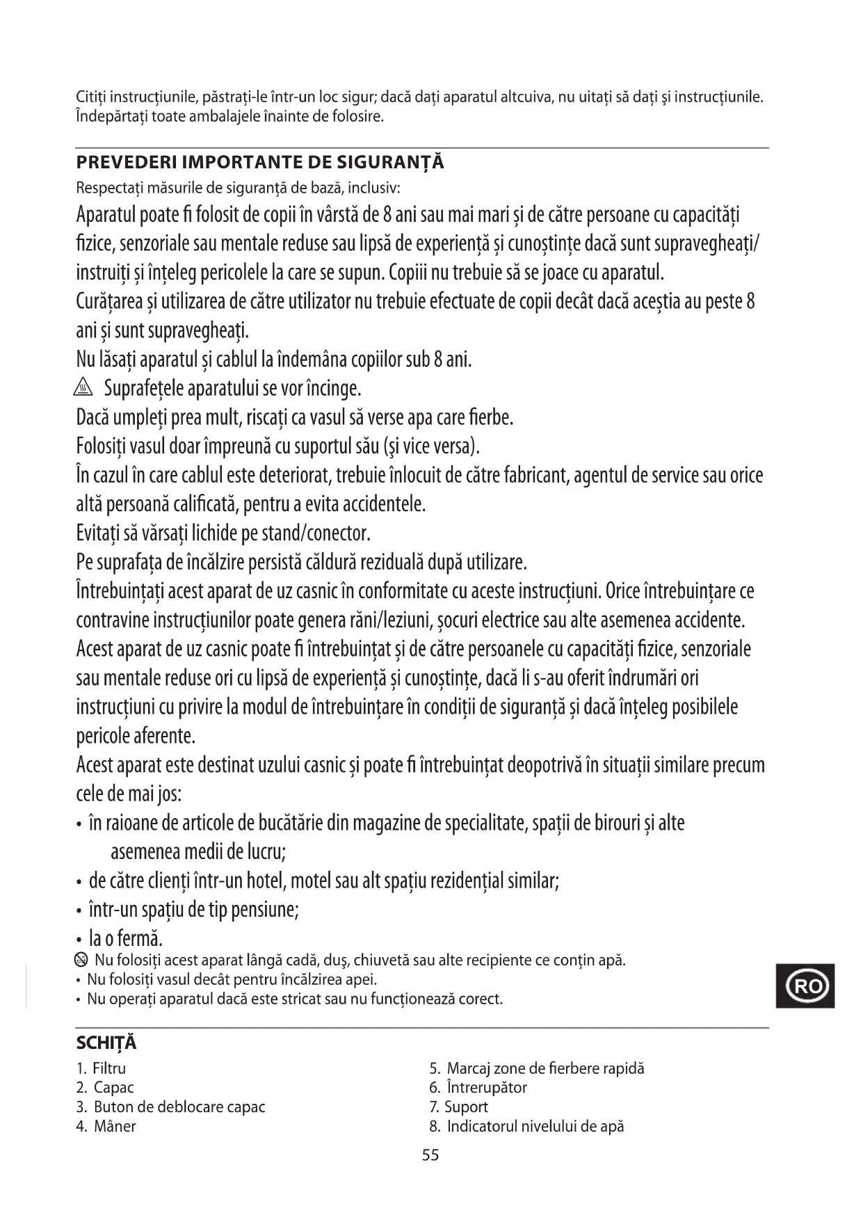 Respectați măsurile de siguranță de bază, inclusiv: Aparatul poate fi folosit de copii în vârstă de 8 ani sau mai mari și de către persoane cu capacități fizice, senzoriale sau mentale reduse sau lipsă de experiență și cunoștințe dacă sunt supravegheați/ instruiți și înțeleg pericolele la care se supun. Copiii nu trebuie să se joace cu aparatul. Curățarea și utilizarea de către utilizator nu trebuie efectuate de copii decât dacă aceștia au peste 8 ani și sunt supravegheați. Nu lăsați aparatul și cablul la îndemâna copiilor sub 8 ani. h Suprafețele aparatului se vor încinge. Dacă umpleți prea mult, riscați ca vasul să verse apa care fierbe. Folosiți vasul doar împreună cu suportul său (şi vice versa). În cazul în care cablul este deteriorat, trebuie înlocuit de către fabricant, agentul de service sau orice altă persoană calificată, pentru a evita accidentele. Evitați să vărsați lichide pe stand/conector. Pe suprafața de încălzire persistă căldură reziduală după utilizare. Întrebuințați acest aparat de uz casnic în conformitate cu aceste instrucțiuni. Orice întrebuințare ce contravine instrucțiunilor poate genera răni/leziuni, șocuri electrice sau alte asemenea accidente. Acest aparat de uz casnic poate fi întrebuințat și de către persoanele cu capacități fizice, senzoriale sau mentale reduse ori cu lipsă de experiență și cunoștințe, dacă li s-au oferit îndrumări ori instrucțiuni cu privire la modul de întrebuințare în condiții de siguranță și dacă înțeleg posibilele pericole aferente. Acest aparat este destinat uzului casnic și poate fi întrebuințat deopotrivă în situații similare precum cele de mai jos: