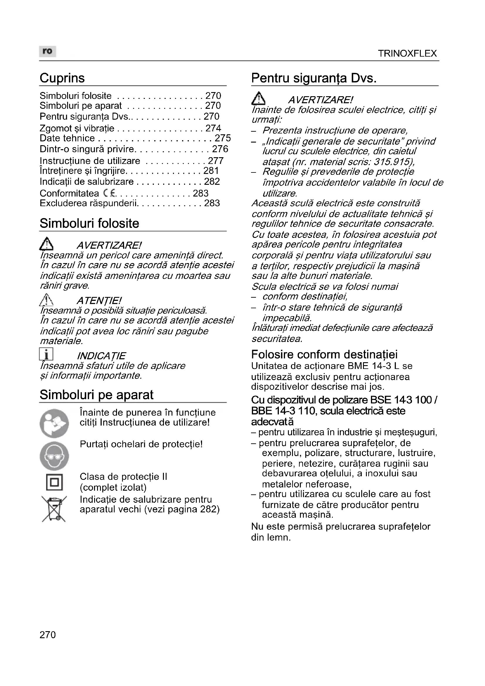 Dacă se recomandă o apărătoare de protecţie, împiedicaţi contactul dintre apărătoarea de protecţie şi peria de sârmă. Discurileperie şi periileoală îşi pot mări diametrul sub acţiunea presiunii de apăsare şi a forţelor cenrifuge. Instrucţiuni de siguranţă pentru scula electrică cu dispozitiv de şlefuit cu bandă AVERTIZARE! Citiţi toate indicaţiile de siguranţă, instrucţiunile, figurile şi specificaţiile pentru scula electrică inclusă în pachetul de livrare. Nerespectarea indicaţiilor de avertizare şi a instrucţiunilor poate provoca electro- cutare, incendii şi/sau răniri grave. Păstraţi toate indicaţiile de siguranţă şi instrucţiunile în vederea utilizărilor viitoare. Apucaţi aparatul de suprafeţele de prindere izolate, deoarece banda de şlefuit ar putea atinge cablul de reţea. Deteriorarea unui cablu aflat sub tensiune poate pune sub tensiune părţile metalice ale aparatului şi provoca electrocutarea. Nu utilizaţi scula electrică în cazul în care cablul acesteia este deteriorat. În cazul în care cablul suferă deteriorări în timpul lucrului, nu îl atingeţi şi scoateţi fişa de reţea. Cablurile deteriorate cresc riscul de electrocutare. Utilizaţi scula electrică numai pentru şlefuire uscată. Pătrunderea apei în aparatul electric creşte riscul de electrocutare. În timpul lucrului, ţineţi cu ambele mâini scula electrică. Mânerul trebuie să fie montat! Conectaţi maşina numai după ce aţi apucat-o cu ambele mâini. Nu atingeţi banda de şlefuit aflată în mişcare. În zona rolelor de întoarcere există pericolul de vătămare prin strivire. Din cauza modului de funcţionare şi a flexibilităţii asigurate pentru aparat, aceste locuri periculoase nu pot fi acoperite complet. Pulberile emise de materiale precum vopselele cu plumb, anumite esenţe de lemn, minerale şi metale pot pune în pericol sănătatea operatorului şi a persoanelor aflate în apropiere. Inhalarea acestor pulberi sau contactul cu acestea pot produce afecţiuni ale căilor respiratorii şi/sau reacţii alergice. – Asiguraţi ventilarea corespunzătoare a locului de muncă! – Dacă este posibil, utilizaţi un sistem extern de aspirare a prafului.TRINOXFLEX