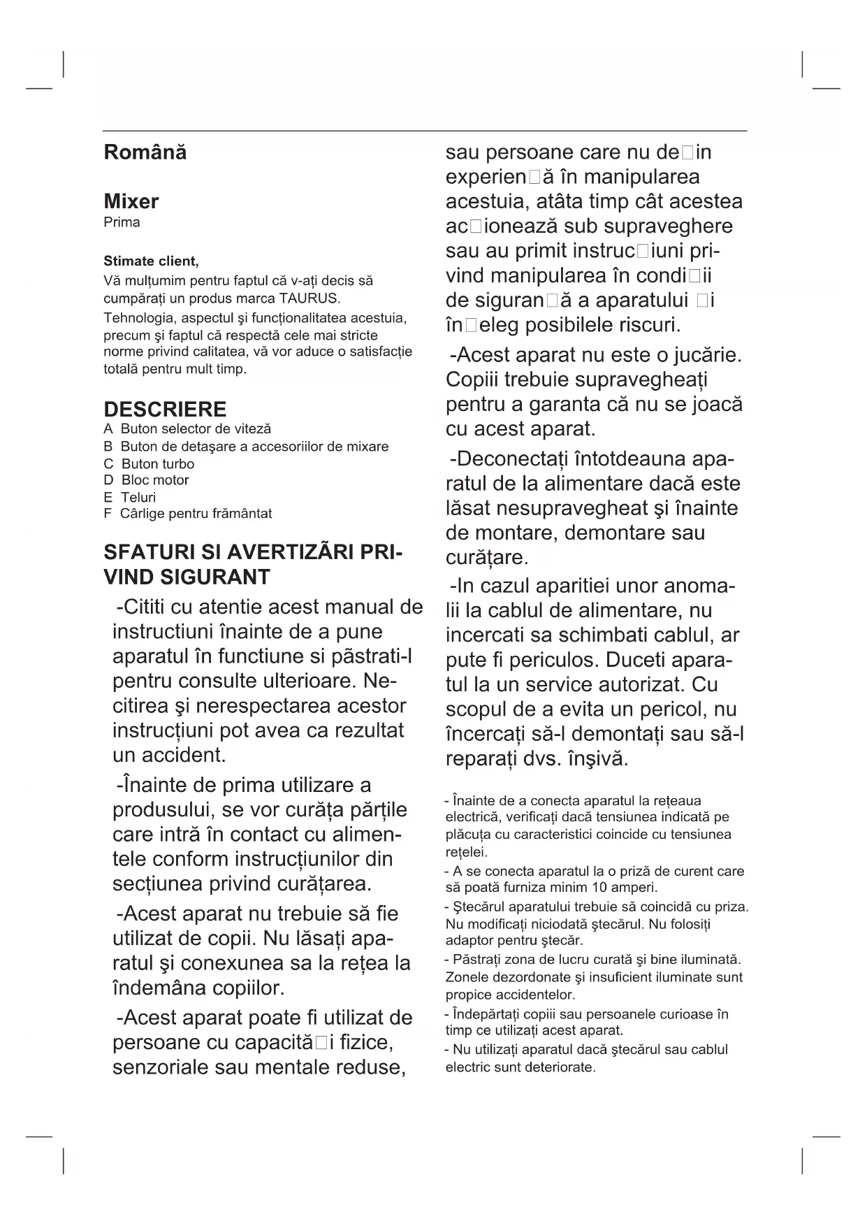PRODUSULUI - Materialele care alcătuiesc ambalajul acestui aparat sunt integrate într-un sistem de colec- tare, clasicare şi reciclare. Dacă doriţi să vă debarasaţi de ele, puteţi utiliza containerele publice prevăzute pentru ecare tip de material in parte. - Produsul nu conţine concentraţii de substanţe care pot considerate dăunătoare pentru me- diul înconjurător. Acest simbol semnalează că, dacă doriţi să vă debarasaţi de acest produs odată încheiată durata sa de viaţă, trebuie să îl predaţi, cu ajutorul mijloacelor adecvate, unui colector de dețeurile de echipamente electrice ți electronice (DEEE). Acest aparat respectă Directiva 2006/95/CE privind Joasa Tensiune, Directiva 2004/108/CE privind Compatibilitatea Electromagnetică ți Di- rectiva 2011/65/CE privind restricțiile la utilizarea anumitor substanțe periculoase pentru aparate electrice ți electronice.Български Миксер за месене Prima Уважаеми клиенти: Благодарим Ви, че закупихте електроуред с марката TAURUS. Неговата технология, дизайн и функционалност, наред с факта, че надвишава и най-стриктните норми за качество, ще Ви доставят пълно удовлетворение за дълго