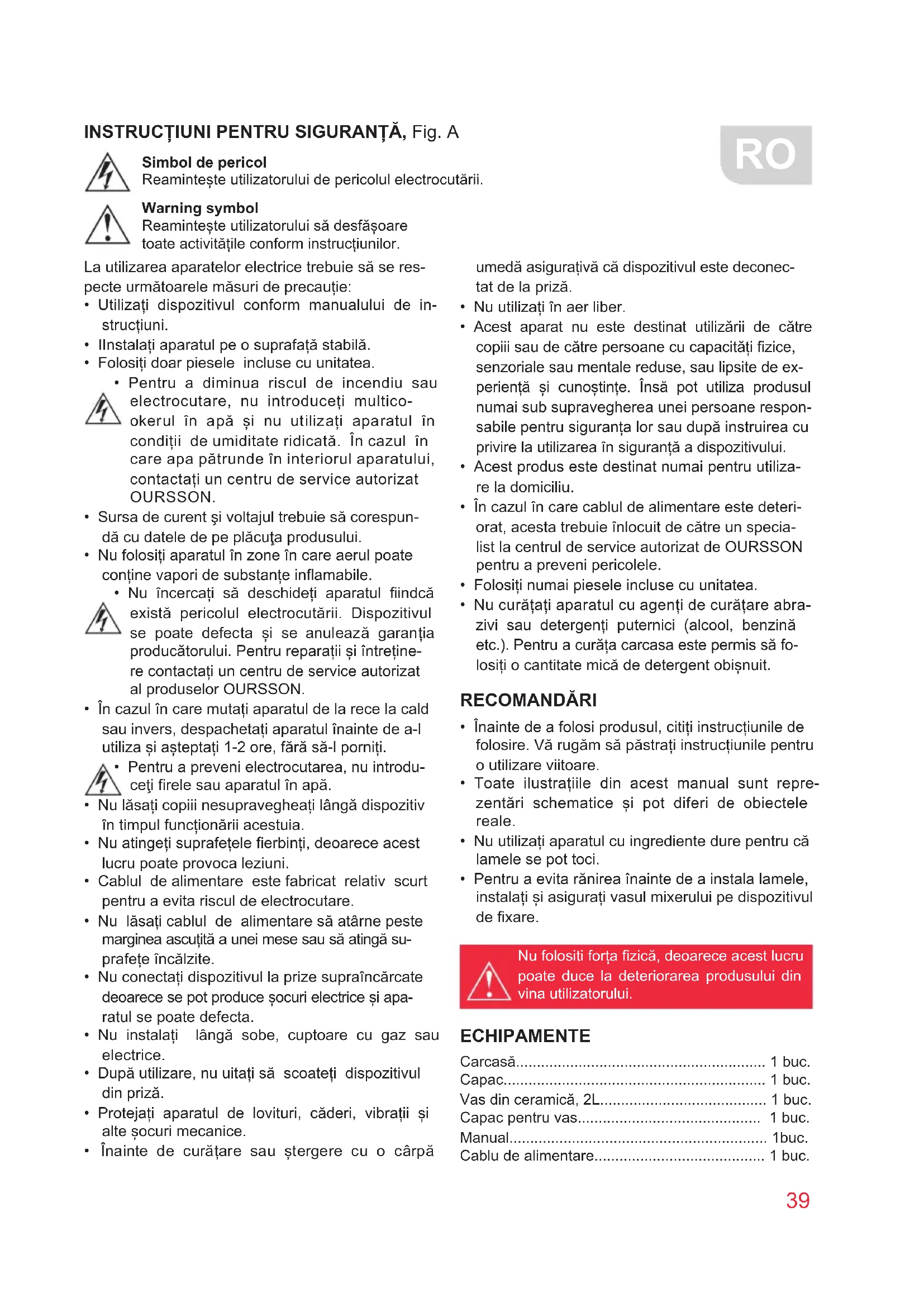 produsele și unele caracteristici tehnice se pot mo- dica fără o noticare prealabilă a producătorului. SERVICE Compania OURSSON își exprimă aprecierea către dumneavoastră pentru alegerea produselor noas- tre. Am făcut tot posibilul ca acest produs să cores- pundă nevoilor dumneavoastră și calitatea sa e în conformitate cu cele mai înalte standarde europene. Dacă produsul dumneavoastră OURSSON va avea nevoie de întreținere, vă rugăm să sunați la unul din centrele de service autorizate. O listă completă a centrelor de service și adresele lor exacte pot găsite pe site-ul www.oursson.ro, precum și prin te- lefon la numărul pentru asistență OURSSON. Condiții de garanție OURSSON: