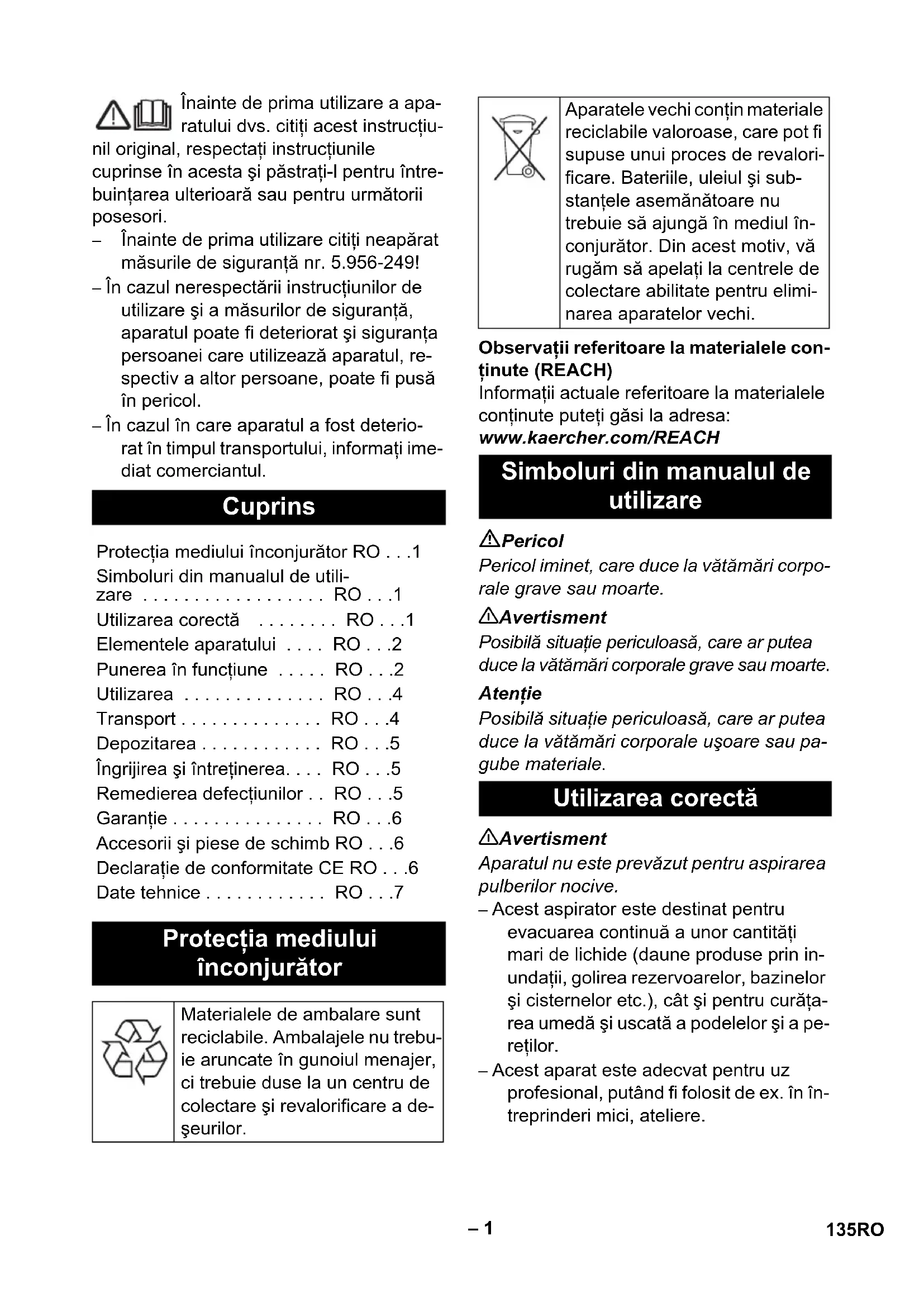 Nr części Długość kabla EU 6.649-413.0 10 m CH 6.649-254.0 10 m 134 PL– 1 Înainte de prima utilizare a apa- ratului dvs. citiţi acest instrucţiu- nil original, respectaţi instrucţiunile cuprinse în acesta şi păstraţi-l pentru între- buinţarea ulterioară sau pentru următorii posesori. – Înainte de prima utilizare citiţi neapărat măsurile de siguranţă nr. 5.956-249! – În cazul nerespectării instrucţiunilor de utilizare şi a măsurilor de siguranţă, aparatul poate fi deteriorat şi siguranţa persoanei care utilizează aparatul, re- spectiv a altor persoane, poate fi pusă în pericol. – În cazul în care aparatul a fost deterio- rat în timpul transportului, informaţi ime- diat comerciantul. Observaţii referitoare la materialele con- ţinute (REACH) Informaţii actuale referitoare la materialele conţinute puteţi găsi la adresa: www.kaercher.com/REACH Pericol Pericol iminet, care duce la vătămări corpo- rale grave sau moarte. 몇 Avertisment Posibilă situaţie periculoasă, care ar putea duce la vătămări corporale grave sau moarte. Atenţie Posibilă situaţie periculoasă, care ar putea duce la vătămări corporale uşoare sau pa- gube materiale. 몇 Avertisment Aparatul nu este prevăzut pentru aspirarea pulberilor nocive. – Acest aspirator este destinat pentru evacuarea continuă a unor cantităţi mari de lichide (daune produse prin in- undaţii, golirea rezervoarelor, bazinelor şi cisternelor etc.), cât şi pentru curăţa- rea umedă şi uscată a podelelor şi a pe- reţilor. – Acest aparat este adecvat pentru uz profesional, putând fi folosit de ex. în în- treprinderi mici, ateliere. Cuprins Protecţia mediului înconjurător RO . . .1 Simboluri din manualul de utili- zare . . . . . . . . . . . . . . . . . . RO . . .1 Utilizarea corectă . . . . . . . . RO . . .1 Elementele aparatului . . . . RO . . .2 Punerea în funcţiune . . . . . RO . . .2 Utilizarea . . . . . . . . . . . . . . RO . . .4 Transport . . . . . . . . . . . . . . RO . . .4 Depozitarea . . . . . . . . . . . . RO . . .5 Îngrijirea şi întreţinerea. . . . RO . . .5 Remedierea defecţiunilor . . RO . . .5 Garanţie . . . . . . . . . . . . . . . RO . . .6 Accesorii şi piese de schimb RO . . .6 Declaraţie de conformitate CE RO . . .6 Date tehnice . . . . . . . . . . . . RO . . .7 Protecţia mediului înconjurător Materialele de ambalare sunt reciclabile. Ambalajele nu trebu- ie aruncate în gunoiul menajer, ci trebuie duse la un centru de colectare şi revalorificare a de- şeurilor. Aparatele vechi conţin materiale reciclabile valoroase, care pot fi supuse unui proces de revalori- ficare. Bateriile, uleiul şi sub- stanţele asemănătoare nu trebuie să ajungă în mediul în- conjurător. Din acest motiv, vă rugăm să apelaţi la centrele de colectare abilitate pentru elimi- narea aparatelor vechi. Simboluri din manualul de utilizare Utilizarea corectă 135RO– 2 1 Plutitorul 2 Cablu de reţea 3 Furtun pentru aspirare 4Zăvor cap de aspirare 5 Recipient pentru murdărie 6 Suport cablu pompă de evacuare 7Plăcuţă de închidere 8 Roată 9 Suport role de ghidare 10 Rolă de ghidare 11 Duză pentru sol 12 Tub de aspirare 13 Ştuţul de aspirare 14 Cap de aspirare 15 Pompă de evacuare 16 Piuliţă olandeză pompă de evacuare 17 Comutator plutitor pompă de evacuare 18 Mâner pentru transport 19 Capacul filtrului 20 Mâner pentru curăţarea filtrului 21 Bară de manevrare 22 Cot 23 Ştecher pompă de evacuare 24 Comutator „OPRIRE pompă de evacu- are“ 25 Priză 26 Comutator „PORNIRE pompă de eva- cuare“ 27 Întrerupător principal 28 Filtru de aer uzat 29 Filtru pentru murdărie grosieră/cu pliuri plate 30 Furtun de evacuare 31 Suport pentru duza de curăţare a pode- lelor 32 Capac de închidere (cuplaj GEKA-C) 33 Suport tuburi de aspiraţie 34 Cârlig pentru cablu 35 Suport duză pentru rosturi 36 Plăcuţa de tip – Se recomandă ca aparatul să fie racor- dat numai la o priză care este asigurată cu un întrerupător de protecţie de cel puţin 30 mA. Aparatul permite 3 regimuri de funcţionare: 1 Aspirare umedă cu pompă de evacuare 2 Aspirare umedă fără pompă de evacuare 3 Aspirare uscată Indicaţie: Funcţionarea în regim de aspira- re umedă este posibilă chiar şi cu pompa de evacuare oprită sau demontată. Pentru demontarea pompei de evacuare vezi As- pirarea umedă. Figura Demontaţi peria. Montaţi lamelele de cauciuc. Notă: Porţiunea texturată a lamelei de cau- ciuc trebuie să fie spre exterior. Figura Deblocaţi capul de aspirare şi îndepăr- taţi-l. Trageţi afară sacul de filtrare din hârtie/ material textil în spate. Puneţi capul de aspirare la loc şi blo- caţi-l. – Când aspiraţi murdărie umedă, scoateţi întotdeauna sacul de filtrare din hârtie sau filtrul textil. Figura Deblocaţi capul de aspirare şi îndepăr- taţi-l. Îndepărtaţi filtrul cu membrană. Puneţi capul de aspirare la loc şi blo- caţi-l. – Când aspiraţi murdărie umedă, scoateţi întotdeauna filtrul-membrană. Elementele aparatului Punerea în funcţiune Aspirarea umedă Montarea lamelor de cauciuc Îndepărtarea sacului de filtrare din hâr- tie/material textil Îndepărtarea filtrului membrană 136 RO– 3 Deschideţi capacul filtrului. Scoateţi filtrul cu pliuri plate. Montaţi filtrul de murdărie grosieră. Închideţi capacul filtrului (când intră în locaş, se aude un zgomot). Figura Îndepărtaţi capacul de închidere (cuplaj GEKA-C). Racordaţi furtunul de evacuare (diame- tru nominal 3/4“ sau mai mare). Figura Goliţi apa murdară prin furtunul de golire. Atenţie În timpul aspirării nu este permisă îndepăr- tarea filtrului pentru murdărie grosieră. – Aspirare umedă fără pompă de evacua- re: Se recomandă folosirea unui sac fil- trant special (ud) (vezi sistemele de filtrare). – Aparatul se opreşte automat la atinge- rea nivelului maxim de lichid. – După terminarea procesului d
