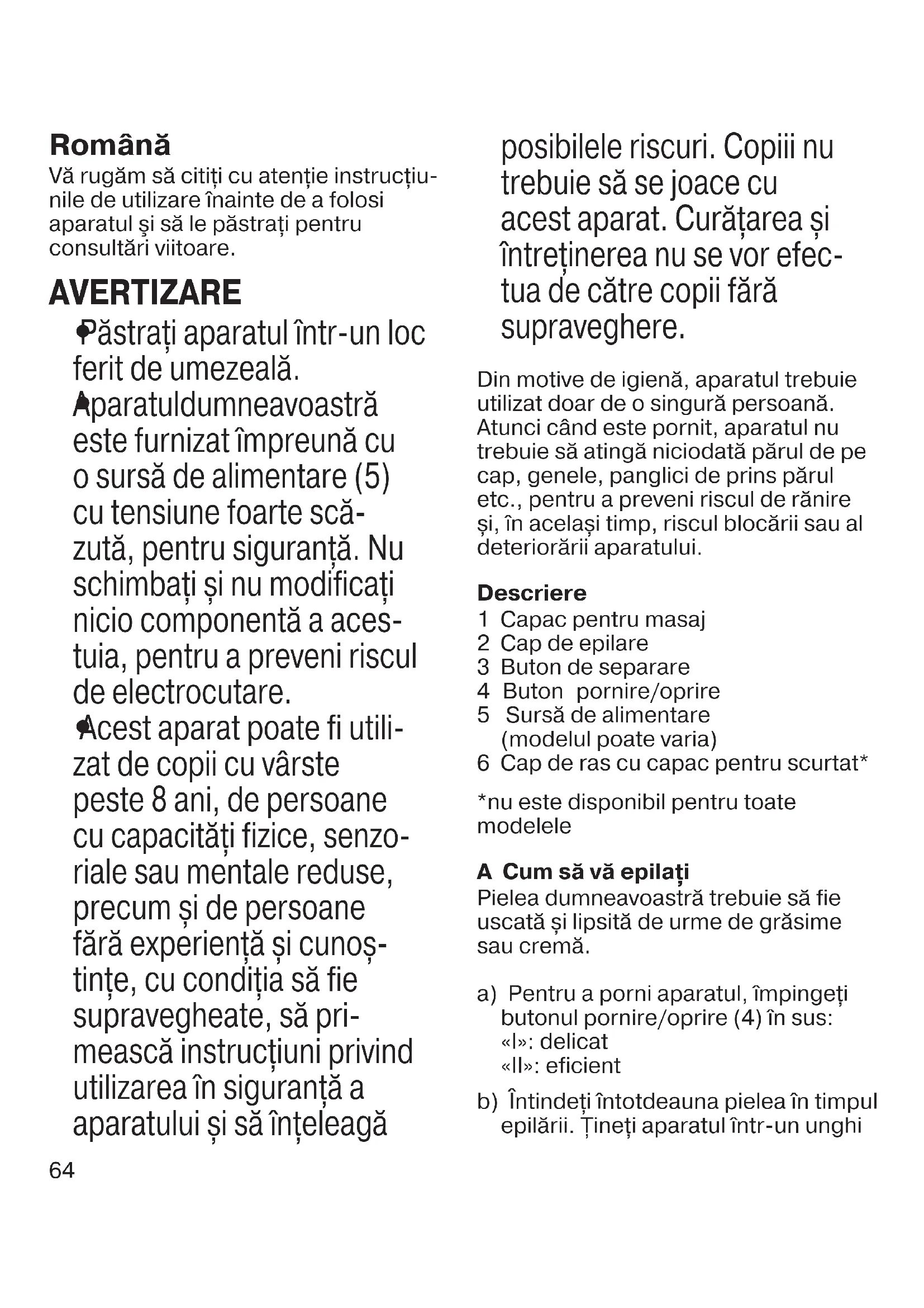 Acest aparat poate fi utili- zat de copii cu vârste peste 8 ani, de persoane cu capacităţi fizice, senzo- riale sau mentale reduse, precum și de persoane fără experienţă și cunoș- tinţe, cu condiţia să fie supravegheate, să pri- mească instrucţiuni privind utilizarea în siguranţă a aparatului și să înţeleagă 90323726_SE_3_Grocery.indd 6490323726_SE_3_Grocery.indd 64 02.06.22 15:3502.06.22 15:3565 ● Epilarea este mai ușoară și mai confortabilă atunci când firul de păr are o lungime cuprinsă între 0,5 și 3 mm. Dacă firele de păr sunt mai lungi, vă recomandăm să le scurtaţi. Informaţii generale privind epilarea Toate metodele de îndepărtare a părului de la rădăcină pot provoca iritaţii ale pielii (de ex., mâncărimi, disconfort și înroșire), în funcţie de starea pielii și a părului. Reacţia este una normală și ar trebui să dispară rapid, însă aceasta poate fi mai pronunţată la primele ocazii când îndepărtaţi părul de la rădăcină sau dacă aveţi pielea sensibilă. În general, reacţiile pielii și senzaţia de durere tind să se diminueze considerabil în urma utilizării repetate a acestui produs. În cazul în care, după 36 de ore, pielea încă prezintă iritaţii, vă recomandăm să vă adresaţi medicului. Pentru a reduce la minimum riscul de infectare sau inflamare din cauza pătrunderii bacteriilor în piele, în urma producerii de leziuni microscopice, curăţaţi temeinic capul de epilare și pielea, înainte de fiecare utilizare. Dacă aveţi orice îndoieli privind folosirea acestui aparat, consultaţi medicul. Acest aparat trebuie utilizat doar după ce consultaţi în prealabil un medic, în caz de: eczemă, leziuni, reacţii inflamatorii ale pielii, precum foliculita (foliculi piloși purulenţi) și vene varicoase în jurul aluniţelor, imunitate redusă a pielii, de ex., diabet zaharat, pe perioada sarcinii, boala Raynaud, hemofilie, candida sau imunodeficienţă. drept (90°) și ghidaţi-l fără presiune în direcţia de creștere a părului și a luminii. c) Picioare: Epilaţi-vă picioarele în direcţie ascendentă. Când epilaţi zona din spatele genunchiului, ţineţi piciorul bine întins. d) Zone sensibile: Mai întâi de toate, curăţaţi și uscaţi cu atenţie zonele sensibile, pentru a îndepărta reziduurile (precum deodorantul). Utilizaţi setarea butonului «I». Dacă epilaţi axila, ţineţi braţul ridicat și deplasaţi aparatul în diferite direcţii. e) Curățarea După utilizare, opriţi aparatul și scoateţi-l din priză. Îndepărtaţi capacul de masaj și periaţi pensetele, rotind manual accesoriul cu pensete. Pentru a detașa capul de epilare, apăsaţi pe butonul de separare (3) din stânga și dreapta, și trageţi. După curăţare, puneţi înapoi capul de epilare și capacul de masaj. Sugestii pentru începători ● Dacă nu aţi mai utilizat vreodată un epilator, poate fi necesară o perioadă de timp pentru ca pielea dvs. să se adapteze procesului de epilare. La început, epilaţi-vă săptămânal, pentru a ajuta la reducerea disconfortului. ● La prima utilizare, epilaţi-vă seara, astfel încât roșeaţa să dispară până dimineaţa. Pentru relaxarea pielii, recomandăm aplicarea unei creme hidratante după epilare. 90323726_SE_3_Grocery.indd 6590323726_SE_3_Grocery.indd 65 02.06.22 15:3502.06.22 15:3566 introducere pe piatã a aparatelor electrocasnice în functie de nivelul zgomotului transmis prin aer, valoarea de zgomot dB(A) pentru acest aparat este de 78 dB(A). Garanţie Acordăm o garanţie de 2 ani pentru acest produs, de la data livrării produsului. Durata medie de utilizare: 5 ani, cu condiţia respectării instrucţiunilor de utilizare și efectuării intervenţiilor tehnice numai de către personalul service-lui autorizat. În perioada de garanţie vom remedia gratuit neconformităţile aparatului, prin repararea sau înlocuirea produsului, după caz. In funcţie de disponibilitate, componentele de schimb pot avea o culoare diferită sau un model echivalent. Această garanţie este valabilă în orice ţara în care acest aparat este furnizat de către compania Braun sau de către distribuitorul desemnat al acesteia. Repararea sau înlocuirea produselor se va efectua în cadrul unei perioade rezonabile de timp (maxim 15 zile de la data aducerii la cunoştinţă a neconformităţii). Prezenta garanţie nu acoperă: defectele datorate utilizării necorespunzătoare, uzurii normale, precum și defectele care au un efect neglijabil asupra valorii sau funcţionării aparatului. Garanţia devine nulă dacă se efectuează reparaţii de către persoane neautorizate şi dacă nu se utilizează componente originale Braun. Pentru a beneficia de service în perioada de garanţie, prezentaţi produsul împreună cu factura (bonul/chitanţa de cumpărare) la una dintre unităţile de service agreate.
