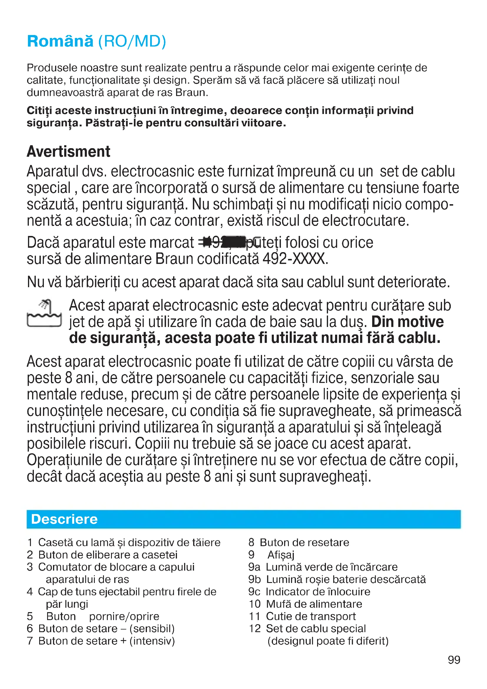 bulaşık deterjanı eklediğiniz sıcak suya batırın. Ardından iyice durulayın ve silkeleyin. Kuruduğunda, başlığa bir damla makine yağı damlatın. Tıraş makinesi pil tamamen doluyken kapanıyor. Elek ve bıçak yıpranmıştır ve motorun sağlayabileceğinden daha fazla elektriğe ihtiyaç duyuyordur. Cihaz kapanıyor. – Elek ve Bıçak kasetini değiştirin. – Özellikle sadece su ile temizliyorsanız, tıraş sistemini düzenli olarak yağlayın. Ekrandaki pil segmentlerin- de, düşük pil kapasitesi gös- terge çubukları eksik. Elek ve bıçak yıpranmıştır ve her tıraşta daha fazla elektrik kullanıyordur. – Elek ve Bıçak kasetini değiştirin. – Özellikle sadece su ile temizliyorsanız, tıraş sistemini düzenli olarak yağlayın. Tıraş parçaları daha yeni değişti ancak değiştirme sembolü yanıyor. Sıfırlama düğmesine basılmamıştır. – Sıfırlama düğmesine en az 3 saniye basılı tutarak sayacı sıfırlayın. 91153500_Series_7-8_Solo_EURO_S6-140.indd 9891153500_Series_7-8_Solo_EURO_S6-140.indd 98 28.11.16 13:4228.11.16 13:42 CSS APPROVED Effective Date 30Nov2016 GMT - Printed 04Jan2017 Page 97 of 13999 Română (RO/MD) Produsele noastre sunt realizate pentru a răspunde celor mai exigente cerinţe de calitate, funcţionalitate și design. Sperăm să vă facă plăcere să utilizaţi noul dumneavoastră aparat de ras Braun. Citiţi aceste instrucţiuni în întregime, deoarece conţin informaţii privind siguranţa. Păstraţi-le pentru consultări viitoare. Avertisment Aparatul dvs. electrocasnic este furnizat împreună cu un set de cablu special , care are încorporată o sursă de alimentare cu tensiune foarte scăzută, pentru siguranţă. Nu schimbaţi și nu modificaţi nicio compo- nentă a acestuia; în caz contrar, există riscul de electrocutare. Dacă aparatul este marcat 492, îl puteţi folosi cu orice sursă de alimentare Braun codificată 492-XXXX. Nu vă bărbieriţi cu acest aparat dacă sita sau cablul sunt deteriorate. Acest aparat electrocasnic este adecvat pentru curăţare sub jet de apă şi utilizare în cada de baie sau la duş. Din motive de siguranţă, acesta poate fi utilizat numai fără cablu. Acest aparat electrocasnic poate fi utilizat de către copiii cu vârsta de peste 8 ani, de către persoanele cu capacităţi fizice, senzoriale sau mentale reduse, precum și de către persoanele lipsite de experienţa și cunoștinţele necesare, cu condiţia să fie supravegheate, să primească instrucţiuni privind utilizarea în siguranţă a aparatului și să înţeleagă posibilele riscuri. Copiii nu trebuie să se joace cu acest aparat. Operaţiunile de curăţare și întreţinere nu se vor efectua de către copii, decât dacă aceștia au peste 8 ani și sunt supravegheaţi. Descriere 1 Casetă cu lamă și dispozitiv de tăiere 2 Buton de eliberare a casetei 3 Comutator de blocare a capului aparatului de ras 4 Cap de tuns ejectabil pentru firele de păr lungi 5 Buton pornire/oprire 6 Buton de setare – (sensibil) 7 Buton de setare + (intensiv) 8 Buton de resetare 9 Afișaj 9a Lumină verde de încărcare 9b Lumină roșie baterie descărcată 9c Indicator de înlocuire 10 Mufă de alimentare 11 Cutie de transport 12 Set de cablu special (designul poate fi diferit) 91153500_Series_7-8_Solo_EURO_S6-140.indd 9991153500_Series_7-8_Solo_EURO_S6-140.indd 99 28.11.16 13:4228.11.16 13:42 CSS APPROVED Effective Date 30Nov2016 GMT - Printed 04Jan2017 Page 98 of 139100 Încărcare Temperatura ambientală recomandată pentru încărcare este cuprinsă între 5 °C și 35 °C. În condiţii de temperatură foarte scăzută sau foarte ridicată este posibil ca bateria să nu se încarce corespunzător sau chiar să nu se încarce deloc. Temperatura ambientală recomandată pentru bărbierit este cuprinsă între 15 °C și 35 °C. Nu expuneţi aparatul de ras la temperaturi mai mari de 50 °C pentru perioade lungi de timp.