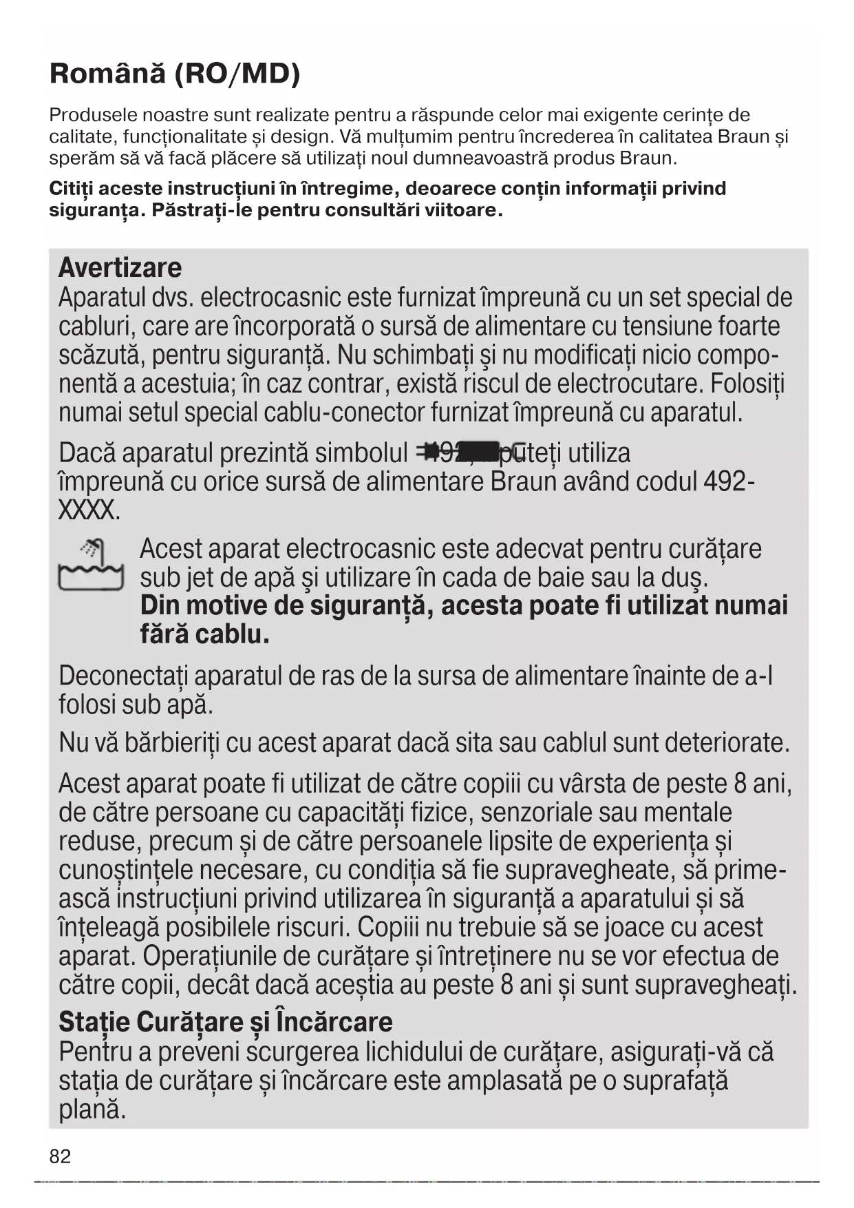 Unvan: Adres: Tel, Faks: e-posta: Kaşe ve İmza: Fatura Tarihi ve Sayısı: Teslim Yeri ve Tarihi: Procter & Gamble Satış ve Dağıtım Ltd. Şti. Nida Kule – Kuzey, Barbaros Mahallesi Begonya Sokak No:3 34746 Ataşehir, İstanbul tarafından ithal edilmiştir. P&G Tüketici İlişkilerine, mesai günleri saat 09.00 ile 17.00 arasında sabit hattınızdan ücretsiz 0800 261 63 65 veya GSM dahil tüm hatlardan şehir içi ücretli 0216 463 83 83 numaralı telefonlardan ulaşabilirsiniz. www.pg.com.tr Braun Servis İstasyonları listemize internet sitemizden veya Tüketici Hizmetleri merkezimizi arayarak ulaşabilirsiniz. www.braun.com/tr 91092674_Series_5-2cc_wd_CEEMEA_S6-132.indd 8191092674_Series_5-2cc_wd_CEEMEA_S6-132.indd 81 23.11.16 15:4123.11.16 15:41 CSS APPROVED Effective Date 30Nov2016 GMT - Printed 05Apr2017 Page 81 of 13282 Română (RO/MD) Produsele noastre sunt realizate pentru a răspunde celor mai exigente cerinţe de calitate, funcţionalitate și design. Vă mulţumim pentru încrederea în calitatea Braun și sperăm să vă facă plăcere să utilizaţi noul dumneavoastră produs Braun. Citiţi aceste instrucţiuni în întregime, deoarece conţin informaţii privind siguranţa. Păstraţi-le pentru consultări viitoare. Avertizare Aparatul dvs. electrocasnic este furnizat împreună cu un set special de cabluri, care are încorporată o sursă de alimentare cu tensiune foarte scăzută, pentru siguranţă. Nu schimbaţi şi nu modificaţi nicio compo- nentă a acestuia; în caz contrar, există riscul de electrocutare. Folosiţi numai setul special cablu-conector furnizat împreună cu aparatul. Dacă aparatul prezintă simbolul 492, îl puteţi utiliza împreună cu orice sursă de alimentare Braun având codul 492- XXXX. Acest aparat electrocasnic este adecvat pentru curăţare sub jet de apă şi utilizare în cada de baie sau la duş. Din motive de siguranţă, acesta poate fi utilizat numai fără cablu. Deconectaţi aparatul de ras de la sursa de alimentare înainte de a-l folosi sub apă. Nu vă bărbieriţi cu acest aparat dacă sita sau cablul sunt deteriorate. Acest aparat poate fi utilizat de către copiii cu vârsta de peste 8 ani, de către persoane cu capacităţi fizice, senzoriale sau mentale reduse, precum și de către persoanele lipsite de experienţa și cunoștinţele necesare, cu condiţia să fie supravegheate, să prime- ască instrucţiuni privind utilizarea în siguranţă a aparatului și să înţeleagă posibilele riscuri. Copiii nu trebuie să se joace cu acest aparat. Operaţiunile de curăţare și întreţinere nu se vor efectua de către copii, decât dacă aceștia au peste 8 ani și sunt supravegheaţi. Staţie Curăţare și Încărcare Pentru a preveni scurgerea lichidului de curăţare, asiguraţi-vă că staţia de curăţare și încărcare este amplasată pe o suprafaţă plană. 91092674_Series_5-2cc_wd_CEEMEA_S6-132.indd 8291092674_Series_5-2cc_wd_CEEMEA_S6-132.indd 82 23.11.16 15:4123.11.16 15:41 CSS APPROVED Effective Date 30Nov2016 GMT - Printed 05Apr2017 Page 82 of 13283 Atunci când este instalat un cartuș de curăţare, nu loviţi, nu mişcaţi brusc şi nu transportaţi staţia în niciun fel, întrucât lichidul de curăţare se poate scurge din cartuș. Nu amplasaţi staţia într-un dulăpior de baie și nici pe o suprafaţă lustruită sau lăcuită. Cartușul de curăţare conţine un lichid extrem de inflamabil, așadar feriţi-l de sursele de foc. Nu îl expuneţi acţiunii directe a razelor de soare sau fumului de ţigară și nu îl depozitaţi deasupra unui radia- tor. Nu reumpleţi cartușul și utilizaţi numai cartușe de rezervă Braun originale. Aparat de ras 1 Casetă de bărbierit 2 Buton de eliberare a casetei 3 Comutator pentru sistemul de blocare MultiHead 4 Buton pornire/oprire 5 Afișajul aparatului de ras 5a Simbolul de blocare (blocare la transport) 5b Segmente încărcare 5c Indicator de curăţare 5d Simbolul bateriei 6 Dispozitiv de tuns pentru firele lungi de păr 7 Contacte aparat de ras-staţie 8 Buton de eliberare dispozitiv de tuns pentru fire lungi de păr 9 Mufă de alimentare a aparatului de ras 10 Set special cablu-conector (modelul poate diferi) 11 Capac de protecţie* 12 Cutie de transport*
