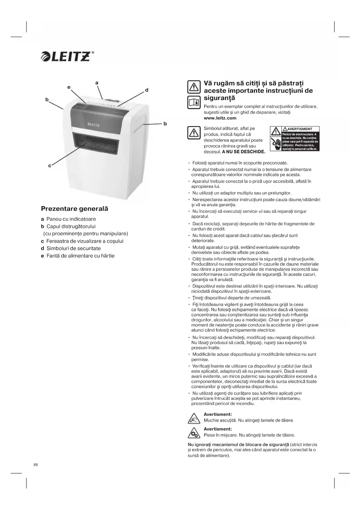 Vă rugăm să citiți și să păstrați aceste importante instrucțiuni de siguranță Pentru un exemplar complet al instrucțiunilor de utilizare, sugestii utile și un ghid de depanare, vizitați www.leitz.com Prezentare generală a Panou cu indicatoare b Capul distrugătorului (cu proeminențe pentru manipulare) c Fereastra de vizualizare a coșului d Simboluri de securitate e Fantă de alimentare cu hârtie
