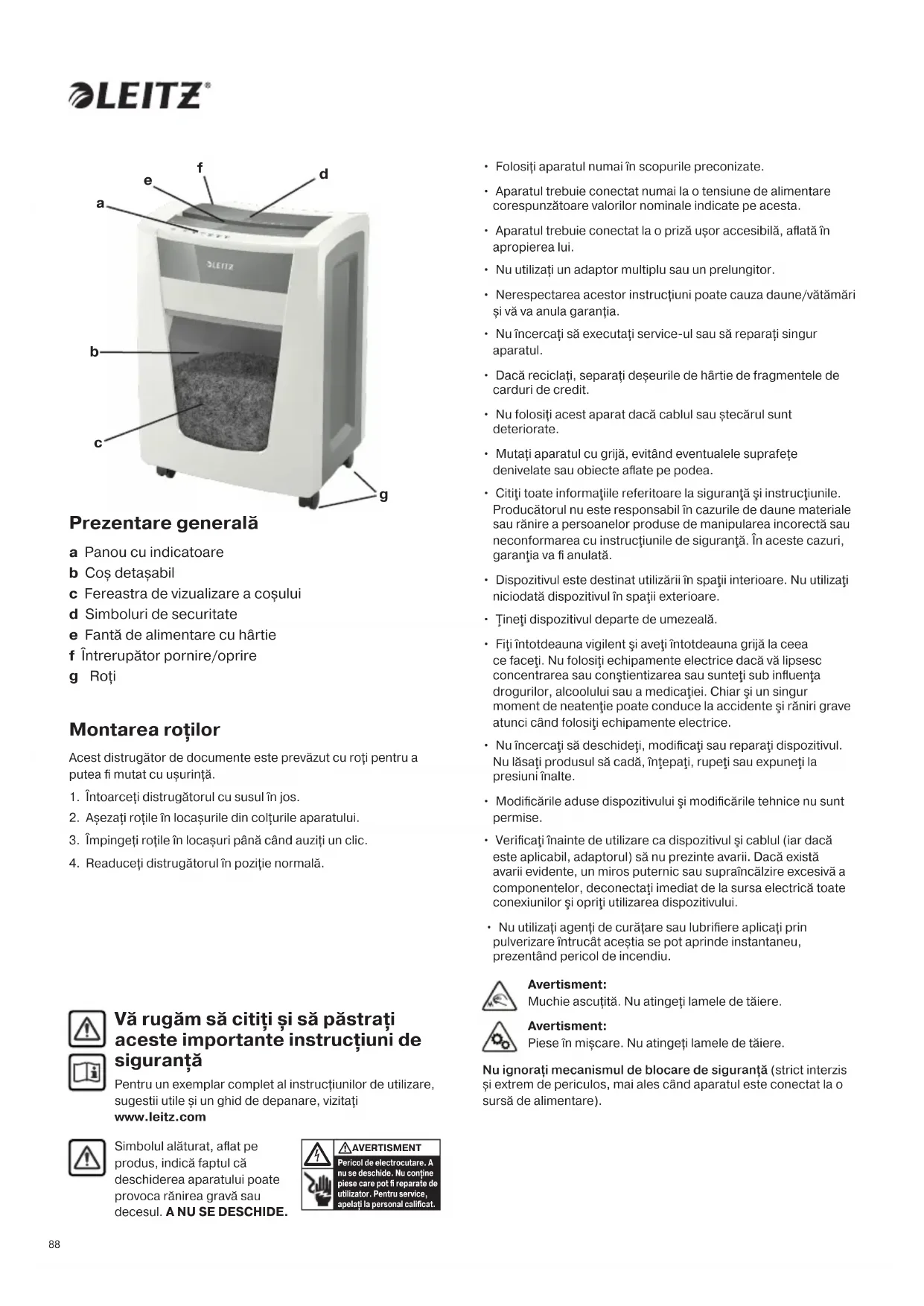 Vă rugăm să citiți și să păstrați aceste importante instrucțiuni de siguranță Pentru un exemplar complet al instrucțiunilor de utilizare, sugestii utile și un ghid de depanare, vizitați www.leitz.com Nu ignorați mecanismul de blocare de siguranță (strict interzis și extrem de periculos, mai ales când aparatul este conectat la o sursă de alimentare). Avertisment: Muchie ascuțită. Nu atingeți lamele de tăiere. Avertisment: Piese în mișcare. Nu atingeți lamele de tăiere. Prezentare generală a Panou cu indicatoare b Coș detașabil c Fereastra de vizualizare a coșului d Simboluri de securitate e Fantă de alimentare cu hârtie f Întrerupător pornire/oprire g Roți Montarea roților Acest distrugător de documente este prevăzut cu roți pentru a putea fi mutat cu ușurință.