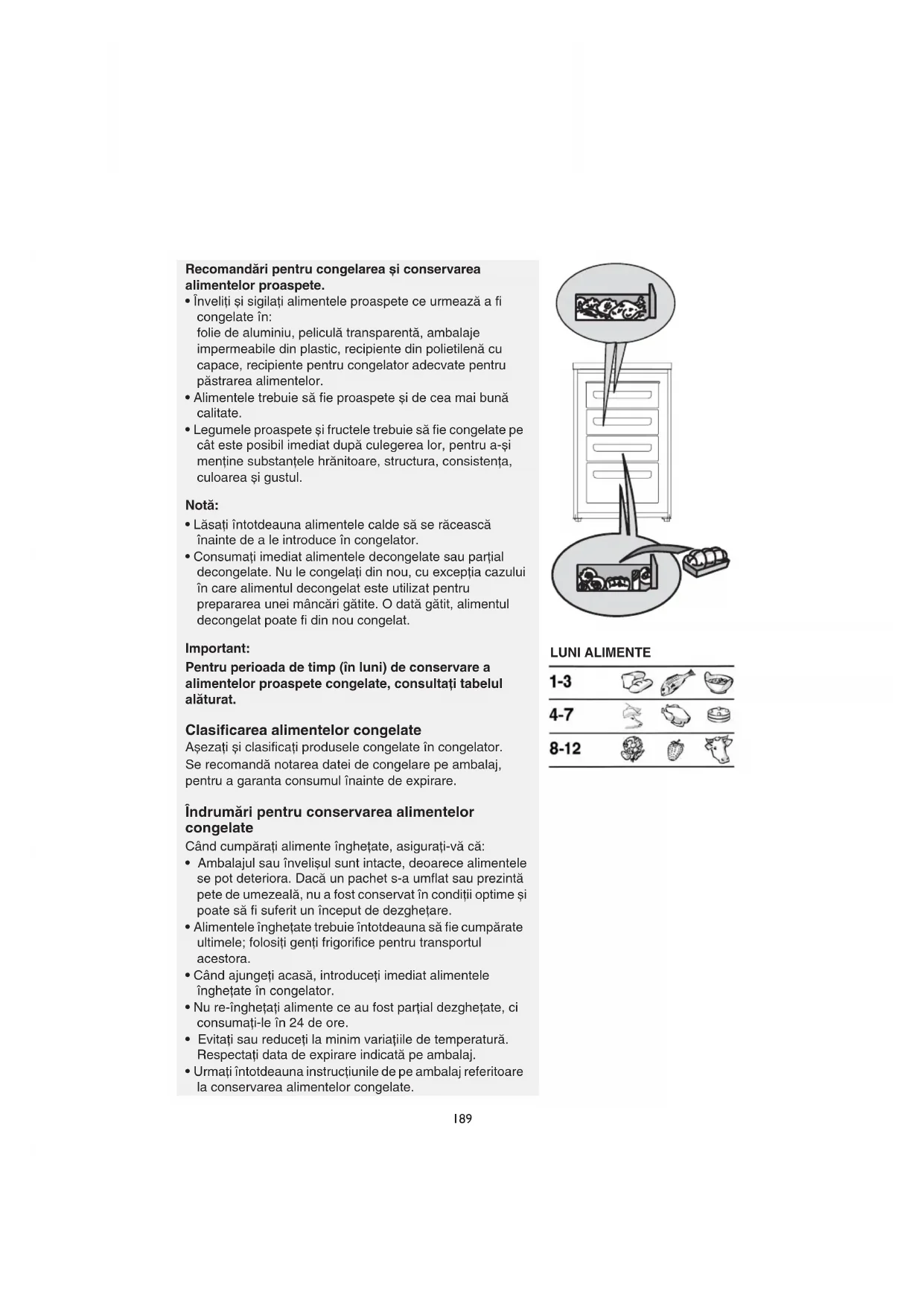 - Consumaţi imediat alimentele decongelate sau parţial decongelate. Nu le congelaţi din nou, cu excepţia cazului în care alimentul decongelat este utilizat pentru prepararea unei mâncări gătite. O dată gătit, alimentul decongelat poate fi din nou congelat. Important: Pentru perioada de timp (în luni) de conservare a alimentelor proaspete congelate, consultaţi tabelul alăturat. Clasificarea alimentelor congelate Așezaţi și clasificaţi produsele congelate în congelator. Se recomandă notarea datei de congelare pe ambalaj, pentru a garanta consumul înainte de expirare. Îndrumări pentru conservarea alimentelor congelate Când cumpăraţi alimente îngheţate, asiguraţi-vă că: