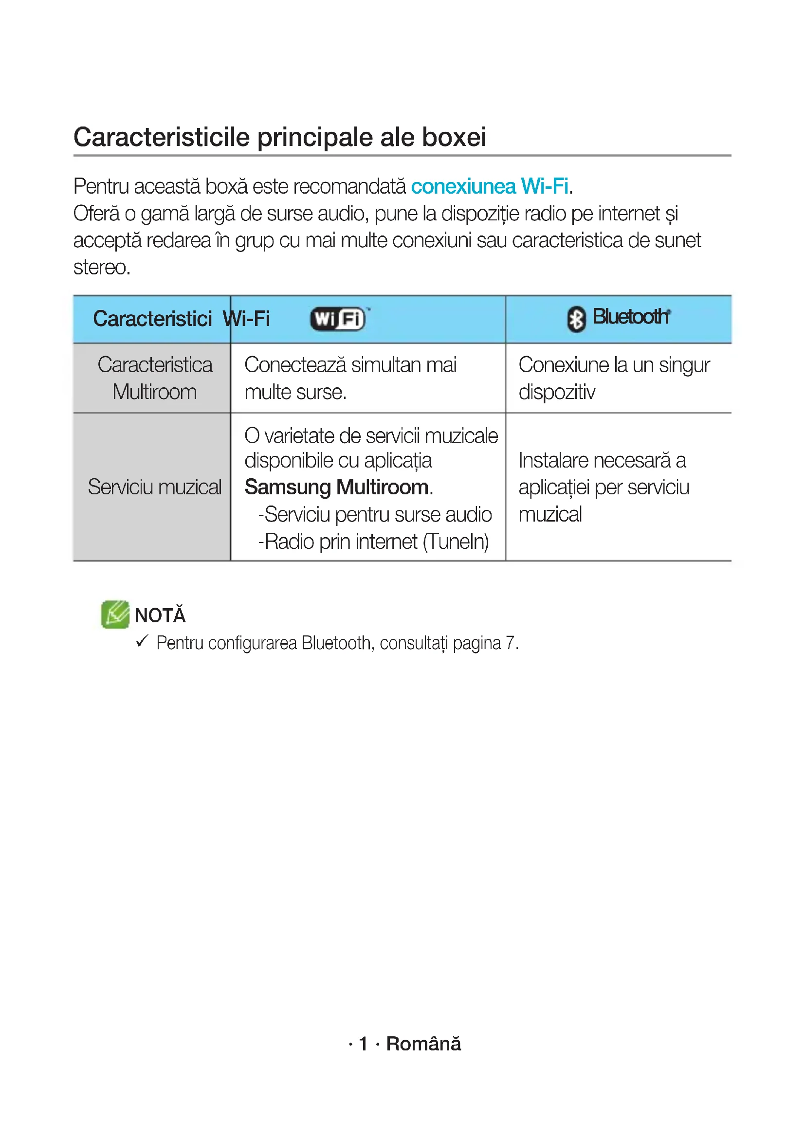 Jeśli nie można ustanowić połączenia, należy zapoznać się z sekcją „Lista kontrolna przed podłączeniem” na stronach 9 i 10. WAM3501-EN_15p-POL-QSG_0901.indd 15 2016-09-01 4:58:31· 1 · Română Caracteristicile principale ale boxei Pentru această boxă este recomandată conexiunea Wi-Fi. Oferă o gamă largă de surse audio, pune la dispoziție radio pe internet și acceptă redarea în grup cu mai multe conexiuni sau caracteristica de sunet stereo. Caracteristici Wi-Fi Bluetooth Caracteristica Multiroom Conectează simultan mai multe surse. Conexiune la un singur dispozitiv Serviciu muzical O varietate de servicii muzicale disponibile cu aplicaţia Samsung Multiroom. - Serviciu pentru surse audio - Radio prin internet (TuneIn) Instalare necesară a aplicaţiei per serviciu muzical NOTĂ
