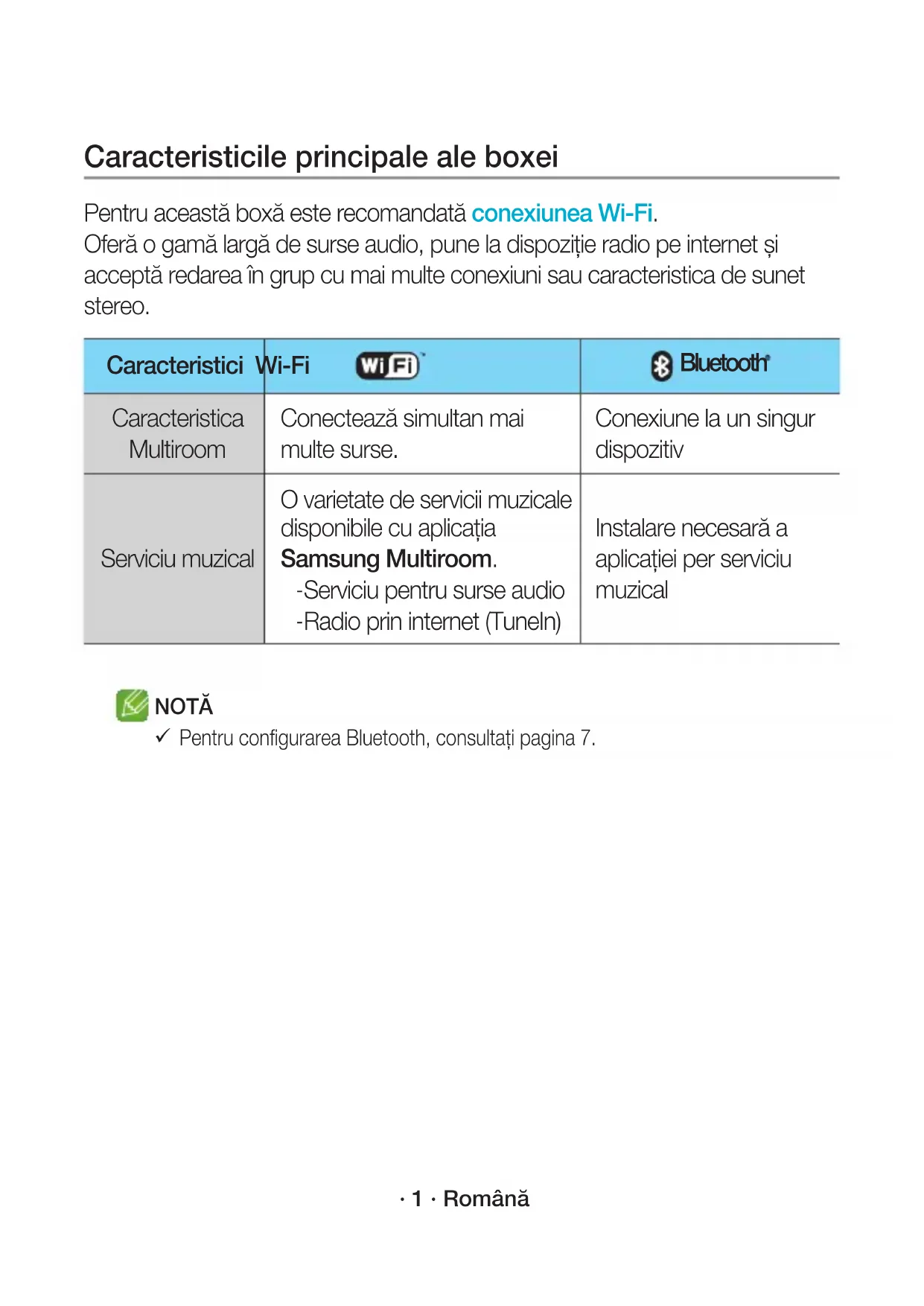 Jeśli nie można ustanowić połączenia, należy zapoznać się z sekcją „Lista kontrolna przed podłączeniem” na stronach 9 i 10. WAM1501-EN_15p-POL-QSG_0901.indd 15 2016-09-01 5:03:02· 1 · Română Caracteristicile principale ale boxei Pentru această boxă este recomandată conexiunea Wi-Fi. Oferă o gamă largă de surse audio, pune la dispoziție radio pe internet și acceptă redarea în grup cu mai multe conexiuni sau caracteristica de sunet stereo. Caracteristici Wi-Fi Bluetooth Caracteristica Multiroom Conectează simultan mai multe surse. Conexiune la un singur dispozitiv Serviciu muzical O varietate de servicii muzicale disponibile cu aplicaţia Samsung Multiroom. - Serviciu pentru surse audio - Radio prin internet (TuneIn) Instalare necesară a aplicaţiei per serviciu muzical NOTĂ
