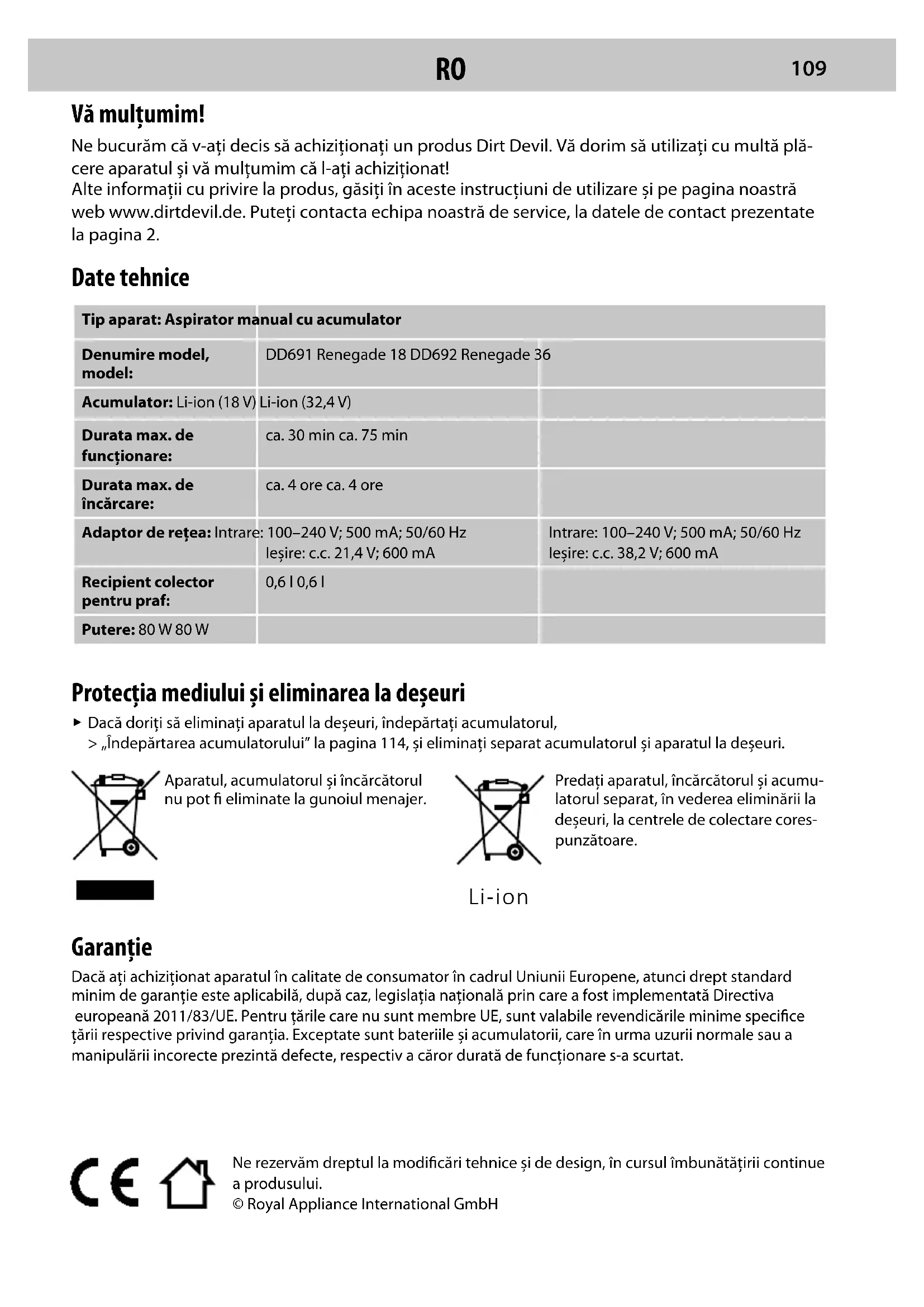 Dacă doriţi să eliminaţi aparatul la deşeuri, îndepărtaţi acumulatorul, > „Îndepărtarea acumulatorului” la pagina 114, şi eliminaţi separat acumulatorul şi aparatul la deşeuri.Aparatul, acumulatorul şi încărcătorul nu pot eliminate la gunoiul menajer.Predaţi aparatul, încărcătorul şi acumu-latorul separat, în vederea eliminării la deşeuri, la centrele de colectare cores-punzătoare. Garanţie Dacă aţi achiziţionat aparatul în calitate de consumator în cadrul Uniunii Europene, atunci drept standard minim de garanţie este aplicabilă, după caz, legislaţia naţională prin care a fost implementată Directiva europeană 2011/83/UE. Pentru ţările care nu sunt membre UE, sunt valabile revendicările minime specice ţării respective privind garanţia. Exceptate sunt bateriile şi acumulatorii, care în urma uzurii normale sau a manipulării incorecte prezintă defecte, respectiv a căror durată de funcţionare s-a scurtat. Li-ion Ne rezervăm dreptul la modicări tehnice şi de design, în cursul îmbunătăţirii continue a produsului.© Royal Appliance International GmbH Date tehnice Tip aparat: Aspirator manual cu acumulatorDenumire model, model:DD691 Renegade 18 DD692 Renegade 36Acumulator: Li-ion (18 V) Li-ion (32,4 V)Durata max. de funcţionare:ca. 30 min ca. 75 minDurata max. de încărcare:ca. 4 ore ca. 4 oreAdaptor de reţea: Intrare: 100–240 V; 500 mA; 50/60 HzIeşire: c.c. 21,4 V; 600 mAIntrare: 100–240 V; 500 mA; 50/60 HzIeşire: c.c. 38,2 V; 600 mARecipient colector pentru praf:0,6 l 0,6 lPutere: 80 W 80 W Vă mulţumim! Ne bucurăm că v-aţi decis să achiziţionaţi un produs Dirt Devil. Vă dorim să utilizaţi cu multă plă- cere aparatul şi vă mulţumim că l-aţi achiziţionat! Alte informaţii cu privire la produs, găsiţi în aceste instrucţiuni de utilizare şi pe pagina noastră web www.dirtdevil.de. Puteţi contacta echipa noastră de service, la datele de contact prezentate la pagina 2.RO