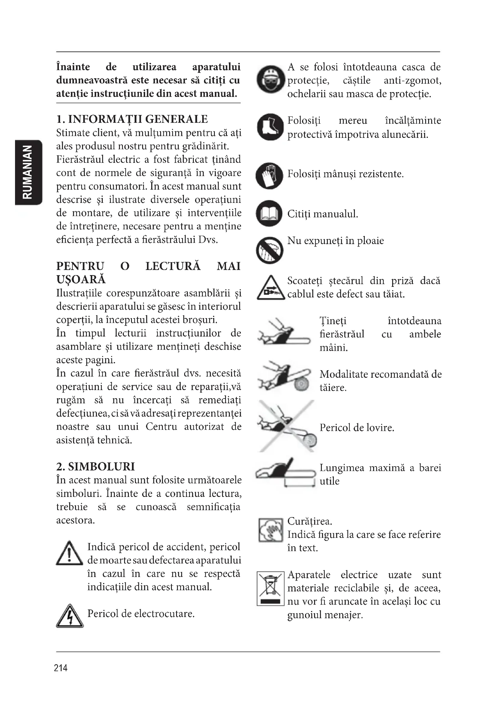 Stimate client, vă mulţumim pentru că aţi ales produsul nostru pentru grădinărit. Fierăstrăul electric a fost fabricat ținând cont de normele de siguranță în vigoare pentru consumatori. În acest manual sunt descrise şi ilustrate diversele operațiuni de montare, de utilizare şi intervenţiile de întreținere, necesare pentru a menține ecienţa perfectă a erăstrăului Dvs.