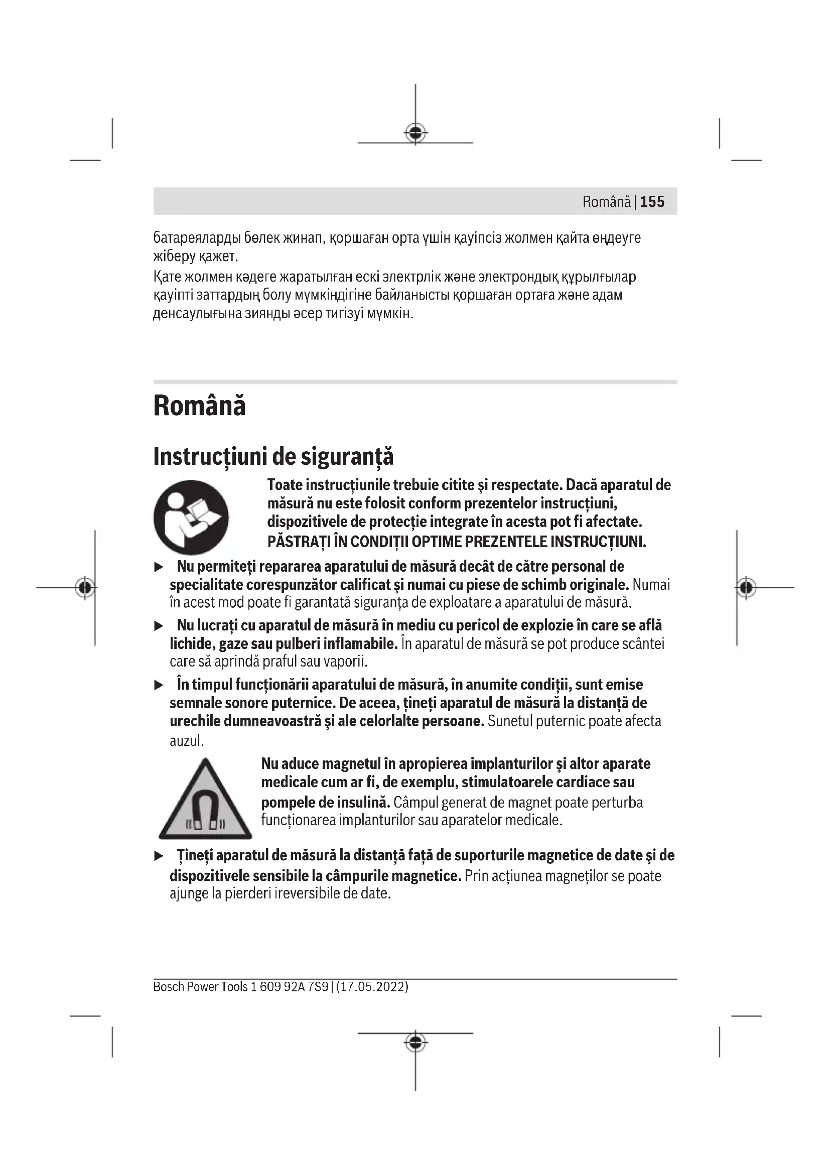 www.bosch-pt.com/serviceaddresses Кәдеге жарату Лазер қабылдағышын, керек-жарақтар мен орауыштарды қоршаған орта үшін қауіпсіз жолмен кәдеге жарату орнына тапсыру қажет. Лазер қабылдағышын және батареяларды тұрмыстық қоқысқа тастамаңыз! Тек қана ЕО елдері үшін: Ескі электрлік және электрондық құрылғылар туралы 2012/19/EU еуропалық директивасы және оның ұлттық заңнамада қолданылуы бойынша пайдалануға бұдан былай жарамсыз лазер қабылдағыштарын және 2006/66/ЕC еуропалық директивасы бойынша зақымдалған немесе ескірген аккумуляторларды/ 1 609 92A 7S9 | (17.05.2022) Bosch Power ToolsRomână | 155 батареяларды бөлек жинап, қоршаған орта үшін қауіпсіз жолмен қайта өңдеуге жіберу қажет. Қате жолмен кәдеге жаратылған ескі электрлік және электрондық құрылғылар қауіпті заттардың болу мүмкіндігіне байланысты қоршаған ортаға және адам денсаулығына зиянды әсер тигізуі мүмкін. Română Instrucţiuni de siguranţă Toate instrucţiunile trebuie citite şi respectate. Dacă aparatul de măsură nu este folosit conform prezentelor instrucţiuni, dispozitivele de protecţie integrate în acesta pot fi afectate. PĂSTRAŢI ÎN CONDIŢII OPTIME PREZENTELE INSTRUCŢIUNI. u Nu permiteţi repararea aparatului de măsură decât de către personal de specialitate corespunzător calificat şi numai cu piese de schimb originale. Numai în acest mod poate fi garantată siguranţa de exploatare a aparatului de măsură. u Nu lucraţi cu aparatul de măsură în mediu cu pericol de explozie în care se află lichide, gaze sau pulberi inflamabile. În aparatul de măsură se pot produce scântei care să aprindă praful sau vaporii. u În timpul funcţionării aparatului de măsură, în anumite condiţii, sunt emise semnale sonore puternice. De aceea, ţineţi aparatul de măsură la distanţă de urechile dumneavoastră şi ale celorlalte persoane. Sunetul puternic poate afecta auzul. Nu aduce magnetul în apropierea implanturilor şi altor aparate medicale cum ar fi, de exemplu, stimulatoarele cardiace sau pompele de insulină. Câmpul generat de magnetpoate perturba funcţionarea implanturilor sau aparatelor medicale. u Ţineţi aparatul de măsură la distanţă faţă de suporturile magnetice de date şi de dispozitivele sensibile la câmpurile magnetice. Prin acţiunea magneţilor se poate ajunge la pierderi ireversibile de date. Bosch Power Tools 1 609 92A 7S9 | (17.05.2022)156 | Română Descrierea produsului şi a performanțelor sale Ţineţi cont de ilustraţiile din secţiunea anterioară a instrucţiunilor de utilizare. Utilizarea conform destinaţiei Receptorul laser este destinat detectării rapide a fasciculelor laser cu unde pulsatorii. Pentru a afla ce nivelă laser cu liniiBosch este compatibilă cu receptorul laser, consultă instrucţiunile de utilizare a nivelei laser cu linii. Receptorul laser este adecvat pentru utilizarea în mediu interior şi exterior. Componentele ilustrate Numerotarea componentelor ilustrate se referă la schiţa receptorului laser, de la pagina grafică. (1) Tastă de reglare a preciziei de recepţie (2) Tastă de pornire/oprire (3) Indicator de stare (4) Tastă pentru semnalul sonor (5) Difuzor (6) Indicator de direcţie cu LED „Fascicul laser deasupra liniei centrale” (7) Linie centrală cu LED (8) Indicator de direcţie cu LED „Fascicul laser sub linia centrală” (9) Câmp de recepţie pentru fasciculul laser (10) Magneţi (11) Canelură de ghidare pentru suport (12) Marcaj median (13) Număr de serie (14) Capac al compartimentului pentru baterii (15) Dispozitiv de blocare a capacului compartimentului pentru baterii (16) Suport
