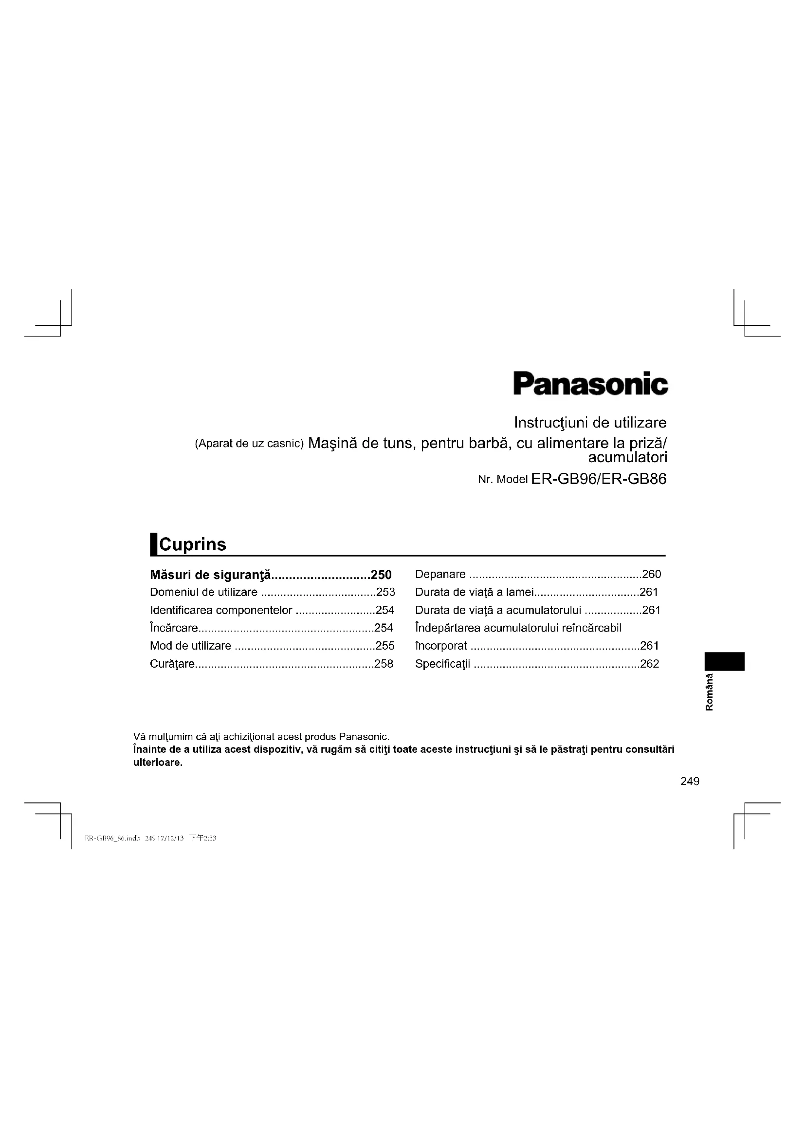 - Când aparatul nu este utilizat 6 luni sau mai mult, acumulatorul poate da semne de uzură (scurgeri ale lichidului acumulatorului etc.). Încărcaţi complet acumulatorul o dată la 6 luni. ER-GB96_86.indb 256 17/12/13 下午2:33257 Română