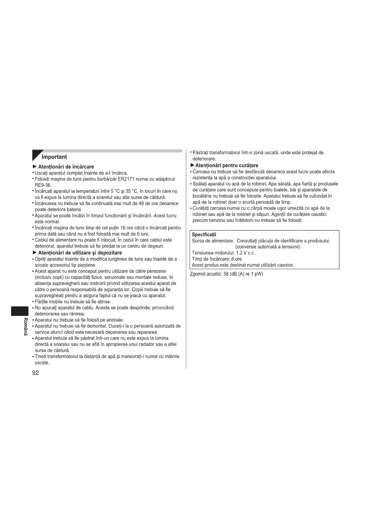 Aceastá masina de tuns contine o baterie nickel-metal hidrid. Vá rugam sa va asiguratá că bateria este eliminata la un centru desemnat oficial, dacă există unul in tara dvs.