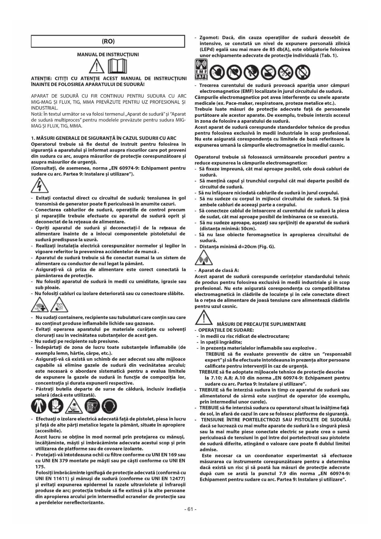 este indicată în capitolul 1 „Măsuri de siguranţă generale pentru sudura cu arc electric”. Observaţie: Exemplul de placă indicatoare prezentat este orientativ în ceea ce priveşte semnicaţia simbolurilor şi a cifrelor; valorile exacte ale datelor tehnice ale aparatului de sudură achiziţionat trebuie să e indicate direct pe placa indicatoare a aparatului respectiv. ALTE DATE TEHNICE: - APARAT DE SUDURĂ: a se vedea tabelul 1 (TAB. 1) - PISTOLET MIG: a se vedea tabelul 2 (TAB. 2) - PISTOLET TIG: a se vedea tabelul 3 (TAB. 3) - CLEŞTE PORT-ELECTROD: a se vedea tabelul 4 (TAB. 4) Greutatea aparatului de sudură este menţionată în tabelul 1 (TAB. 1).