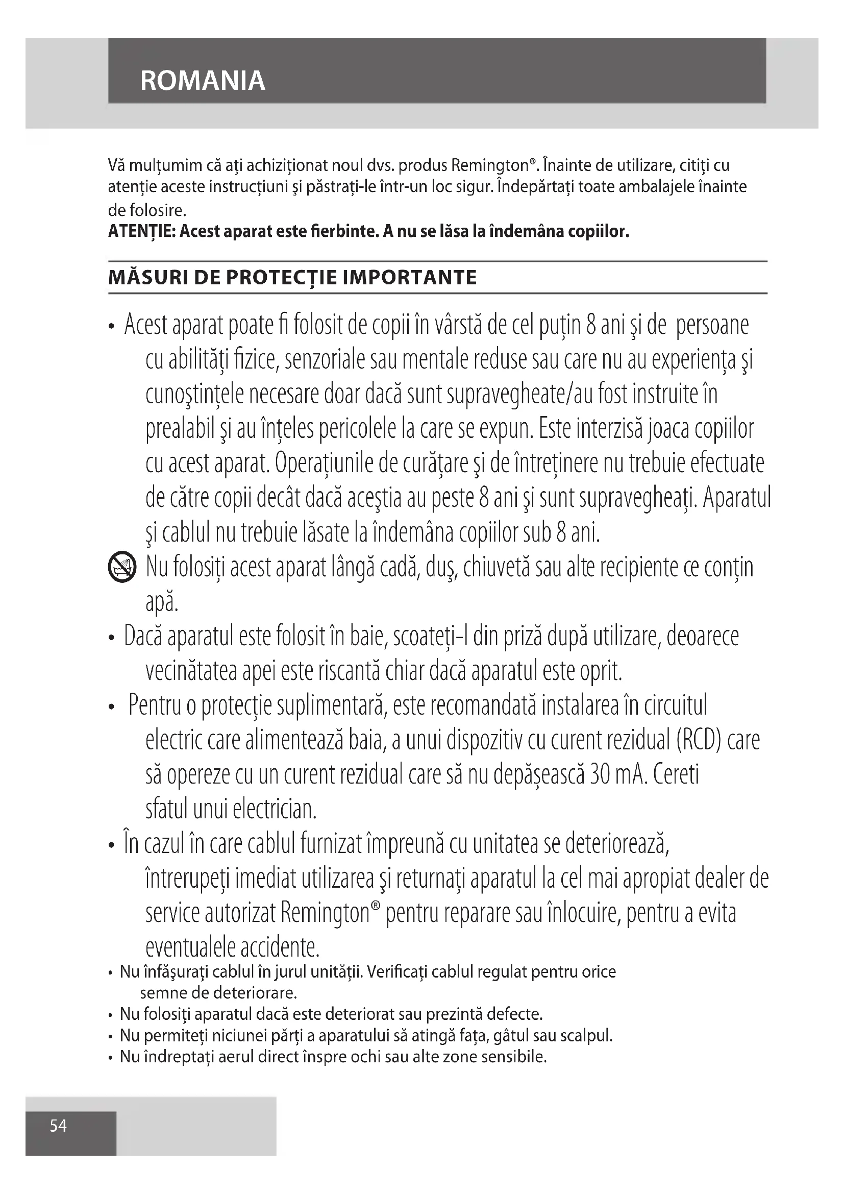 - În cazul în care cablul furnizat împreună cu unitatea se deteriorează, întrerupeţi imediat utilizarea şi returnaţi aparatul la cel mai apropiat dealer de service autorizat Remington® pentru reparare sau înlocuire, pentru a evita eventualele accidente.