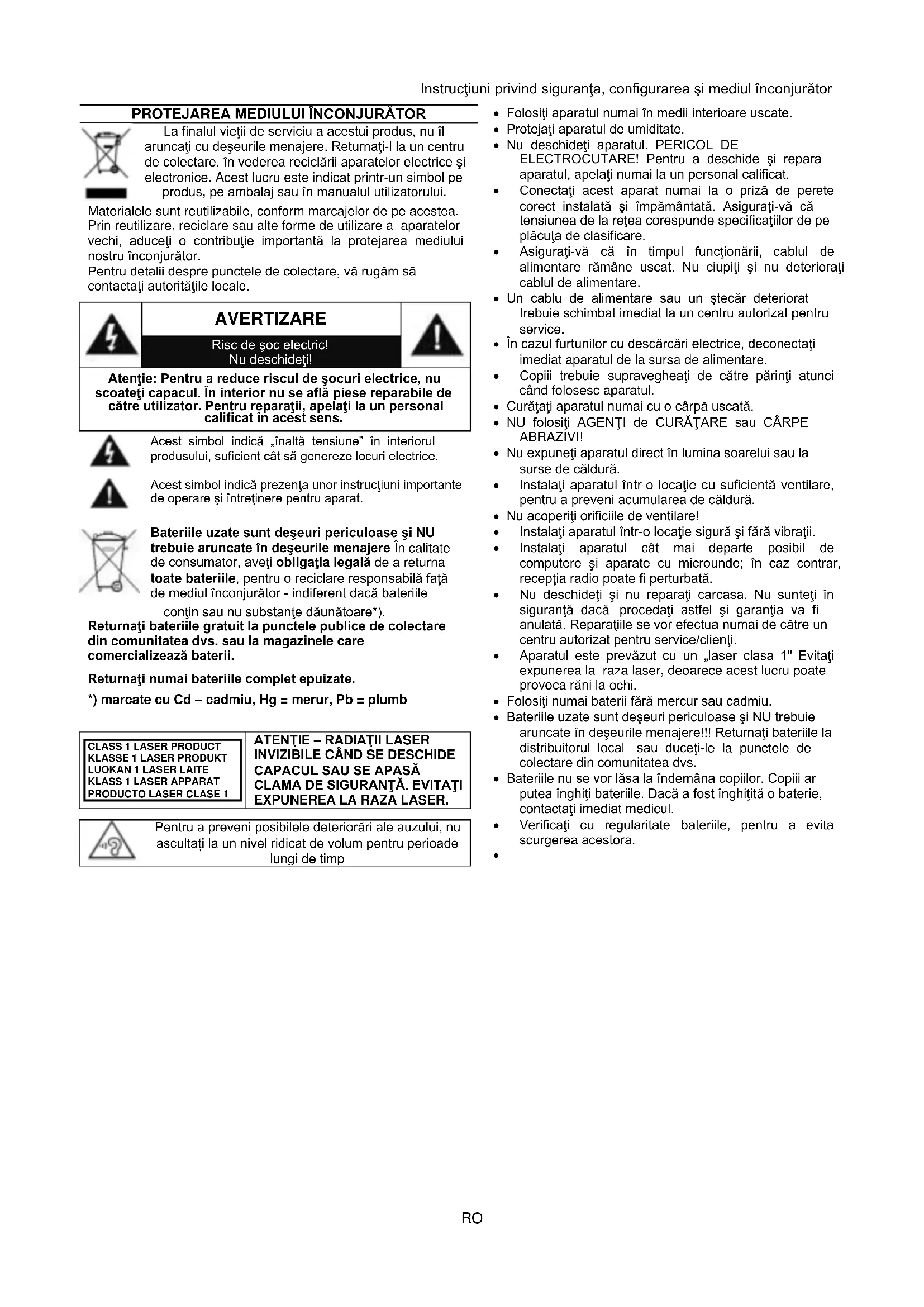 - Aparatul este prevazut cu un „laser clasa 1" Evitatj expunerea la raza laser, deoarece acest lucru poate provocarani la ochi.