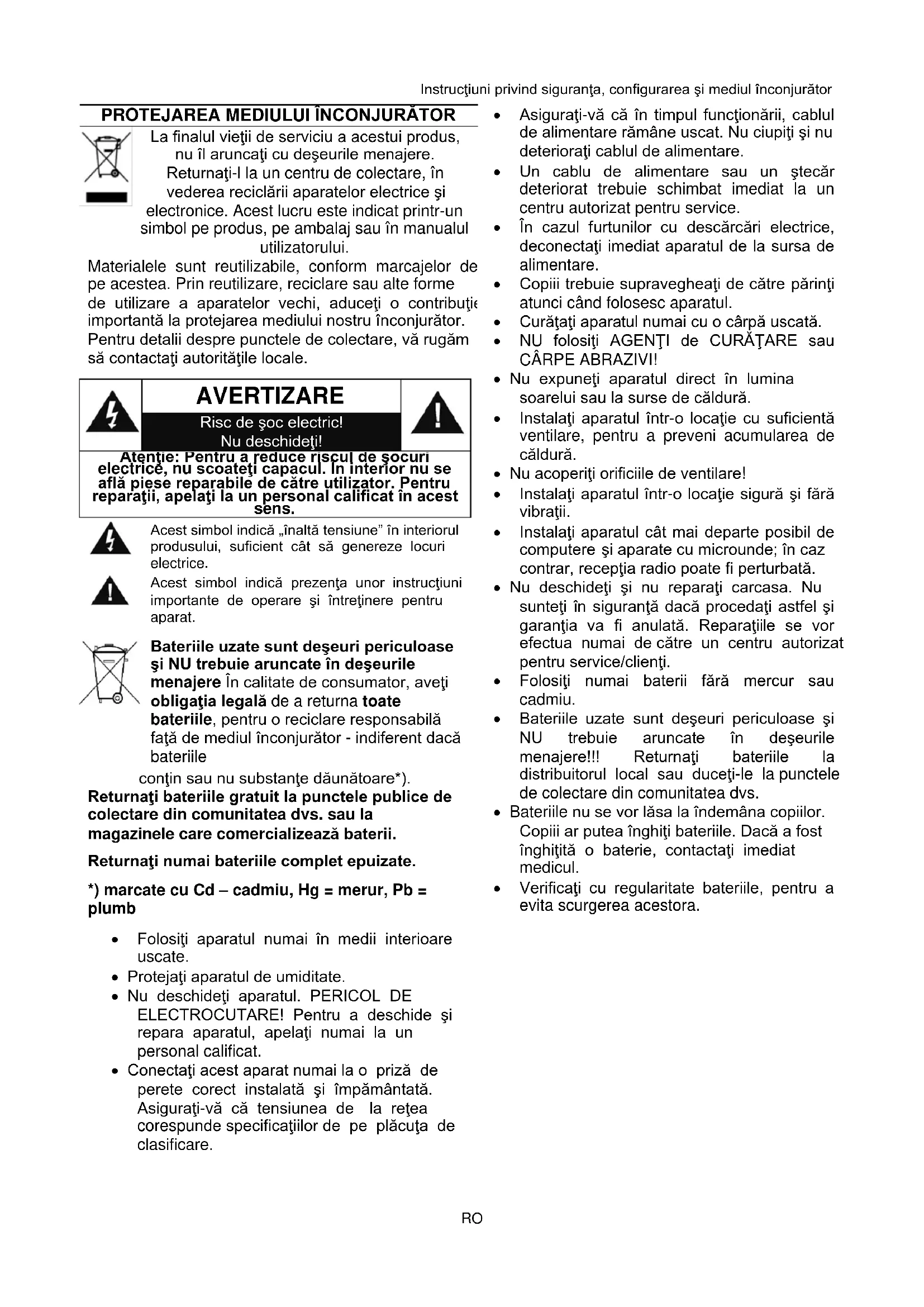 Bateriile uzate sunt deseuri periculoase si NU trebuie aruncate in deseurile menajere!! Returnati bateriile la distribuitorul local sau duceti-le la punctele de colectare din comunitatea dvs. - Bateriile nu se vor lasa la indemâna copiilor. Copii ar putea inghitj bateriile. Daca a fost inghitita o baterie, contactati imediat medicul.