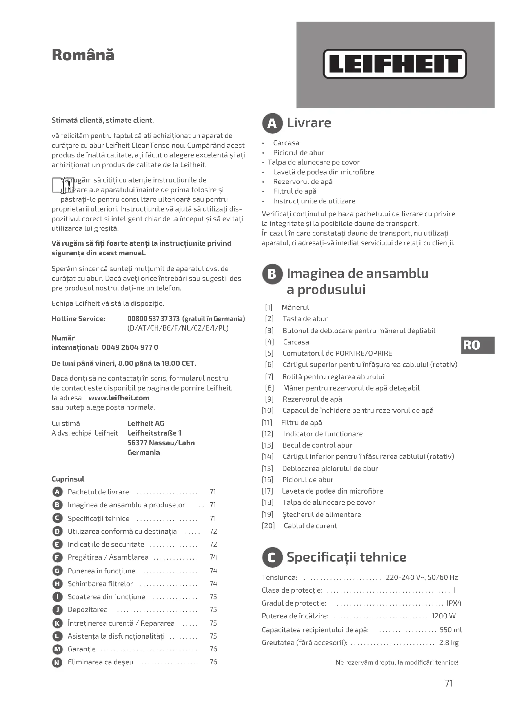 - Instrucțiuniledeutilizare Vericațiconținutulpebazapachetuluidelivrarecuprivire laintegritateșilaposibileledaunedetransport. Încazulîncareconstatațidaunedetransport,nuutilizați aparatul,ciadresați-văimediatserviciuluiderelațiicuclienții. Stimatăclientă,stimateclient, văfelicitămpentrufaptulcăațiachiziționatunaparatde curățarecuaburLeifheit CleanTensonou.Cumpărândacest produsdeînaltăcalitate,ațifăcutoalegereexcelentășiați achiziționatunprodusdecalitatedelaLeifheit. Vărugămsăcitițicuatențieinstrucțiunilede utilizarealeaparatuluiînaintedeprimafolosireși păstrați-lepentruconsultareulterioarăsaupentru proprietariiulteriori.Instrucțiunilevăajutăsăutilizațidis- pozitivulcorectșiinteligentchiardelaînceputșisăevitați utilizarealuigreșită. Vă rugăm să ți foarte atenți la instrucțiunile privind siguranța din acest manual. Sperămsincercăsuntețimulțumitdeaparatuldvs.de curățatcuabur.Dacăavețioriceîntrebărisausugestiides- preprodusulnostru,dați-neuntelefon. EchipaLeifheitvăstăladispoziție. Hotline Service: 00800 537 37 373 (gratuit în Germania)