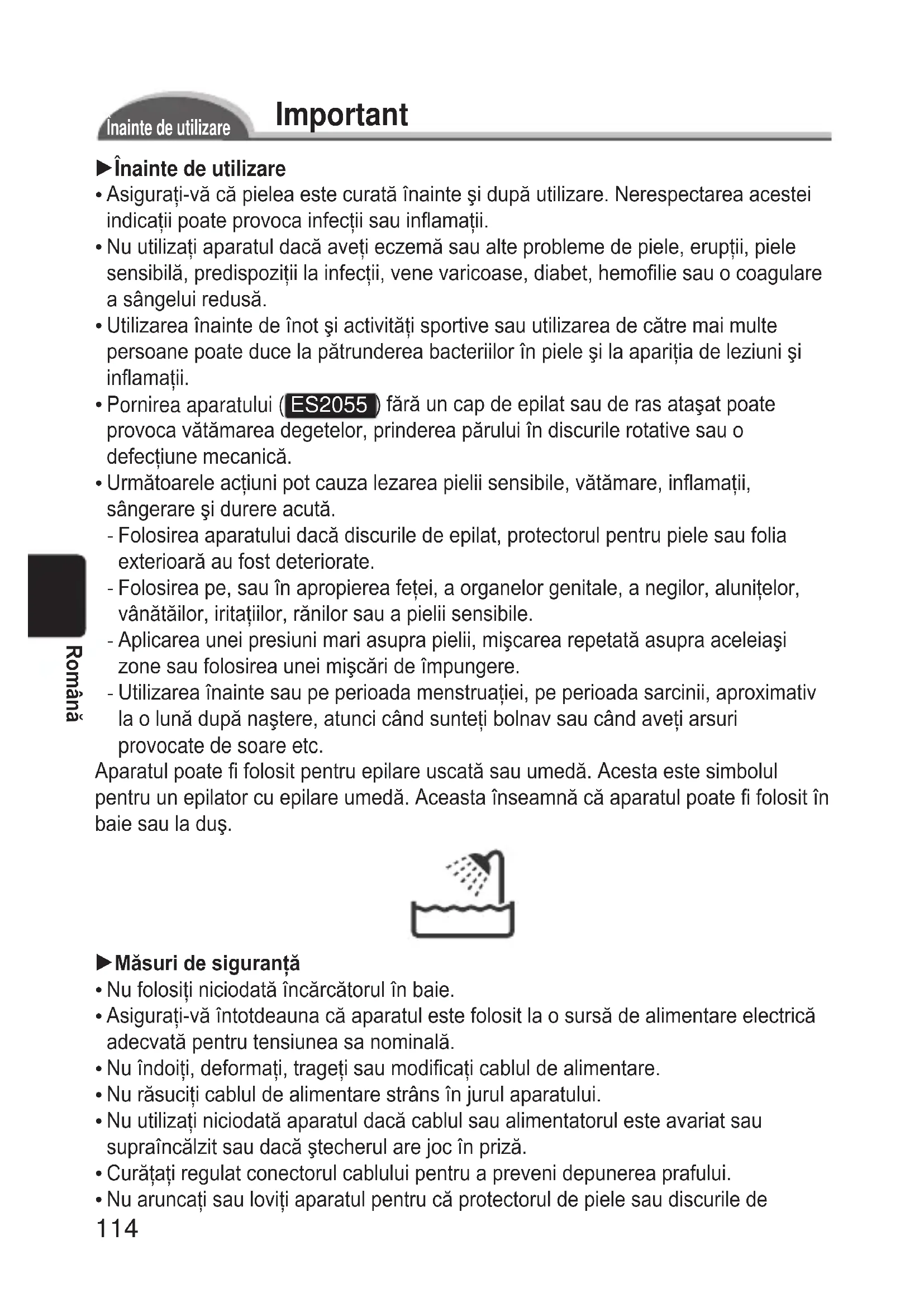 Uvoľňovacie tlačidlo rámu Príslušenstvo: Nabíjačka (RE7- 44), čistiaca kefka a puzdro (Nepoužívajte iné príslušenstvo než je dodané.)114 Română Important Înainte de utilizare 1Înainte de utilizare Asiguraţi-vă că pielea este curată înainte şi după utilizare. Nerespectarea acestei indicaţii poate provoca infecţii sau inamaţii. Nu utilizaţi aparatul dacă aveţi eczemă sau alte probleme de piele, erupţii, piele sensibilă, predispoziţii la infecţii, vene varicoase, diabet, hemolie sau o coagulare a sângelui redusă. Utilizarea înainte de înot şi activităţi sportive sau utilizarea de către mai multe persoane poate duce la pătrunderea bacteriilor în piele şi la apariţia de leziuni şi inamaţii. Pornirea aparatului ( ES2055 ) fără un cap de epilat sau de ras ataşat poate provoca vătămarea degetelor, prinderea părului în discurile rotative sau o defecţiune mecanică. Următoarele acţiuni pot cauza lezarea pielii sensibile, vătămare, inamaţii, sângerare şi durere acută. Folosirea aparatului dacă discurile de epilat, protectorul pentru piele sau folia exterioară au fost deteriorate. Folosirea pe, sau în apropierea feţei, a organelor genitale, a negilor, aluniţelor, vânătăilor, iritaţiilor, rănilor sau a pielii sensibile. Aplicarea unei presiuni mari asupra pielii, mişcarea repetată asupra aceleiaşi zone sau folosirea unei mişcări de împungere. Utilizarea înainte sau pe perioada menstruaţiei, pe perioada sarcinii, aproximativ la o lună după naştere, atunci când sunteţi bolnav sau când aveţi arsuri provocate de soare etc. Aparatul poate folosit pentru epilare uscată sau umedă. Acesta este simbolul pentru un epilator cu epilare umedă. Aceasta înseamnă că aparatul poate folosit în baie sau la duş. 1Măsuridesiguranţă Nu folosiţi niciodată încărcătorul în baie. Asiguraţi-vă întotdeauna că aparatul este folosit la o sursă de alimentare electrică adecvată pentru tensiunea sa nominală. Nu îndoiţi, deformaţi, trageţi sau modicaţi cablul de alimentare. Nu răsuciţi cablul de alimentare strâns în jurul aparatului. Nu utilizaţi niciodată aparatul dacă cablul sau alimentatorul este avariat sau supraîncălzit sau dacă ştecherul are joc în priză. Curăţaţi regulat conectorul cablului pentru a preveni depunerea prafului. Nu aruncaţi sau loviţi aparatul pentru că protectorul de piele sau discurile de