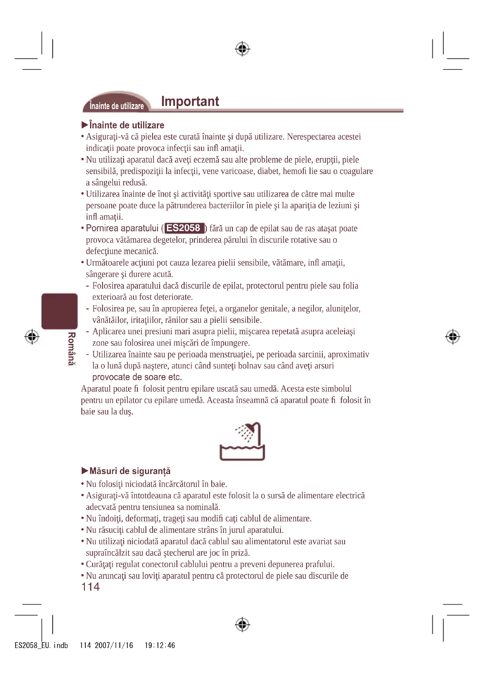 Uvoľňovacie tlačidlo rámu Príslušenstvo: Nabíjačka (RE7-44), čistiaca kefka a puzdro (Nepoužívajte iné príslušenstvo než je dodané.) ES2058_EU.indb 113 2007/11/16 19:12:45114 Română Important Înainte de utilizare Înainte de utilizare Asiguraţi-vă că pielea este curată înainte şi după utilizare. Nerespectarea acestei indicaţii poate provoca infecţii sau infl amaţii. Nu utilizaţi aparatul dacă aveţi eczemă sau alte probleme de piele, erupţii, piele sensibilă, predispoziţii la infecţii, vene varicoase, diabet, hemofi lie sau o coagulare a sângelui redusă. Utilizarea înainte de înot şi activităţi sportive sau utilizarea de către mai multe persoane poate duce la pătrunderea bacteriilor în piele şi la apariţia de leziuni şi infl amaţii. Pornirea aparatului ( ES2058 ) fără un cap de epilat sau de ras ataşat poate provoca vătămarea degetelor, prinderea părului în discurile rotative sau o defecţiune mecanică. Următoarele acţiuni pot cauza lezarea pielii sensibile, vătămare, infl amaţii, sângerare şi durere acută. Folosirea aparatului dacă discurile de epilat, protectorul pentru piele sau folia exterioară au fost deteriorate. Folosirea pe, sau în apropierea feţei, a organelor genitale, a negilor, aluniţelor, vânătăilor, iritaţiilor, rănilor sau a pielii sensibile. Aplicarea unei presiuni mari asupra pielii, mişcarea repetată asupra aceleiaşi zone sau folosirea unei mişcări de împungere. Utilizarea înainte sau pe perioada menstruaţiei, pe perioada sarcinii, aproximativ la o lună după naştere, atunci când sunteţi bolnav sau când aveţi arsuri provocate de soare etc. Aparatul poate fi folosit pentru epilare uscată sau umedă. Acesta este simbolul pentru un epilator cu epilare umedă. Aceasta înseamnă că aparatul poate fi folosit în baie sau la duş. Măsuri de siguranţă Nu folosiţi niciodată încărcătorul în baie. Asiguraţi-vă întotdeauna că aparatul este folosit la o sursă de alimentare electrică adecvată pentru tensiunea sa nominală. Nu îndoiţi, deformaţi, trageţi sau modifi caţi cablul de alimentare. Nu răsuciţi cablul de alimentare strâns în jurul aparatului. Nu utilizaţi niciodată aparatul dacă cablul sau alimentatorul este avariat sau supraîncălzit sau dacă ştecherul are joc în priză. Curăţaţi regulat conectorul cablului pentru a preveni depunerea prafului. Nu aruncaţi sau loviţi aparatul pentru că protectorul de piele sau discurile de
