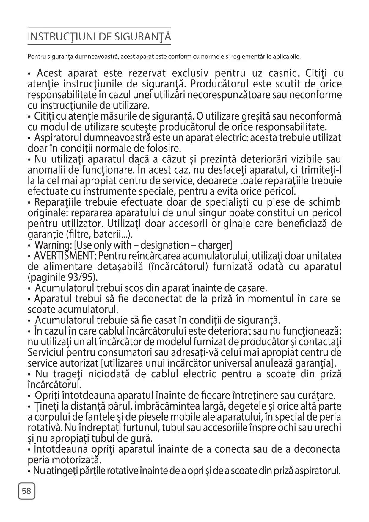 - Reparatiile trebuie efectuate doar de specialisti cusie de schimb originale: repararea aparatului de unul singur poate constitui un pericol pentru UTILIZATI doar accesorii originale care beneficiază de garantție (filtre, baterii...).