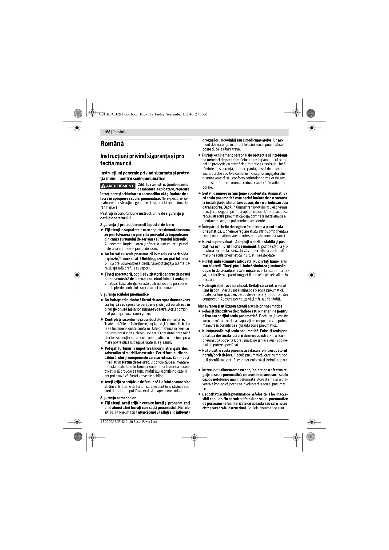 Егер пневматикалық құралды пайдаланып болмаса оны кәдеге жарату орталығына тапсырыңыз немесе дилерге, мысалы, өкілетті Bosch сервистік қызметіне, жіберіңіз. Техникалық өзгерістер енгізу құқығы сақталады. OBJ_BUCH-281-006.book Page 167 Monday, September 5, 2016 12:15 PM168 | Română 1 609 92A 39P | (2.9.16) Bosch Power Tools Română Instrucţiuni privind siguranţa şi pro- tecţia muncii Instrucţiuni generale privind siguranţa şi protec- ţia muncii pentru scule pneumatice Citiţi toate instrucţiunile înainte de montare, exploatare, reparare, întreţinere şi schimbare a accesoriilor cât şi înainte de a lucra în apropierea sculei pneumatice. Nerespectarea ur- mătoarelor instrucţiuni generale de siguranţă poate duce la răniri grave. Păstraţi în condiţii bune instrucţiunile de siguranţă şi daţi-le operatorului. Siguranţa şi protecţia muncii la postul de lucru Fiţi atenţi la suprafeţele care ar putea deveni alunecoa- se prin folosirea maşinii şi la pericolul de împiedicare din cauza furtunului de aer sau a furtunului hidraulic. Alunecarea, împiedicarea şi căderea sunt cauzele princi- pale la rănirilor de la postul de lucru. Nu lucraţi cu scula pneumatică în mediu cu pericol de explozie, în care se află lichide, gaze sau praf inflama- bil. La prelucrarea piesei de lucru se pot degaja scântei ca- re să aprindă praful sau vaporii. Ţineţi spectatorii, copiii şi vizitatorii departe de postul dumneavoastră de lucru atunci când folosiţi scula pne- umatică. Dacă atenţia vă este distrasă de alte persoane puteţi pierde controlul asupra sculei pneumatice. Siguranţa sculelor pneumatice Nu îndreptaţi niciodată fluxul de aer spre dumneavoas- tră înşivă sau spre alte persoane şi dirijaţi aerul rece în direcţie opusă mâinilor dumneavoastră. Aerul compri- mat poate provoca răniri grave. Controlaţi racordurile şi conductele de alimentare. Toate unităţile de întreţinere, cuplajele şi furtunurile trebu- ie să fie dimensionate conform Datelor tehnice în ceea ce priveşte presiunea şi debitul de aer. O presiune prea mică afectează funcţionarea sculei pneumatice, o presiune prea mare poate duce la pagube materiale şi răniri. Potejaţi furtunurile împotriva îndoirii, strangulărilor, solvenţilor şi muchiilor ascuţite. Feriţi furtunurile de căldură, ulei şi componente care se rotesc. Schimbaţi imediat un furtun deteriorat. O conductă de alimentare defectă poate face furtunul pneumatic să lovească necon- trolat şi să provoace răniri. Praful sau aşchiile ridicate în aer pot cauza vătămări grave ale ochilor. Aveţi grijă ca brăţările de furtun să fie întotdeaune bine strânse. Brăţările de furtun care nu sunt bine strânse sau sunt deteriorate pot lăsa aerul să scape necontrolat. Siguranţa persoanelor Fiţi atenţi, aveţi grijă la ceea ce faceţi şi procedaţi raţi- onal atunci când lucraţi cu o sculă pneumatică. Nu folo- siţi scula pneumatică atunci când vă aflaţi sub influenţa drogurilor, alcoolului sau a medicamentelor. Un mo- ment de neatenţie în timpul folosirii sculei pneumatice poate duce la răniri grave. Purtaţi echipament personal de protecţie şi întotdeau- na ochelari de potecţie. Folosirea echipamentului perso- nal de protecţie ca mască de protecţie a respiraţiei, încăl- ţăminte de siguranţă, antiderapantă, cască de protecţie sau protecţie auditivă conform indicaţiilor angajatorului dumneavoastră sau conform cerinţelor normelor de secu- ritate şi protecţie a muncii, reduce riscul vătămărilor cor- porale. Evitaţi o punere în funcţiune accidentală. Asiguraţi-vă că scula pneumatică este oprită înainte de a o racorda la instalaţia de alimentare cu aer, de a o prinde sau de a o transporta. Dacă, în timpul transportului sculei pneuma- tice, ţineţi degetul pe întrerupătorul pornit/oprit sau dacă racordaţi scula pneumatică deja pornită la instalaţia de ali- mentare cu aer, se pot produce accidente. Îndepăraţi cheile de reglare înainte de a porni scula pneumatică. O cheie de reglare aflată într-o componentă a sculei pneumatice care se roteşte, poate provoca răniri. Nu vă supraevaluaţi. Adoptaţi o poziţie stabilă şi păs- traţi-vă echilibrul în orice moment. O poziţie stabilă şi o postură corporală adecvată vă vor permite să controlaţi mai bine scula pneumatică în situaţii neaşteptate. Purtaţi îmbrăcăminte adecvată. Nu purtaţi haine largi sau bijuterii. Ţineţi părul, îmbrăcămintea şi mănuşile departe de piesele aflate în mişcare. Îmbrăcămintea lar- gă, bijuteriile sau părul lung pot fi prinse în piesele aflate în mişcare. Nu inspiraţi direct aerul uzat. Evitaţi să vă intre aerul uzat în ochi. Aerul uzat eliminat de o sculă pneumatică poate conţine apă, ulei, particule de metal şi impurităţi din compresor. Acestea pot cauza vătămări ale sănătăţii. Manevrarea şi utilizarea atentă a sculelor pneumatice Folosiţi dispozitive de prindere sau o menghină pentru a fixa sau sprijini scula pneumatică. Dacă fixaţi piesa de lucru cu mâna sau dacă o apăsaţi cu corpul, nu veţi putea manevra în condiţii de siguranţă scula pneumatică. Nu suprasolicitaţi scula pneumatică. Folosiţi scula pne- umatică destinată lucrării dumneavoastră. Cu o sculă pneumatică potrivită lucraţi mai bine şi mai sigur în dome- niul de putere specificat. Nu folosiţi o sculă pneumatică dacă are întrerupătorul pornit/oprit defect. O sculă pneumatică, care nu mai poa- te fi pornită sau oprită, este periculoasă şi trebuie repara- tă. Întrerupeţi alimentarea cu aer, înainte de a efectua re- glaje la scula pneumatică, de a schimba accesorii sau în caz de nefolosire mai îndelungată. Aceas