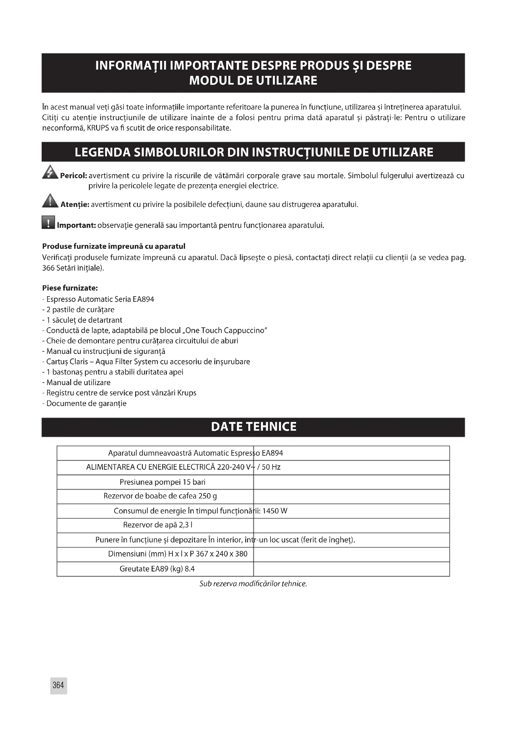 Important: observație generală sau importantă pentru funcționarea aparatului. Produse furnizate împreună cu aparatul Vericați produsele furnizate împreună cu aparatul. Dacă lipsește o piesă, contactați direct relații cu clienții (a se vedea pag. 366 Setări inițiale). Piese furnizate: - Espresso Automatic Seria EA894 - 2 pastile de curățare - 1 săculeț de detartrant - Conductă de lapte, adaptabilă pe blocul „One Touch Cappuccino” - Cheie de demontare pentru curățarea circuitului de aburi - Manual cu instrucțiuni de siguranță - Cartuș Claris – Aqua Filter System cu accesoriu de înșurubare - 1 bastonaș pentru a stabili duritatea apei - Manual de utilizare - Registru centre de service post vânzări Krups - Documente de garanție DATE TEHNICE Aparatul dumneavoastră Automatic Espresso EA894 ALIMENTAREA CU ENERGIE ELECTRICĂ 220-240 V~ / 50 Hz Presiunea pompei 15 bari Rezervor de boabe de cafea 250 g Consumul de energie În timpul funcționării: 1450 W Rezervor de apă 2,3 l Punere în funcțiune și depozitare În interior, într-un loc uscat (ferit de îngheț). Dimensiuni (mm) H x l x P 367 x 240 x 380 Greutate EA89 (kg) 8.4 Sub rezerva modicărilor tehnice. 364DESCRIEREA APARATULUI A Capacul rezervorului de apăB Rezervor de apăC Colector de zațD Duză de ieșire a cafelei, reglabilă pe înățimeE Grilă și tavă detașabilă de colectare a picăturilorF Capacul recipientului pentru boabe de cafeaG Ansamblu detașabil One Touch CappuccinoG1 Cheie de demontare pentru curățarea circuitului aburuluiG2 Bloc de cappuccino cu o singură atingereH Furtun pentru lapte și conectorulI Plutitor pentru nivelul de apă Recipientul de boabe de cafeaJ Buton de reglare a neței măcinăriiK Conductă pastilă de curățareL Râșnită metalică Panou de comandăM Ecran OLEDN Buton PORNIT/OPRITO Taste de selectarePrecizări: Tava de colectare a picăturilor permite recuperarea apei sau a cafelei care ar putea curge din aparat în timpul preparării și după preparare. Este important să o lăsați întotdeauna la locul ei și să o goliți în mod regulat sau când plutitorul indică acest lucru.