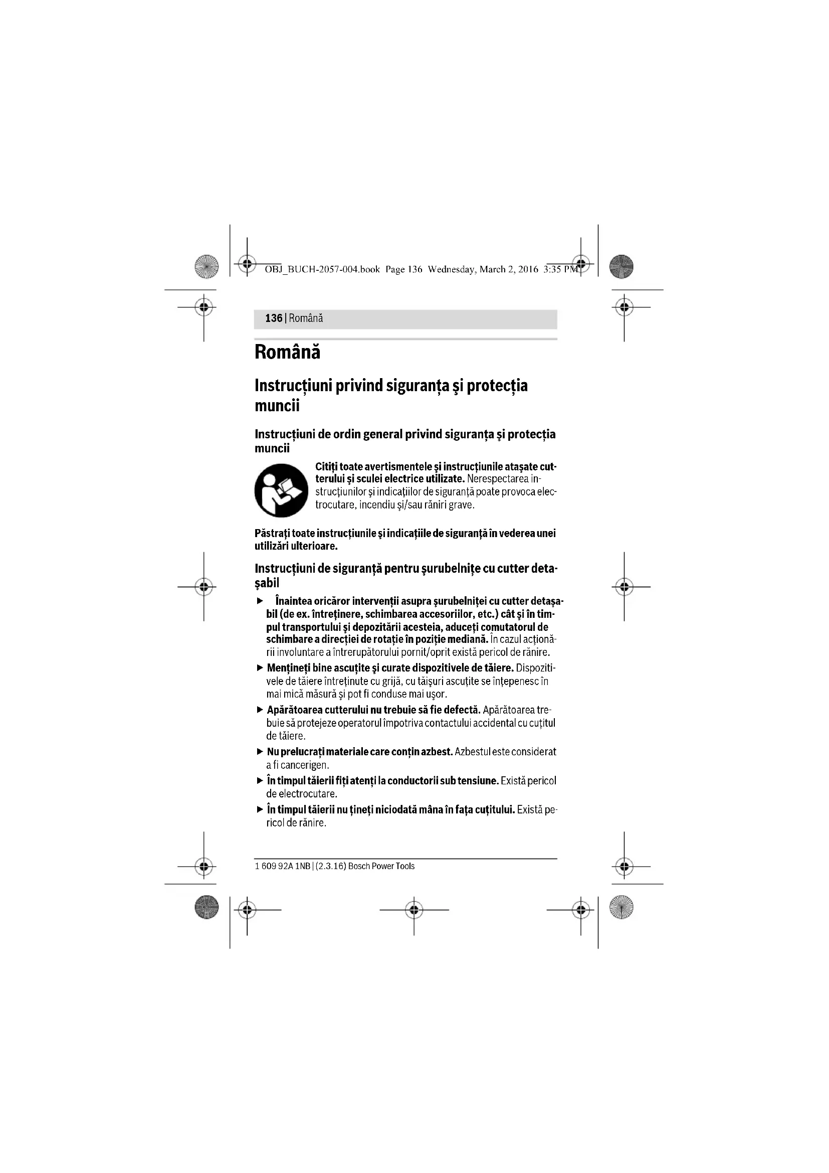 Райымбек данғылы Коммунальная көшесінің бұрышы, 169/1 Тел.: +7 (727) 232 37 07 Факс: +7 (727) 233 07 87 E-Mail: info.powertools.ka@bosch.com Ресми сайты: www.bosch.kz; www.bosch-pt.kz Кәдеге жарату Кесу жинағы, оның жабдықтары мен орамасын қоршаған ортаны қорғайтын кәдеге жарату орнына тапсыру қажет. Техникалық өзгерістер енгізу құқығы сақталады. OBJ_BUCH-2057-004.book Page 135 Wednesday, March 2, 2016 3:35 PM136 | Română 1 609 92A 1NB | (2.3.16) Bosch Power Tools Română Instrucţiuni privind siguranţa şi protecţia muncii Instrucţiuni de ordin general privind siguranţa şi protecţia muncii Citiţi toate avertismentele şi instrucţiunile ataşate cut- terului şi sculei electrice utilizate. Nerespectarea in- strucţiunilor şi indicaţiilor de siguranţă poate provoca elec- trocutare, incendiu şi/sau răniri grave. Păstraţi toate instrucţiunile şi indicaţiile de siguranţă în vederea unei utilizări ulterioare. Instrucţiuni de siguranţă pentru şurubelniţe cu cutter deta- şabil Înaintea oricăror intervenţii asupra şurubelniţei cu cutter detaşa- bil (de ex. întreţinere, schimbarea accesoriilor, etc.) cât şi în tim- pul transportului şi depozitării acesteia, aduceţi comutatorul de schimbare a direcţiei de rotaţie în poziţie mediană. În cazul acţionă- rii involuntare a întrerupătorului pornit/oprit există pericol de rănire. Menţineţi bine ascuţite şi curate dispozitivele de tăiere. Dispoziti- vele de tăiere întreţinute cu grijă, cu tăişuri ascuţite se înţepenesc în mai mică măsură şi pot fi conduse mai uşor. Apărătoarea cutterului nu trebuie să fie defectă. Apărătoarea tre- buie să protejeze operatorul împotriva contactului accidental cu cuţitul de tăiere. Nu prelucraţi materiale care conţin azbest. Azbestul este considerat a fi cancerigen. În timpul tăierii fiţi atenţi la conductorii sub tensiune. Există pericol de electrocutare. În timpul tăierii nu ţineţi niciodată mâna în faţa cuţitului. Există pe- ricol de rănire. OBJ_BUCH-2057-004.book Page 136 Wednesday, March 2, 2016 3:35 PMRomână | 137 Bosch Power Tools 1 609 92A 1NB | (2.3.16) Evitaţi pornirea accidentală. Transportul sculei electrice cu degetul ţinut pe întrerupătorul pornit/oprit poate duce la accidente. Supravegheaţi copiii. Astfel veţi avea siguranţa că, copiii nu se joacă cu cutterul sau cu şurubelniţa cu cutter detaşabil. Această şurubelniţă cu cutter detaşabil nu este destinată utilizării de către copii şi de către persoane cu capacităţi fizice, senzoriale sau intelectuale limitate sau lipsite de experienţă şi cunoştinţe. Această şurubelniţă cu cutter detaşabil poate fi folosită de către copiii mai mari de 8 ani şi de către persoane cu capacităţi fizice, senzoriale sau intelectuale limitate sau lipsite de experienţă şi cu- noştinţe, numai dacă acestea sunt supravegheate sau sunt instru- ite privitor la manevrarea sigură a şurubelniţei cu cutter detaşabil şi înţeleg pericolele pe care aceasta le implică. În caz contrar există pericol de manevrare greşită şi răniri. Descrierea produsului şi a performanţelor Utilizare conform destinaţiei Cutterul împreună cu şurubelniţa cu acumulator IXO, este destinat tăierii materialelor flexibile, moi, cu o grosime de până la 6 mm, precum moche- tă, PVC, carton, sortimente de piele, materiale textile şi altele asemănă- toare. Cutterul este destinat numai uzului privat din gospodărie şi poate fi folosit numai împreună cu următoarele scule electrice: – Bosch IXO (3 603 J81 0.., 3 603 J59 3.., 3 603 JA8 0..) Elemente componente Numerotarea componentelor ilustrate se referă la schiţele de la paginile grafice. 1 Cutter 2 Talpă de ghidare 3 Apărătoare 4 Inel de deblocare 5 Comutator de schimbare a direcţiei de rotaţie 6 Întrerupător pornit/oprit 7 Şurub pentru fixarea cuţitului OBJ_BUCH-2057-004.book Page 137 Wednesday, March 2, 2016 3:35 PM138 | Română 1 609 92A 1NB | (2.3.16) Bosch Power Tools 8 Cuţit de tăiere 9 Manşon din cauciuc Accesoriile ilustrate sau descrise nu sunt cuprinse în setul de livrare standard. Puteţi găsi accesoriile complete în programul nostru de accesorii. Date tehnice Declaraţie de conformitate Declarăm pe proprie răspundere că produsul descris la paragraful „Date tehnice“ corespunde tuturor dispoziţiilor relevante ale Directivei 2006/42/CE, inclusiv modificărilor acestora. Documentaţie tehnică (2006/42/CE) la: Robert Bosch Power Tools GmbH, PT/ETM9, 70538 Stuttgart, GERMANY Robert Bosch Power Tools GmbH70538 Stuttgart, GERMANYStuttgart, 01.01.2017 Montare Înaintea oricăror intervenţii asupra şurubelniţei cu cutter detaşa- bil (de ex. întreţinere, schimbarea accesoriilor, etc.) cât şi în tim- pul transportului şi depozitării acesteia, aduceţi comutatorul de schimbare a direcţiei de rotaţie în poziţie mediană. În cazul acţionă- rii involuntare a întrerupătorului pornit/oprit există pericol de rănire. Cutter Cutter Număr de identificare 1 600 A00 1YN Greutate conform EPTA- Procedure 01:2014 kg 0,15 Henk Becker Executive Vice President Engineering Helmut Heinzelmann Head of Product Certification PT/ETM9 OBJ_BUCH-2057-004.book Page 138 Wednesday, March 2, 2016 3:35 PMRomână | 139 Bosch Power Tools 1 609 92A 1NB | (2.3.16) Montarea cutterului (vezi figurile A1 –A2) – Înainte de montarea cutterului 1 trebuie să scoateţi capacul din cau- ciuc 9 al şurubelniţiei, trăgându-l spre înainte. –Apoi montaţi cutterul pe şurubelniţă. Cutterul trebuie să se fixeze perceptibil. Indicaţie: Puteţi monta cutterul în 8 poziţii diferite. Astfel, veţi avea întot- deauna poziţia de lucru optimă, de exemplu pentru tăierea îmbrăcămin