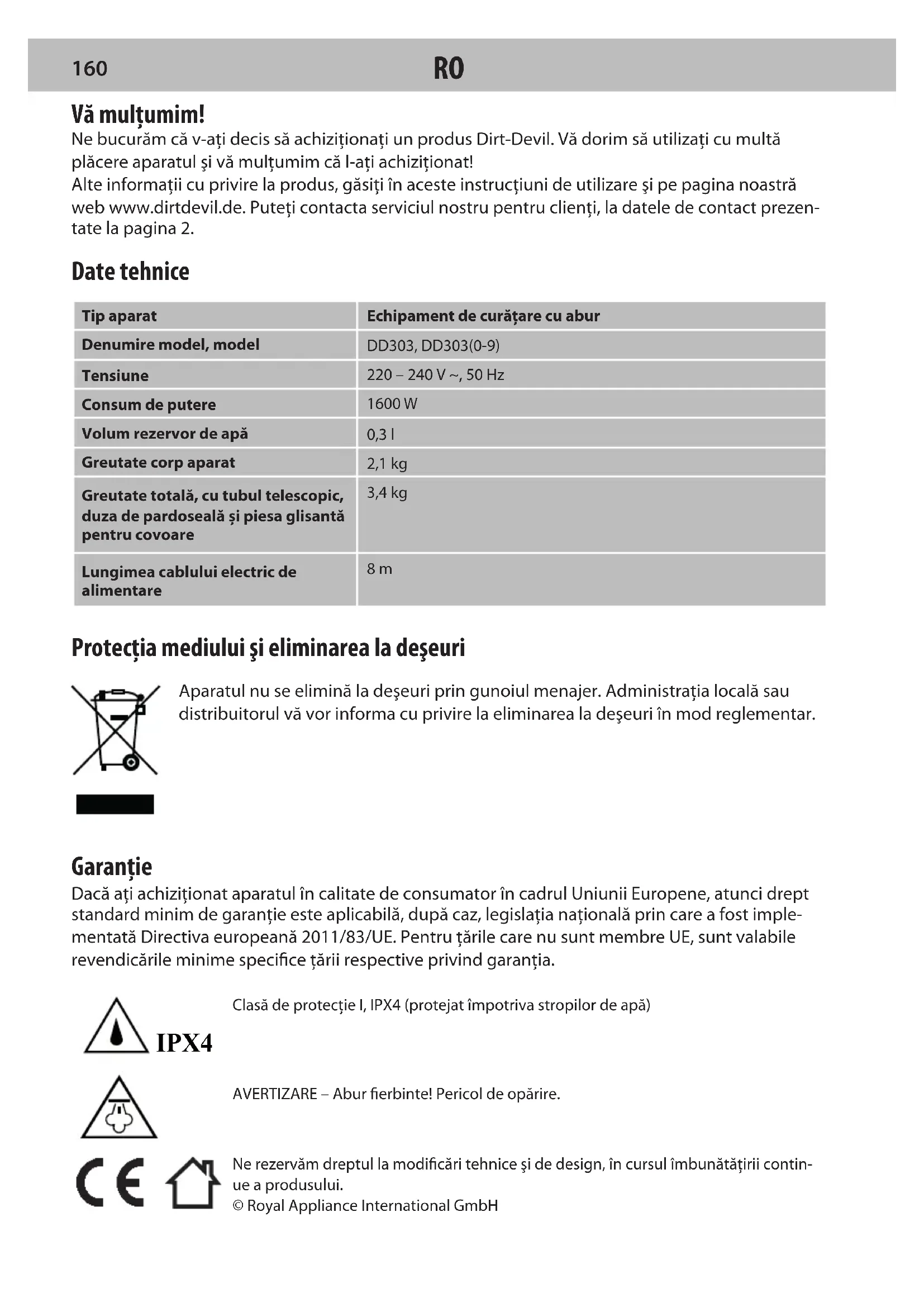 159IPX4 Protecţia mediului şi eliminarea la deşeuri Aparatul nu se elimină la deşeuri prin gunoiul menajer. Administraţia locală sau distribuitorul vă vor informa cu privire la eliminarea la deşeuri în mod reglementar. Garanţie Dacă aţi achiziţionat aparatul în calitate de consumator în cadrul Uniunii Europene, atunci drept standard minim de garanţie este aplicabilă, după caz, legislaţia naţională prin care a fost imple- mentată Directiva europeană 2011/83/UE. Pentru ţările care nu sunt membre UE, sunt valabile revendicările minime specice ţării respective privind garanţia. Ne rezervăm dreptul la modicări tehnice şi de design, în cursul îmbunătăţirii contin-ue a produsului.© Royal Appliance International GmbH Vă mulţumim! Ne bucurăm că v-aţi decis să achiziţionaţi un produs Dirt-Devil. Vă dorim să utilizaţi cu multă plăcere aparatul şi vă mulţumim că l-aţi achiziţionat! Alte informaţii cu privire la produs, găsiţi în aceste instrucţiuni de utilizare şi pe pagina noastră web www.dirtdevil.de. Puteţi contacta serviciul nostru pentru clienţi, la datele de contact prezen- tate la pagina 2. Date tehnice Tip aparatEchipament de curăţare cu aburDenumire model, modelDD303, DD303(0-9)Tensiune220 – 240 V ~, 50 HzConsum de putere1600 WVolum rezervor de apă0,3 lGreutate corp aparat2,1 kgGreutate totală, cu tubul telescopic, duza de pardoseală și piesa glisantă pentru covoare3,4 kgLungimea cablului electric de alimentare 8 m AVERTIZARE – Abur erbinte! Pericol de opărire.Clasă de protecţie I, IPX4 (protejat împotriva stropilor de apă)