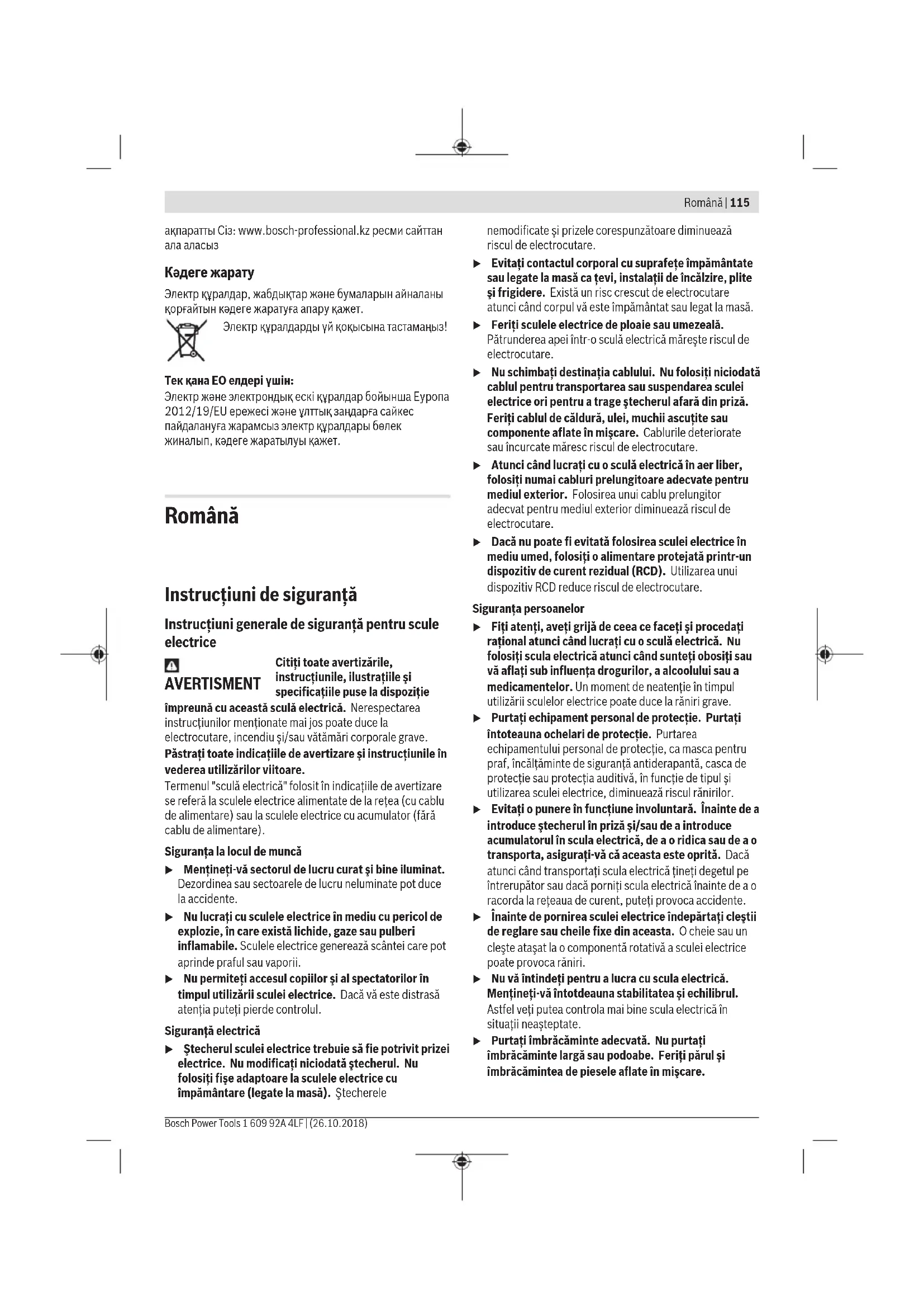 Кәдеге жарату Электр құралдар, жабдықтар және бумаларын айналаны қорғайтын кәдеге жаратуға апару қажет. Электр құралдарды үй қоқысына тастамаңыз! Тек қана ЕО елдері үшін: Электр және электрондық ескі құралдар бойынша Еуропа 2012/19/EU ережесі және ұлттық заңдарға сайкес пайдалануға жарамсыз электр құралдары бөлек жиналып, кәдеге жаратылуы қажет. Română Instrucţiuni de siguranţă Instrucţiuni generale de siguranţă pentru scule electrice AVERTISMENT Citiţi toate avertizările, instrucţiunile, ilustraţiile şi specificaţiile puse la dispoziţie împreună cu această sculă electrică. Nerespectarea instrucţiunilor menţionate mai jos poate duce la electrocutare, incendiu şi/sau vătămări corporale grave. Păstraţi toate indicaţiile de avertizare şi instrucţiunile în vederea utilizărilor viitoare. Termenul "sculă electrică" folosit în indicaţiile de avertizare se referă la sculele electrice alimentate de la reţea (cu cablu de alimentare) sau la sculele electrice cu acumulator (fără cablu de alimentare). Siguranţa la locul de muncă u Menţineţi‑vă sectorul de lucru curat şi bine iluminat. Dezordinea sau sectoarele de lucru neluminate pot duce la accidente. u Nu lucraţi cu sculele electrice în mediu cu pericol de explozie, în care există lichide, gaze sau pulberi inflamabile. Sculele electrice generează scântei care pot aprinde praful sau vaporii. u Nu permiteţi accesul copiilor şi al spectatorilor în timpul utilizării sculei electrice. Dacă vă este distrasă atenţia puteţi pierde controlul. Siguranţă electrică u Ştecherul sculei electrice trebuie să fie potrivit prizei electrice. Nu modificaţi niciodată ştecherul. Nu folosiţi fişe adaptoare la sculele electrice cu împământare (legate la masă). Ştecherele nemodificate şi prizele corespunzătoare diminuează riscul de electrocutare. u Evitaţi contactul corporal cu suprafeţe împământate sau legate la masă ca ţevi, instalaţii de încălzire, plite şi frigidere. Există un risc crescut de electrocutare atunci când corpul vă este împământat sau legat la masă. u Feriţi sculele electrice de ploaie sau umezeală. Pătrunderea apei într‑o sculă electrică măreşte riscul de electrocutare. u Nu schimbaţi destinaţia cablului. Nu folosiţi niciodată cablul pentru transportarea sau suspendarea sculei electrice ori pentru a trage ştecherul afară din priză. Feriţi cablul de căldură, ulei, muchii ascuţite sau componente aflate în mişcare. Cablurile deteriorate sau încurcate măresc riscul de electrocutare. u Atunci când lucraţi cu o sculă electrică în aer liber, folosiţi numai cabluri prelungitoare adecvate pentru mediul exterior. Folosirea unui cablu prelungitor adecvat pentru mediul exterior diminuează riscul de electrocutare. u Dacă nu poate fi evitată folosirea sculei electrice în mediu umed, folosiţi o alimentare protejată printr-un dispozitiv de curent rezidual (RCD). Utilizarea unui dispozitiv RCD reduce riscul de electrocutare. Siguranţa persoanelor u Fiţi atenţi, aveţi grijă de ceea ce faceţi şi procedaţi raţional atunci când lucraţi cu o sculă electrică. Nu folosiţi scula electrică atunci când sunteţi obosiţi sau vă aflaţi sub influenţa drogurilor, a alcoolului sau a medicamentelor. Un moment de neatenţie în timpul utilizării sculelor electrice poate duce la răniri grave. u Purtaţi echipament personal de protecţie. Purtaţi întoteauna ochelari de protecţie. Purtarea echipamentului personal de protecţie, ca masca pentru praf, încălţăminte de siguranţă antiderapantă, casca de protecţie sau protecţia auditivă, în funcţie de tipul şi utilizarea sculei electrice, diminuează riscul rănirilor. u Evitaţi o punere în funcţiune involuntară. Înainte de a introduce ştecherul în priză şi/sau de a introduce acumulatorul în scula electrică, de a o ridica sau de a o transporta, asiguraţi‑vă că aceasta este oprită. Dacă atunci când transportaţi scula electrică ţineţi degetul pe întrerupător sau dacă porniţi scula electrică înainte de a o racorda la reţeaua de curent, puteţi provoca accidente. u Înainte de pornirea sculei electrice îndepărtaţi cleştii de reglare sau cheile fixe din aceasta. O cheie sau un cleşte ataşat la o componentă rotativă a sculei electrice poate provoca răniri. u Nu vă întindeţi pentru a lucra cu scula electrică. Menţineţi-vă întotdeauna stabilitatea şi echilibrul. Astfel veţi putea controla mai bine scula electrică în situaţii neaşteptate. u Purtaţi îmbrăcăminte adecvată. Nu purtaţi îmbrăcăminte largă sau podoabe. Feriţi părul şi îmbrăcămintea de piesele aflate în mişcare. Română | 115 Bosch Power Tools 1 609 92A 4LF | (26.10.2018)116 | Română 1 609 92A 4LF | (26.10.2018) Bosch Power Tools Îmbrăcămintea largă, părul lung sau podoabele pot fi prinse în piesele aflate în mişcare. u Dacă pot fi montate echipamente de aspirare şi colectare a prafului, asiguraţi‑vă că acestea sunt racordate şi folosite în mod corect. Folosirea unei instalaţii de aspirare a prafului poate duce la reducerea poluării cu praf. u Nu vă lăsaţi amăgiţi de uşurinţa în operare dobândită în urma folosirii frecvente a sculelor electrice şi nu ignoraţi principiile de siguranţă ale acestora. Neglijenţa poate provoca, într-o fracţiune de secundă, vătămări corporale grave. Utilizarea şi manevrarea atentă a sculelor electrice u Nu suprasolicitaţi scula electrică. Folosiţi pentru executarea lucrării dv. scula electrică destinată acelui scop. Cu scula electrică potrivită lucraţi mai bine şi mai sigur în domeniul de pu