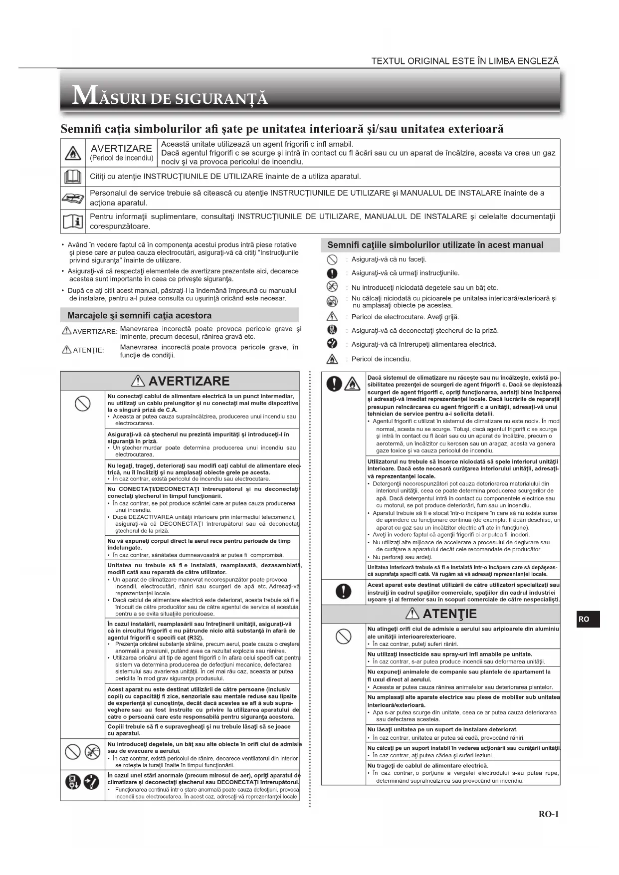 Semnifi caţia simbolurilor afi şate pe unitatea interioară şi/sau unitatea exterioară AVERTIZARE (Pericol de incendiu)Această unitate utilizează un agent frigorifi c infl amabil.Dacă agentul frigorifi c se scurge şi intră în contact cu fl ăcări sau cu un aparat de încălzire, acesta va crea un gaz nociv şi va provoca pericolul de incendiu.Citiţi cu atenţie INSTRUCŢIUNILE DE UTILIZARE înainte de a utiliza aparatul.Personalul de service trebuie să citească cu atenţie INSTRUCŢIUNILE DE UTILIZARE şi MANUALUL DE INSTALARE înainte de a acţiona aparatul. Pentru informaţii suplimentare, consultaţi INSTRUCŢIUNILE DE UTILIZARE, MANUALUL DE INSTALARE şi celelalte documentaţii corespunzătoare. AVERTIZARE Nu conectaţi cablul de alimentare electrică la un punct intermediar, nu utilizaţi un cablu prelungitor şi nu conectaţi mai multe dispozitive la o singură priză de C.A.• Aceasta ar putea cauza supraîncălzirea, producerea unui incendiu sau electrocutarea.Asiguraţi-vă că ştecherul nu prezintă impurităţi şi introduceţi-l în siguranţă în priză.• Un ştecher murdar poate determina producerea unui incendiu sau electrocutarea.Nu legaţi, trageţi, deterioraţi sau modifi caţi cablul de alimentare elec-trică, nu îl încălziţi şi nu amplasaţi obiecte grele pe acesta.• În caz contrar, există pericolul de incendiu sau electrocutare.Nu CONECTAŢI/DECONECTAŢI întrerupătorul şi nu deconectaţi/conectaţi ştecherul în timpul funcţionării.• În caz contrar, se pot produce scântei care ar putea cauza producerea unui incendiu.• După DEZACTIVAREA unităţii interioare prin intermediul telecomenzii, asiguraţi-vă că DECONECTAŢI întrerupătorul sau că deconectaţi ştecherul de la priză. Nu vă expuneţi corpul direct la aerul rece pentru perioade de timp îndelungate.• În caz contrar, sănătatea dumneavoastră ar putea fi compromisă.Unitatea nu trebuie să fi e instalată, reamplasată, dezasamblată, modifi cată sau reparată de către utilizator.• Un aparat de climatizare manevrat necorespunzător poate provoca incendii, electrocutări, răniri sau scurgeri de apă etc. Adresaţi-vă reprezentanţei locale.• Dacă cablul de alimentare electrică este deteriorat, acesta trebuie să fi e înlocuit de către producător sau de către agentul de service al acestuia, pentru a se evita situaţiile periculoase.În cazul instalării, reamplasării sau întreținerii unităţii, asiguraţi-vă că în circuitul frigorifi c nu pătrunde nicio altă substanţă în afară de agentul frigorifi c specifi cat (R32). Prezenţa oricărei substanţe străine, precum aerul, poate cauza o creştere anormală a presiunii, putând avea ca rezultat explozia sau rănirea.• Utilizarea oricărui alt tip de agent frigorifi c în afara celui specifi cat pentru sistem va determina producerea de defecţiuni mecanice, defectarea sistemului sau avarierea unităţii. În cel mai rău caz, aceasta ar putea periclita în mod grav siguranţa produsului.Acest aparat nu este destinat utilizării de către persoane (inclusiv copii) cu capacităţi fi zice, senzoriale sau mentale reduse sau lipsite de experienţă şi cunoştinţe, decât dacă acestea se afl ă sub supra-veghere sau au fost instruite cu privire la utilizarea aparatului de către o persoană care este responsabilă pentru siguranţa acestora.Copiii trebuie să fi e supravegheaţi şi nu trebuie lăsaţi să se joace cu aparatul. Nu introduceţi degetele, un băţ sau alte obiecte în orifi ciul de admisie sau de evacuare a aerului.• În caz contrar, există pericolul de rănire, deoarece ventilatorul din interior se roteşte la turaţii înalte în timpul funcţionării. În cazul unei stări anormale (precum mirosul de aer), opriţi aparatul de climatizare şi deconectaţi ştecherul sau DECONECTAŢI întrerupătorul. Funcţionarea continuă într-o stare anormală poate cauza defecţiuni, provoca incendii sau electrocutarea. În acest caz, adresaţi-vă reprezentanţei locale