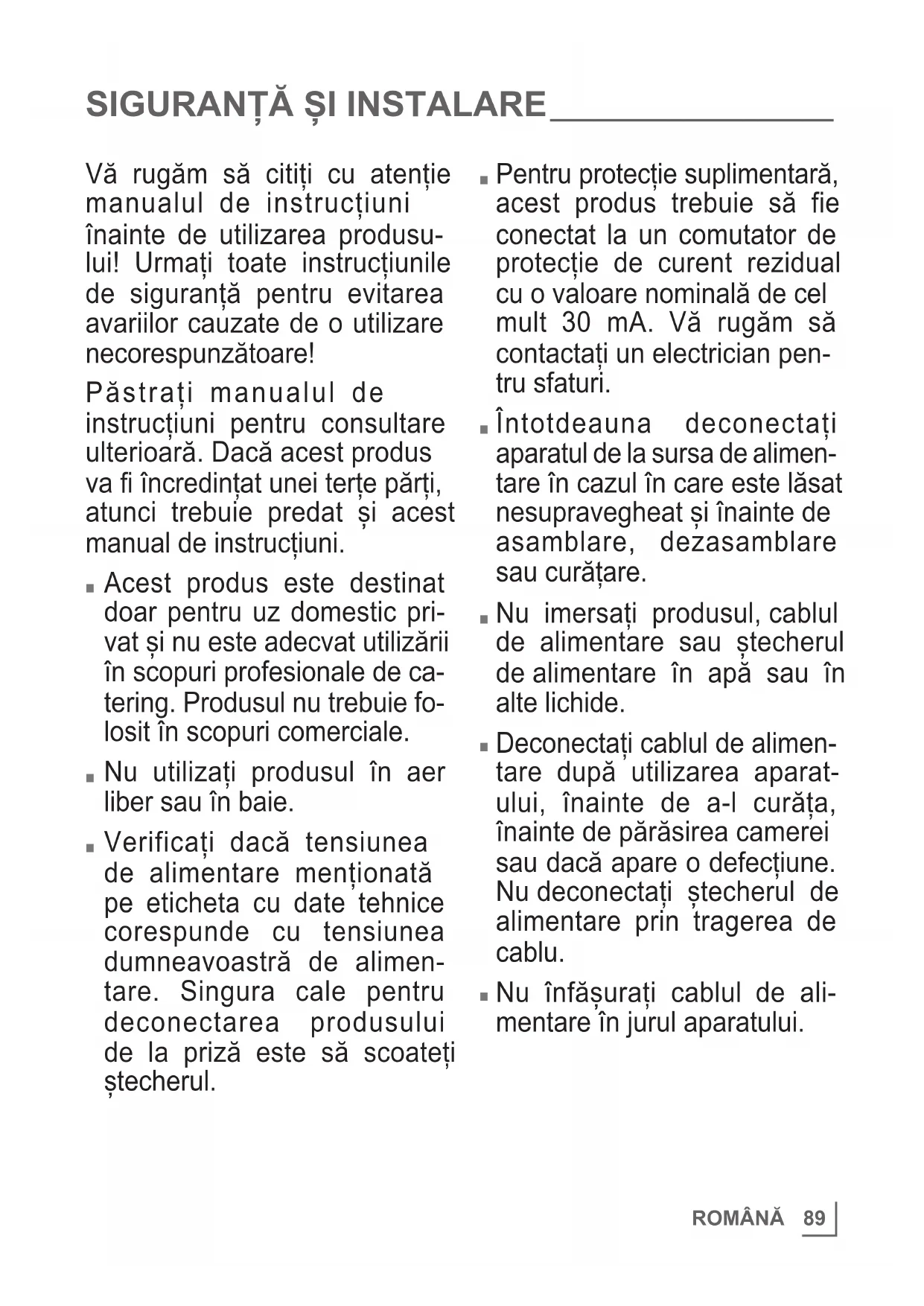 Pentru protecție suplimentară, acest produs trebuie să fie conectat la un comutator de protecție de curent rezidual cu o valoare nominală de cel mult 30 mA. Vă rugăm să contactați un electrician pen- tru sfaturi.
