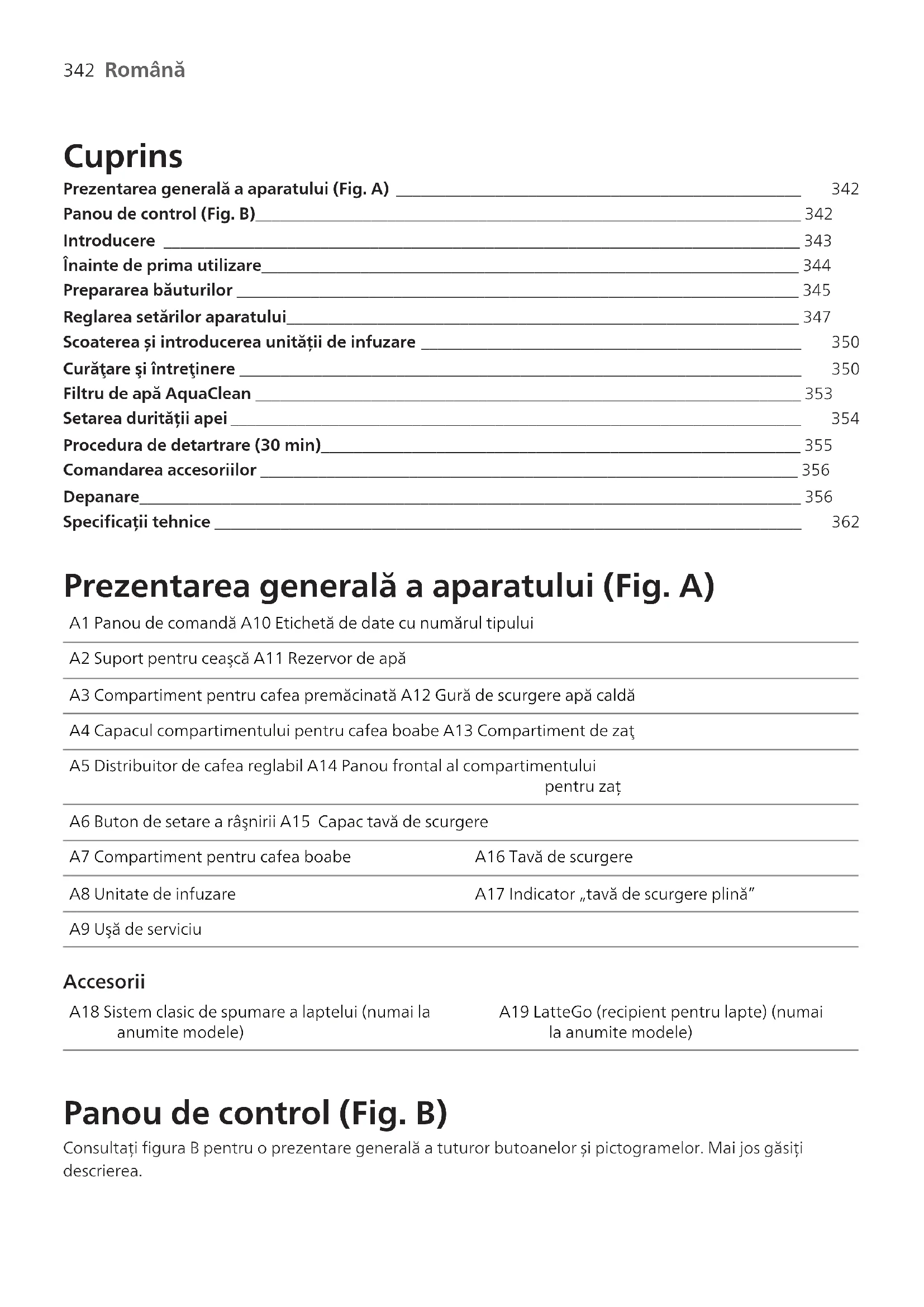 Română Română Cuprins Prezentarea generală a aparatului (Fig. A) _________________________________________________ 342 Panou de control (Fig. B)__________________________________________________________________ 342Introducere _____________________________________________________________________________ 343Înainte de prima utilizare_________________________________________________________________ 344Prepararea băuturilor ____________________________________________________________________ 345Reglarea setărilor aparatului______________________________________________________________ 347 Scoaterea și introducerea unității de infuzare ______________________________________________ 350 Curăţare şi întreţinere ____________________________________________________________________ 350 Filtru de apă AquaClean __________________________________________________________________ 353 Setarea durității apei _____________________________________________________________________ 354 Procedura de detartrare (30 min)__________________________________________________________ 355Comandarea accesoriilor _________________________________________________________________ 356Depanare________________________________________________________________________________ 356 Specificații tehnice _______________________________________________________________________ 362 Prezentarea generală a aparatului (Fig. A) A1 Panou de comandă A10 Etichetă de date cu numărul tipuluiA2 Suport pentru ceaşcă A11 Rezervor de apăA3 Compartiment pentru cafea premăcinată A12 Gură de scurgere apă caldăA4 Capacul compartimentului pentru cafea boabe A13 Compartiment de zaţA5 Distribuitor de cafea reglabil A14 Panou frontal al compartimentuluipentru zațA6 Buton de setare a râşnirii A15 Capac tavă de scurgereA7 Compartiment pentru cafea boabe A16 Tavă de scurgereA8 Unitate de infuzare A17 Indicator „tavă de scurgere plină”A9 Uşă de serviciu Accesorii A18 Sistem clasic de spumare a laptelui (numai laanumite modele)A19 LatteGo (recipient pentru lapte) (numaila anumite modele) Panou de control (Fig. B) Consultați figura B pentru o prezentare generală a tuturor butoanelor și pictogramelor. Mai jos găsițidescrierea.343 Română Română Unele dintre butoane/pictograme sunt doar pentru tipuri specifice. B1 Buton de pornire/oprire B7 Pictograme avertismente B2 Pictograme băutură* B8 Led de pornire B3 Pictogramă intensitate aromă/cafea pre-măcinată B9 Buton Start/stop B4 Pictogramă cantitate băutură B10 Pictogramă detartrare/curățare B5 Pictogramă cantitate lapte (numai la anumite modele) B11 Pictogramă AquaClean B6 Pictogramă temperatură cafea (numai la anumite modele)
