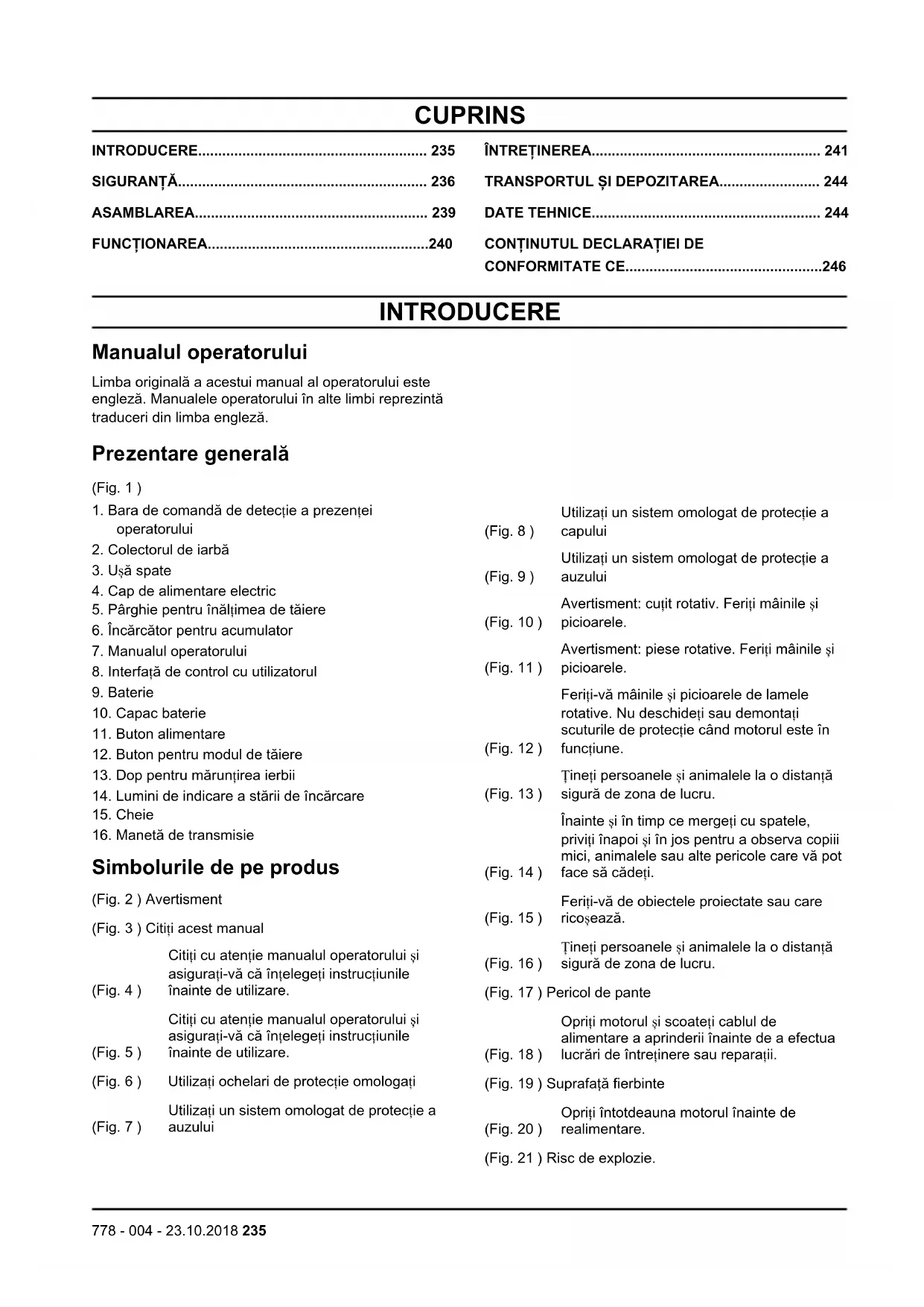 CONFORMITATE CE.................................................246 INTRODUCERE Manualul operatorului Limba originală a acestui manual al operatorului este engleză. Manualele operatorului în alte limbi reprezintă traduceri din limba engleză. Prezentare generală (Fig. 1 )