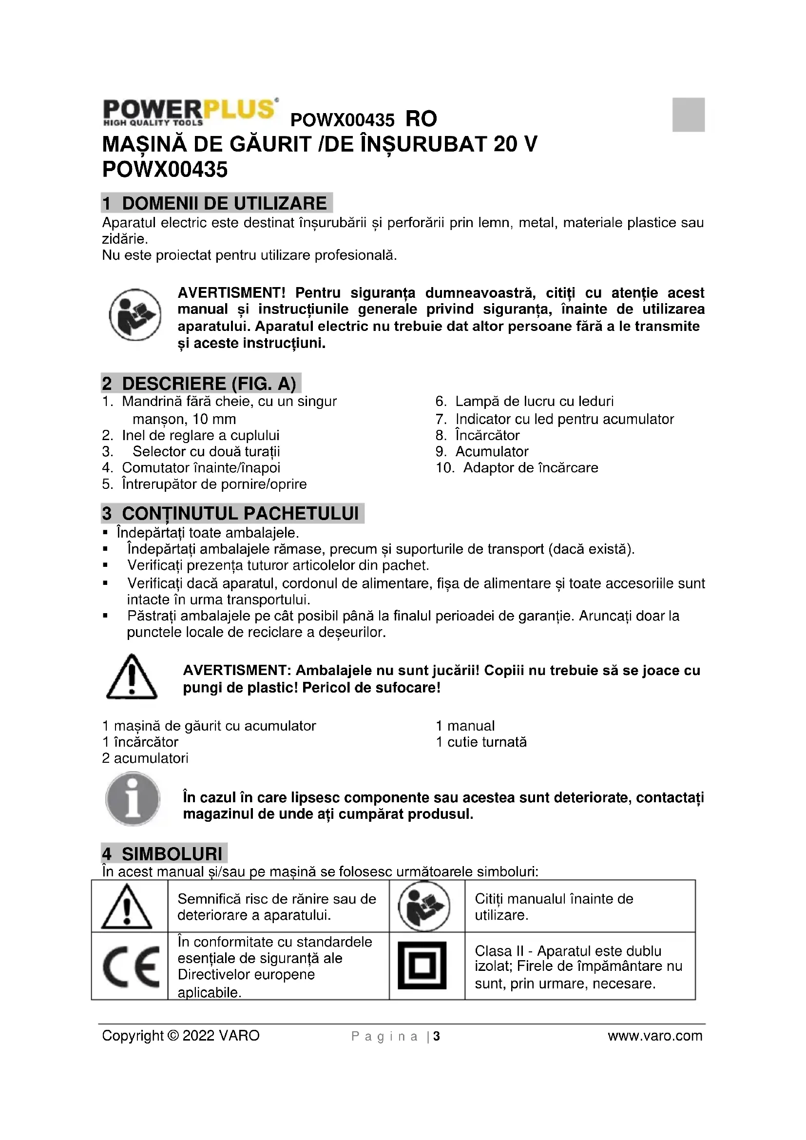 Clasa II - Aparatul este dublu izolat; Firele de împământare nu sunt, prin urmare, necesare.POWX00435 RO Copyright © 2022 VARO P a g i n a | 4 www.varo.com