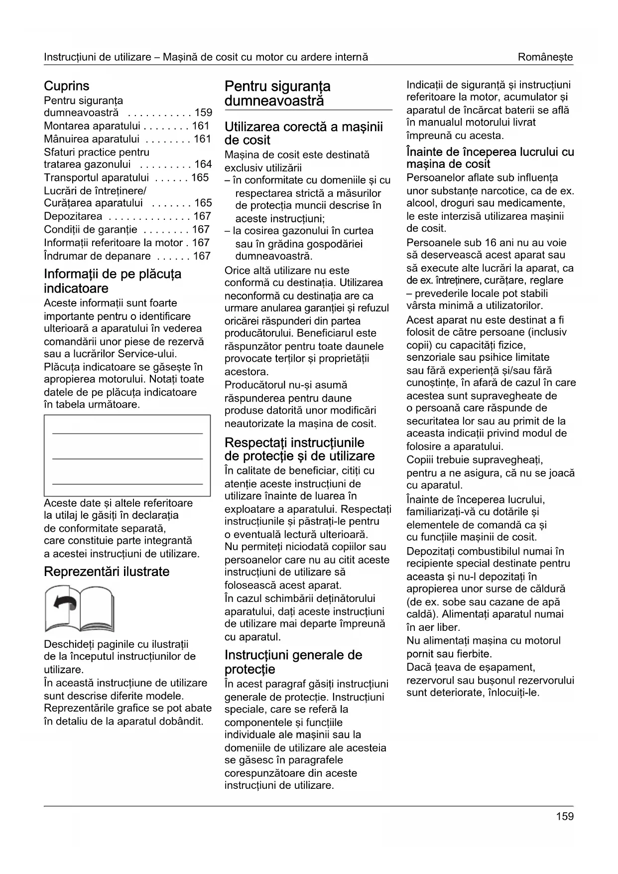 - Informaţii referitoare la motor . 167 Îndrumar de depanare Informaţii de pe plăcuţa indicatoare Aceste informaţii sunt foarte importante pentru o identificare ulterioară a aparatului în vederea comandării unor piese de rezervă sau a lucrărilor Service-ului. Plăcuţa indicatoare se găseşte în apropierea motorului. Notaţi toate datele de pe plăcuţa indicatoare în tabela următoare. Aceste date şi altele referitoare la utilaj le găsiţi în declaraţia de conformitate separată, care constituie parte integrantă a acestei instrucţiuni de utilizare. Reprezentări ilustrate Deschideţi paginile cu ilustraţii de la începutul instrucţiunilor de utilizare. În această instrucţiune de utilizare sunt descrise diferite modele. Reprezentările grafice se pot abate în detaliu de la aparatul dobândit. Pentru siguranţa dumneavoastră Utilizarea corectă a maşinii de cosit Maşina de cosit este destinată exclusiv utilizării – în conformitate cu domeniile şi cu respectarea strictă a măsurilor de protecţia muncii descrise în aceste instrucţiuni; – la cosirea gazonului în curtea sau în grădina gospodăriei dumneavoastră. Orice altă utilizare nu este conformă cu destinaţia. Utilizarea neconformă cu destinaţia are ca urmare anularea garanţiei şi refuzul oricărei răspunderi din partea producătorului. Beneficiarul este răspunzător pentru toate daunele provocate terţilor şi proprietăţii acestora. Producătorul nu-şi asumă răspunderea pentru daune produse datorită unor modificări neautorizate la maşina de cosit. Respectaţi instrucţiunile de protecţie şi de utilizare În calitate de beneficiar, citiţi cu atenţie aceste instrucţiuni de utilizare înainte de luarea în exploatare a aparatului. Respectaţi instrucţiunile şi păstraţi-le pentru o eventuală lectură ulterioară. Nu permiteţi niciodată copiilor sau persoanelor care nu au citit aceste instrucţiuni de utilizare să folosească acest aparat. În cazul schimbării deţinătorului aparatului, daţi aceste instrucţiuni de utilizare mai departe împreună cu aparatul. Instrucţiuni generale de protecţie În acest paragraf găsiţi instrucţiuni generale de protecţie. Instrucţiuni speciale, care se referă la componentele şi funcţiile individuale ale maşinii sau la domeniile de utilizare ale acesteia se găsesc în paragrafele corespunzătoare din aceste instrucţiuni de utilizare. Indicaţii de siguranţă şi instrucţiuni referitoare la motor, acumulator şi aparatul de încărcat baterii se află în manualul motorului livrat împreună cu acesta. Înainte de începerea lucrului cu maşina de cosit Persoanelor aflate sub influenţa unor substanţe narcotice, ca de ex. alcool, droguri sau medicamente, le este interzisă utilizarea maşinii de cosit. Persoanele sub 16 ani nu au voie să deservească acest aparat sau să execute alte lucrări la aparat, ca de ex. întreţinere, curăţare, reglare – prevederile locale pot stabili vârsta minimă a utilizatorilor. Acest aparat nu este destinat a fi folosit de către persoane (inclusiv copii) cu capacităţi fizice, senzoriale sau psihice limitate sau fără experienţă şi/sau fără cunoştinţe, în afară de cazul în care acestea sunt supravegheate de o persoană care răspunde de securitatea lor sau au primit de la aceasta indicaţii privind modul de folosire a aparatului. Copiii trebuie supravegheaţi, pentru a ne asigura, că nu se joacă cu aparatul. Înainte de începerea lucrului, familiarizaţi-vă cu dotările şi elementele de comandă ca şi cu funcţiile maşinii de cosit. Depozitaţi combustibilul numai în recipiente special destinate pentru aceasta şi nu-l depozitaţi în apropierea unor surse de căldură (de ex. sobe sau cazane de apă caldă). Alimentaţi aparatul numai în aer liber. Nu alimentaţi maşina cu motorul pornit sau fierbite. Dacă ţeava de eşapament, rezervorul sau buşonul rezervorului sunt deteriorate, înlocuiţi-le.Româneşte Instrucţiuni de utilizare Maşină de cosit cu motor cu ardere internă p. 167