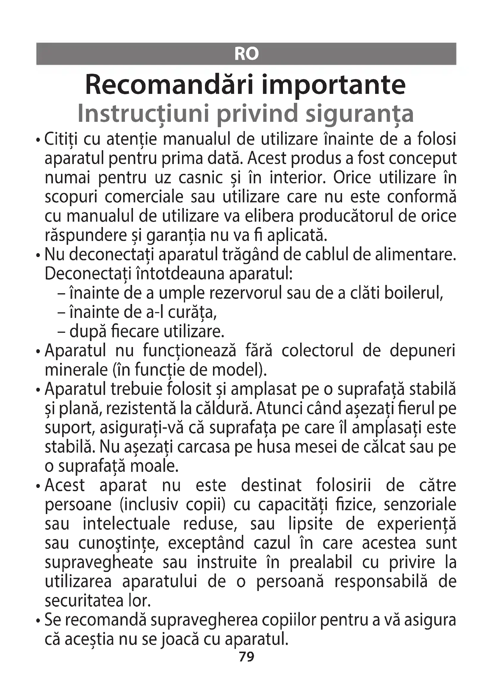 - Acest aparat poate folosit de către copii cu vârsta peste 8 ani și de către persoane lipsite de experiență sau cunoștințe, sau cu capacități zice, senzoriale sau intelectuale reduse, dacă acestea sunt supravegheate sau instruite în prealabil cu privire la utilizarea aparatului în deplină siguranță și cunosc riscurile asociate. Copiii nu trebuie să se joace cu aparatul. Copiii nu trebuie să curățe sau să întrețină aparatul nesupravegheați. Nu lăsați la îndemâna copiilor cu vârsta sub 8 ani erul de călcat și cordonul de alimentare, atunci când erul de călcat este alimentat electric sau în curs de răcire.