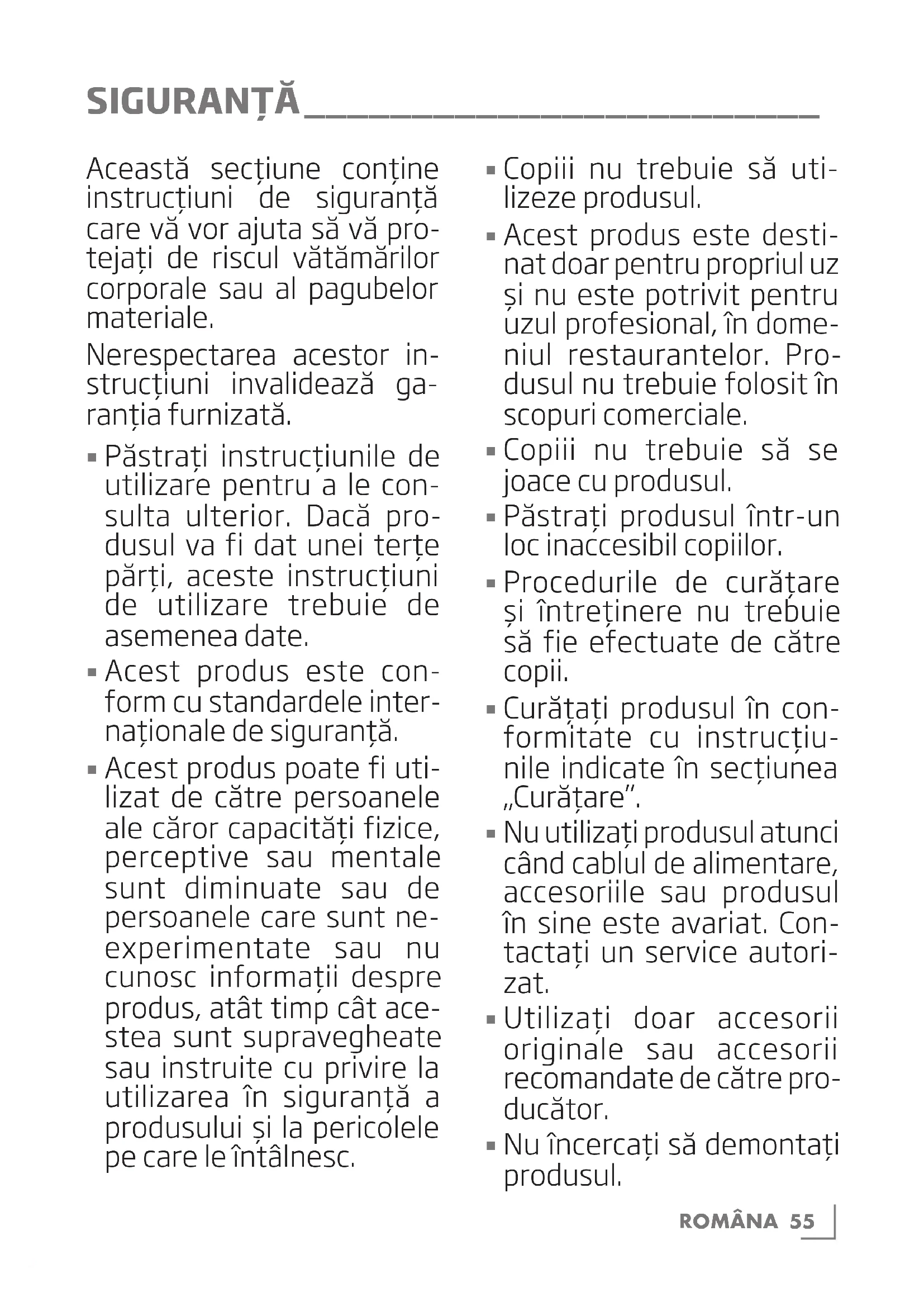 Această secțiune conține instrucțiuni de siguranță care vă vor ajuta să vă pro- tejați de riscul vătămărilor corporale sau al pagubelor materiale. Nerespectarea acestor in- strucțiuni invalidează ga- ranția furnizată.