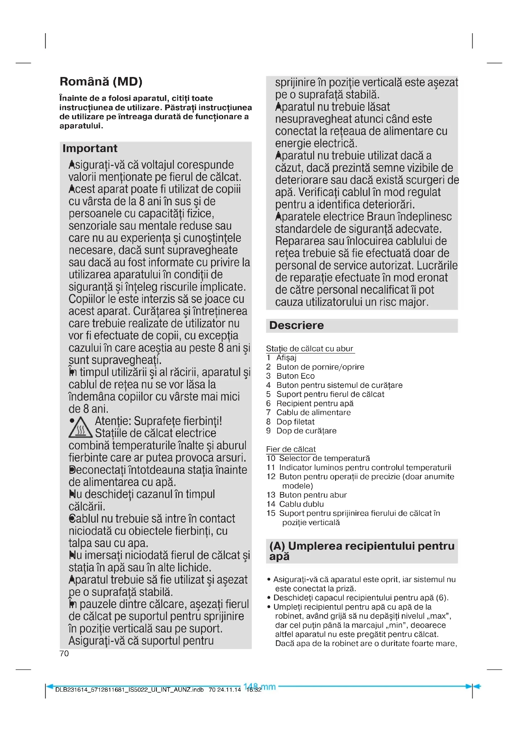 DLB231614_5712811681_IS5022_UI_INT_AUNZ.indb 69 24.11.14 16:32Română (MD) Înainte de a folosi aparatul, citiţi toate instrucţiunea de utilizare. Păstraţi instrucţiunea de utilizare pe întreaga durată de funcţionare a aparatului. Important